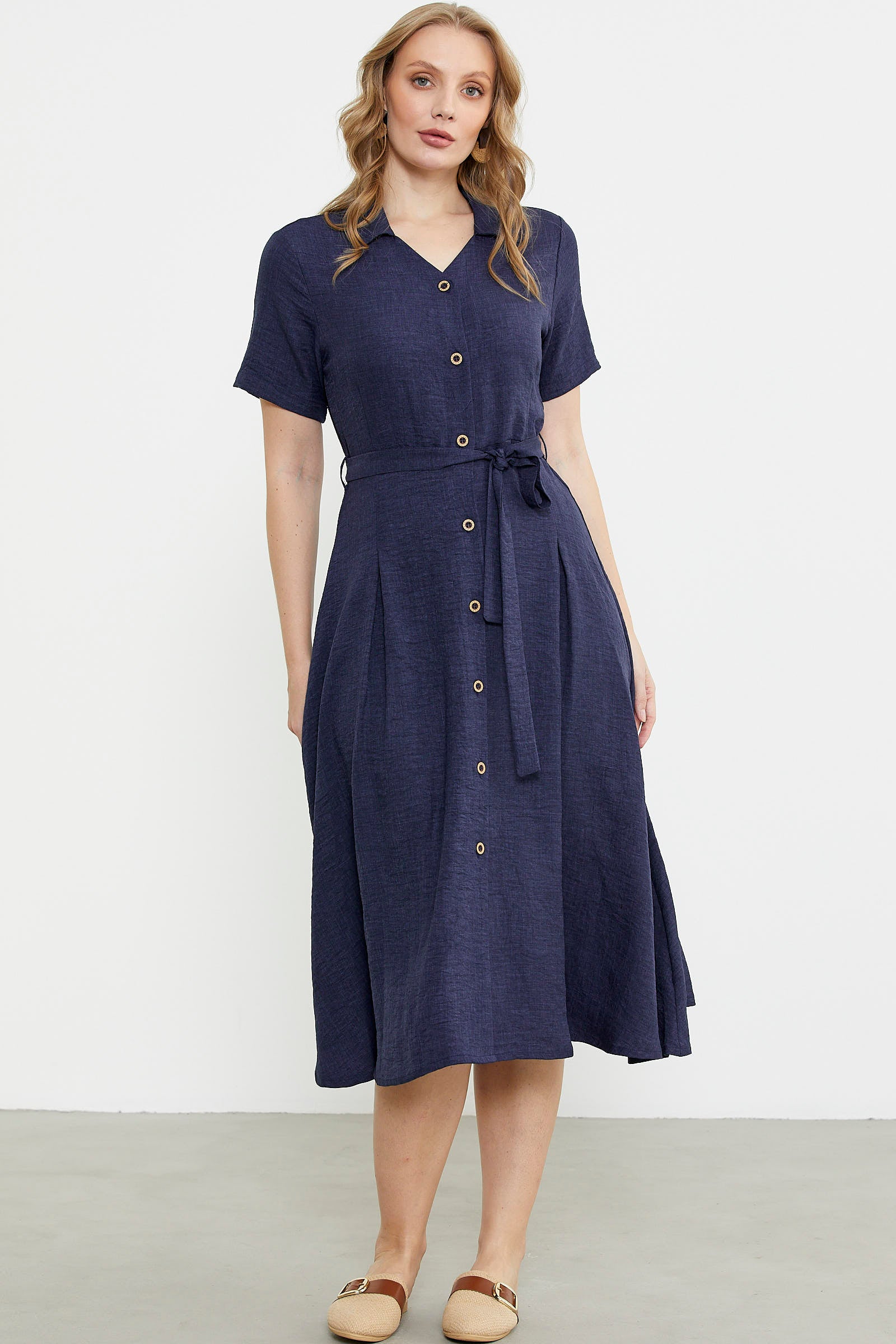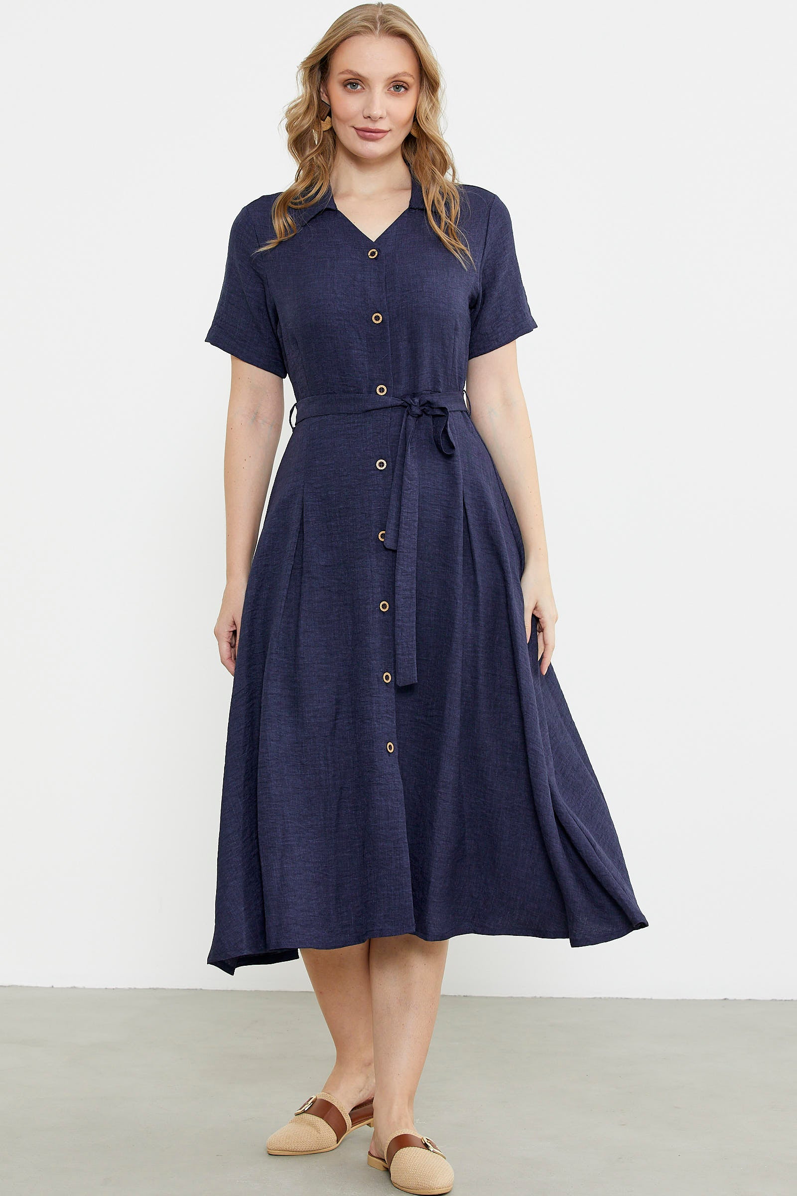 Viskoz dokuma kumaştan, yakalı, önü tamamen düğmeli,beli çıkarılabilir kuşaklı uzun elbise. Kısa kol ve astarsızdır.