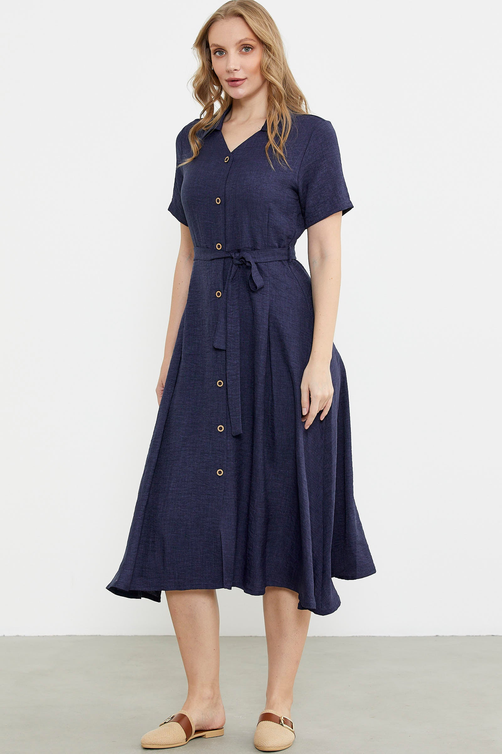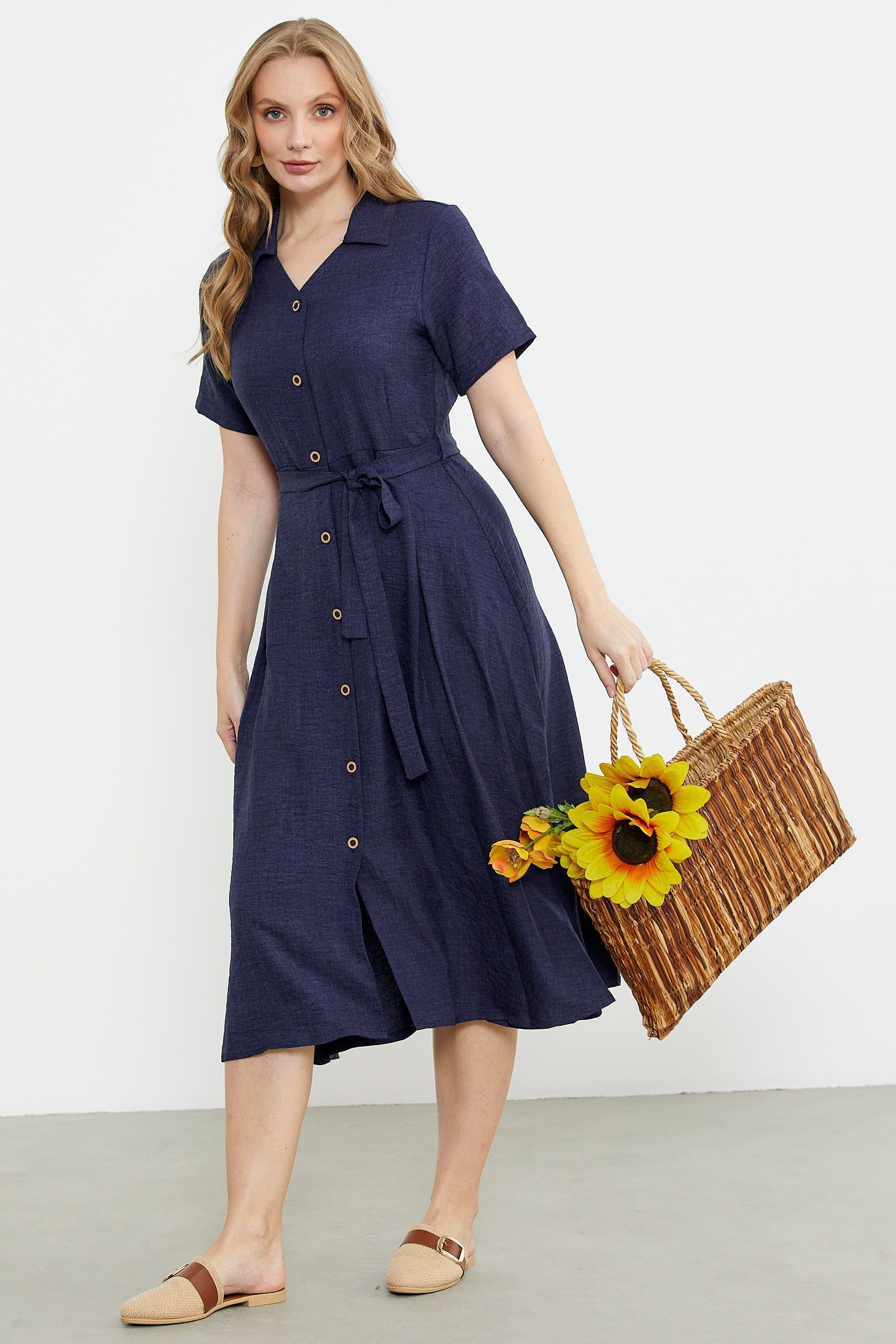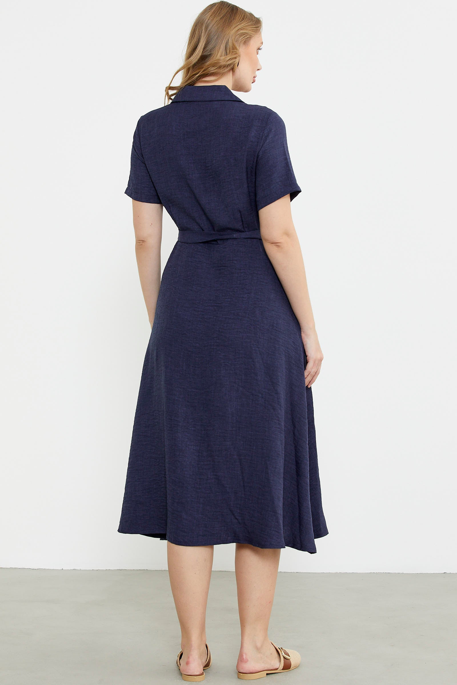Keten Görünümlü Uzun Gömlek Elbise - Lacivert