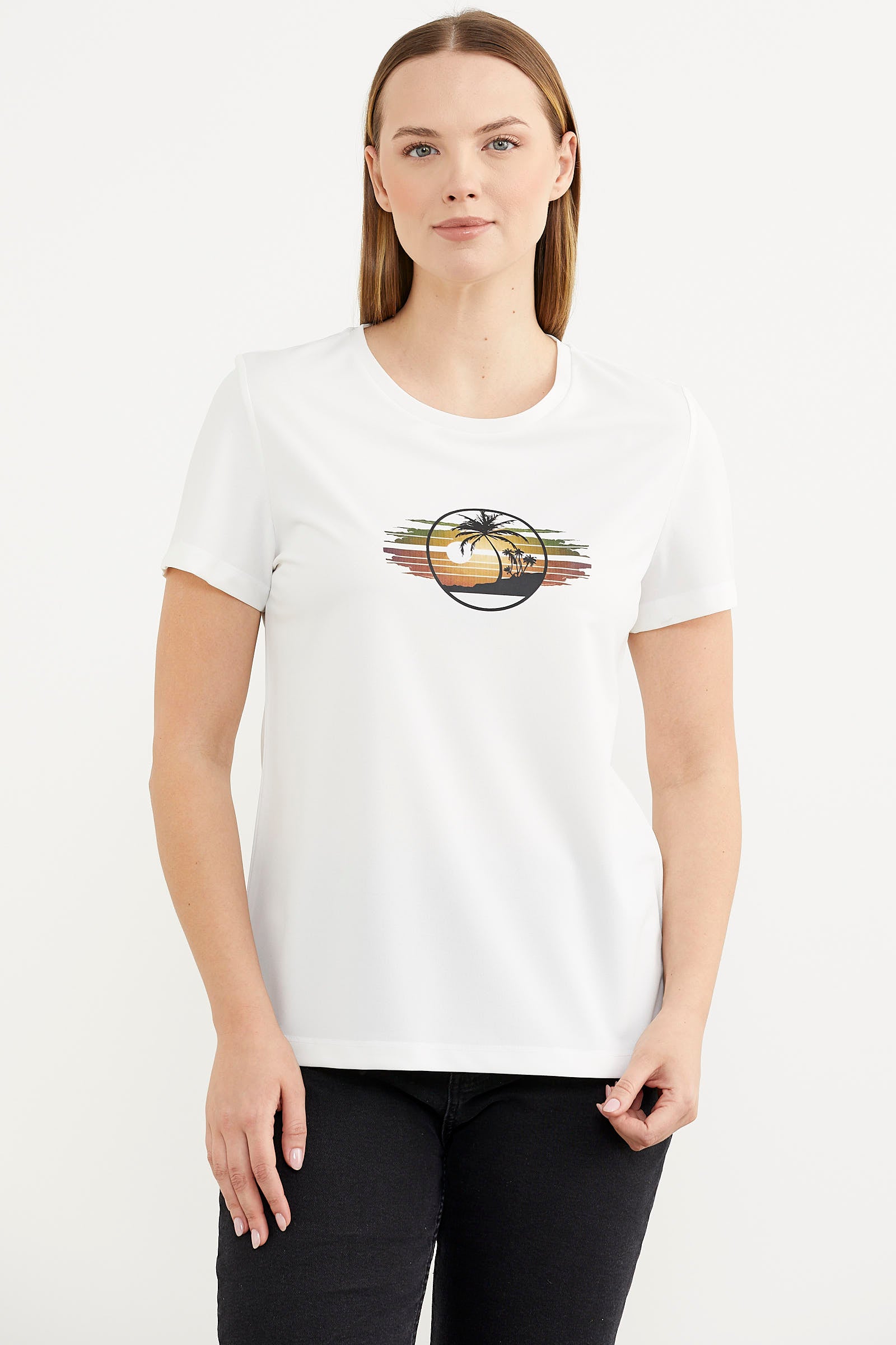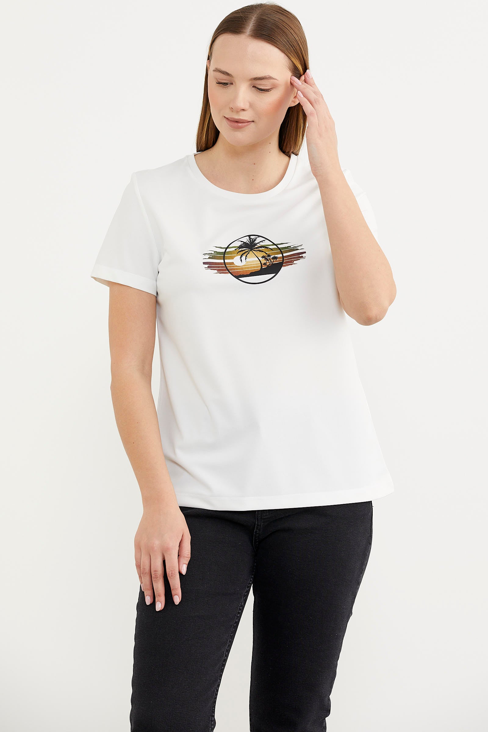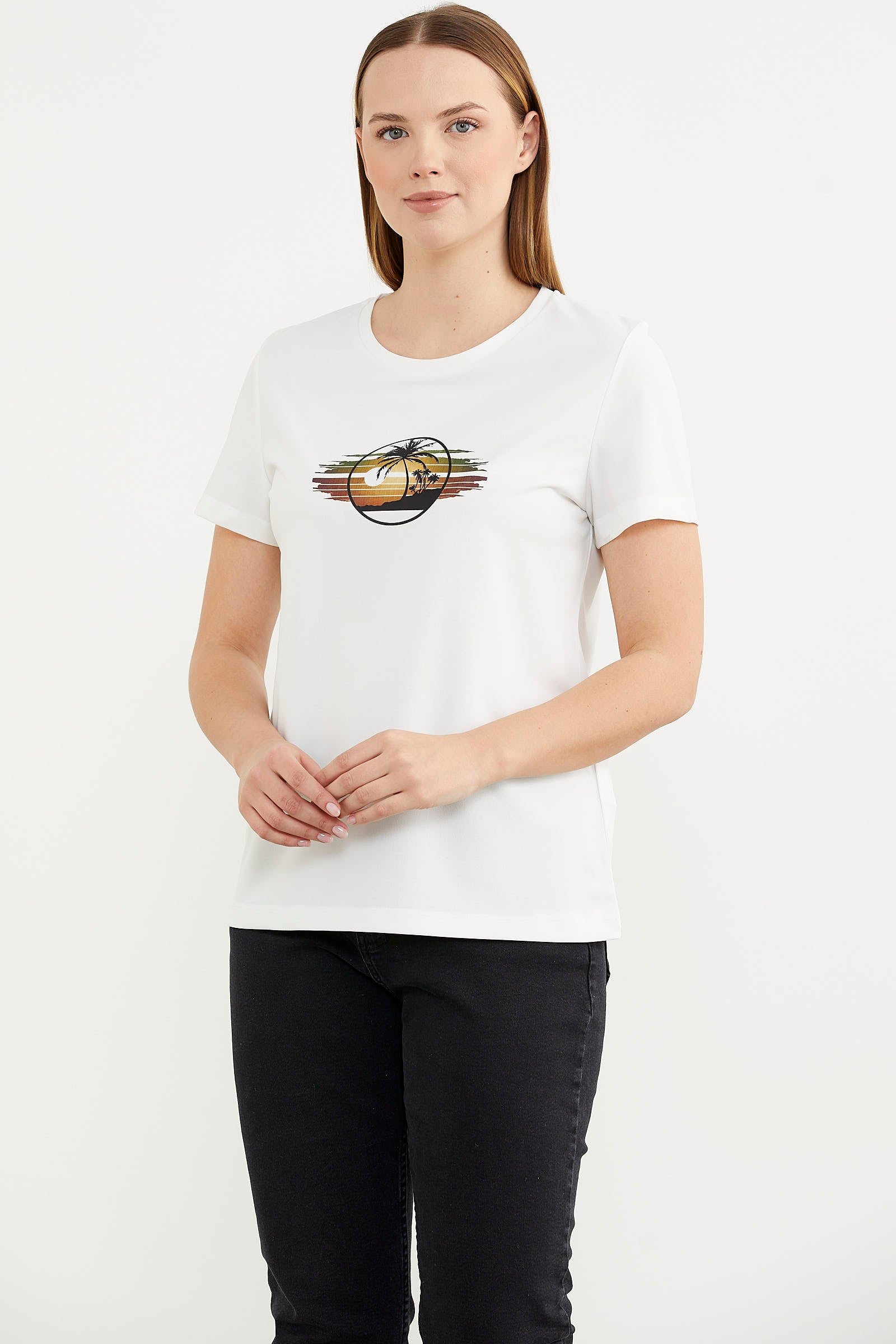 Kısa Kol Baskılı Basic Tişört - Ekru