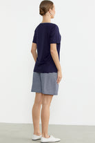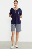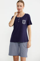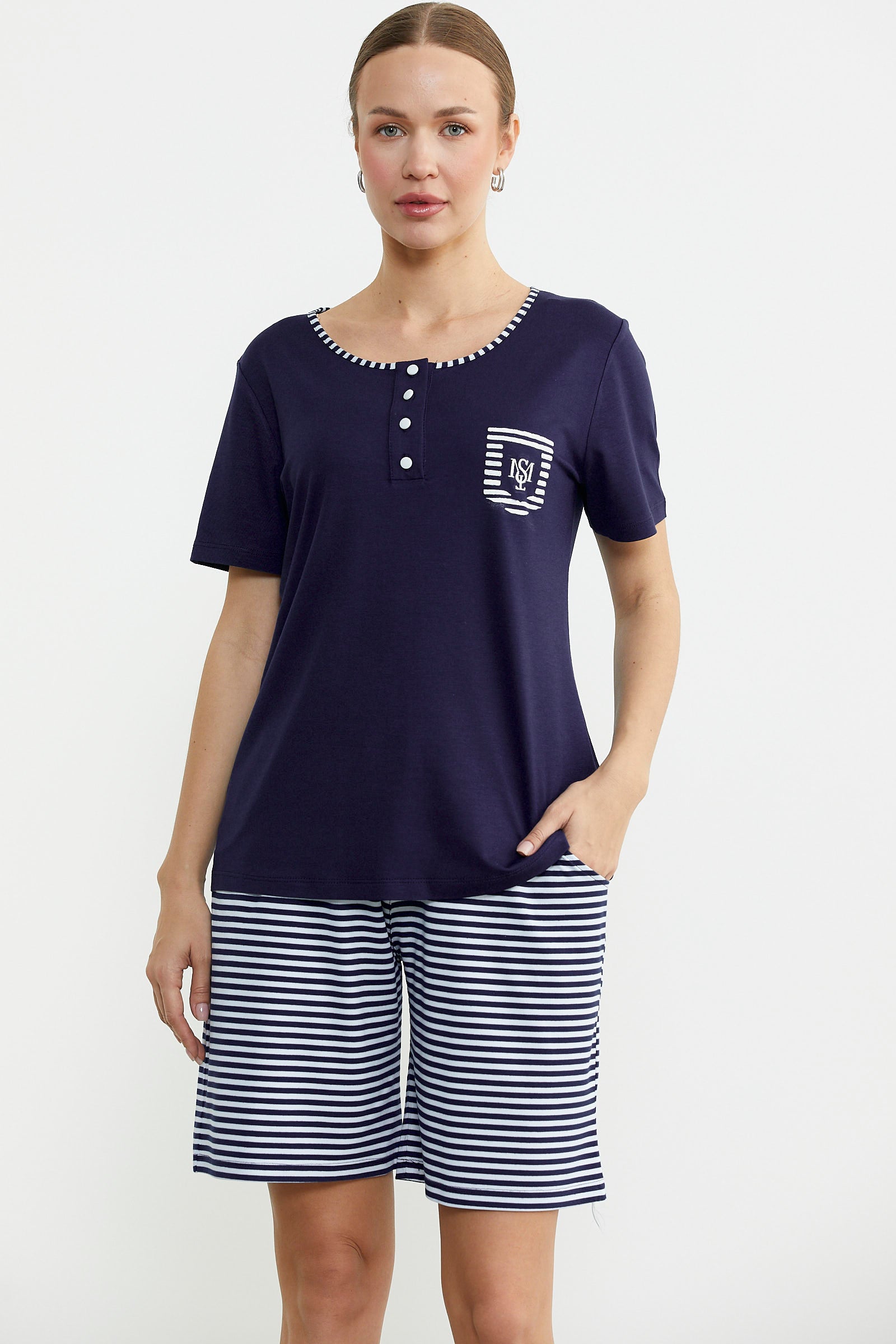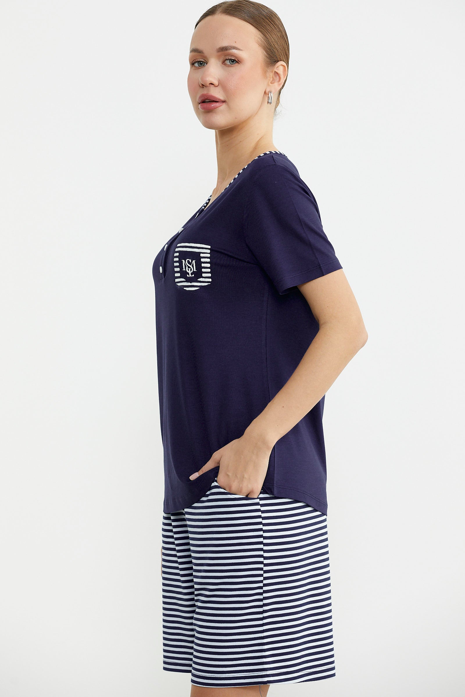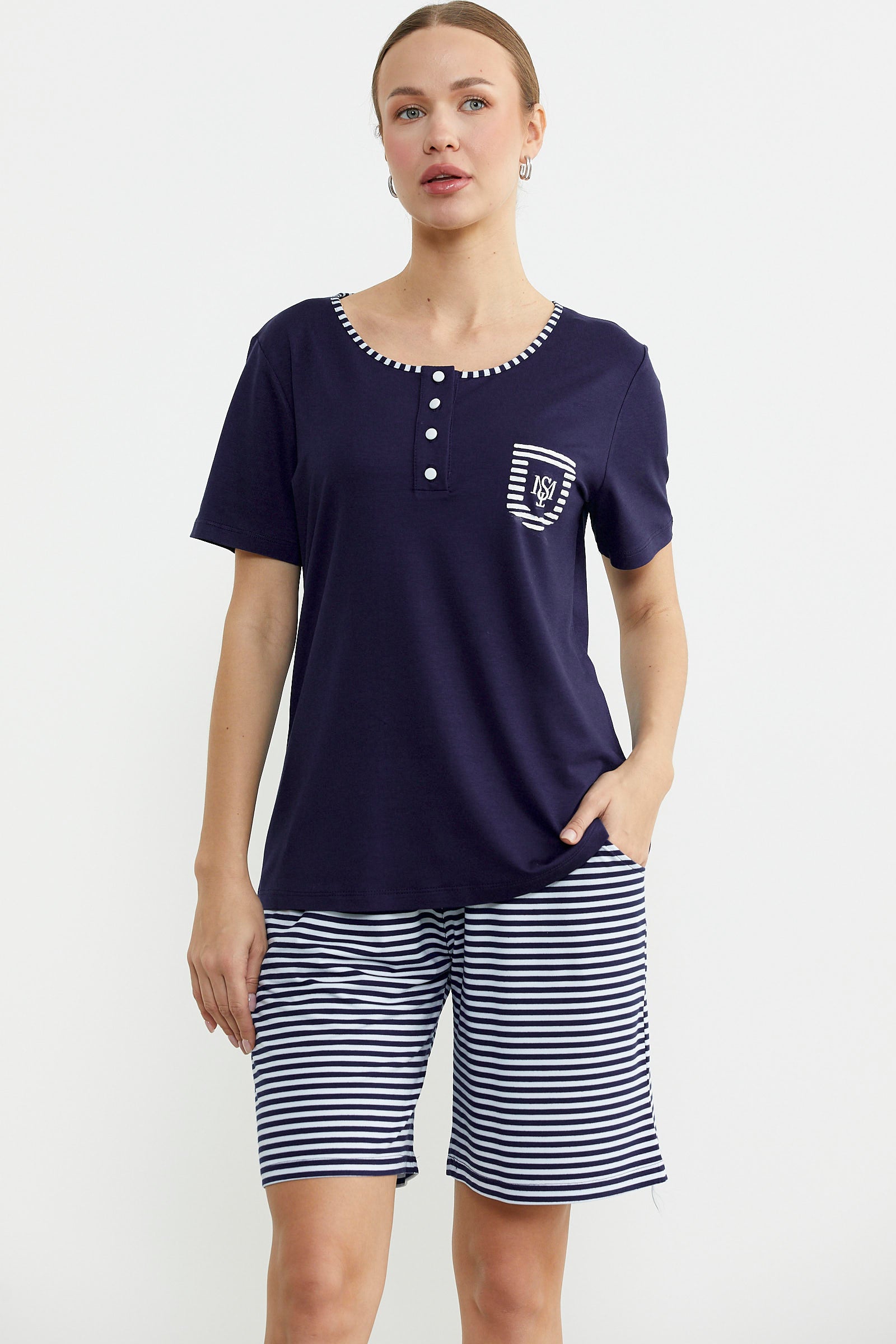 Marine Detaylı Çizgili Şortlu Takım - Lacivert