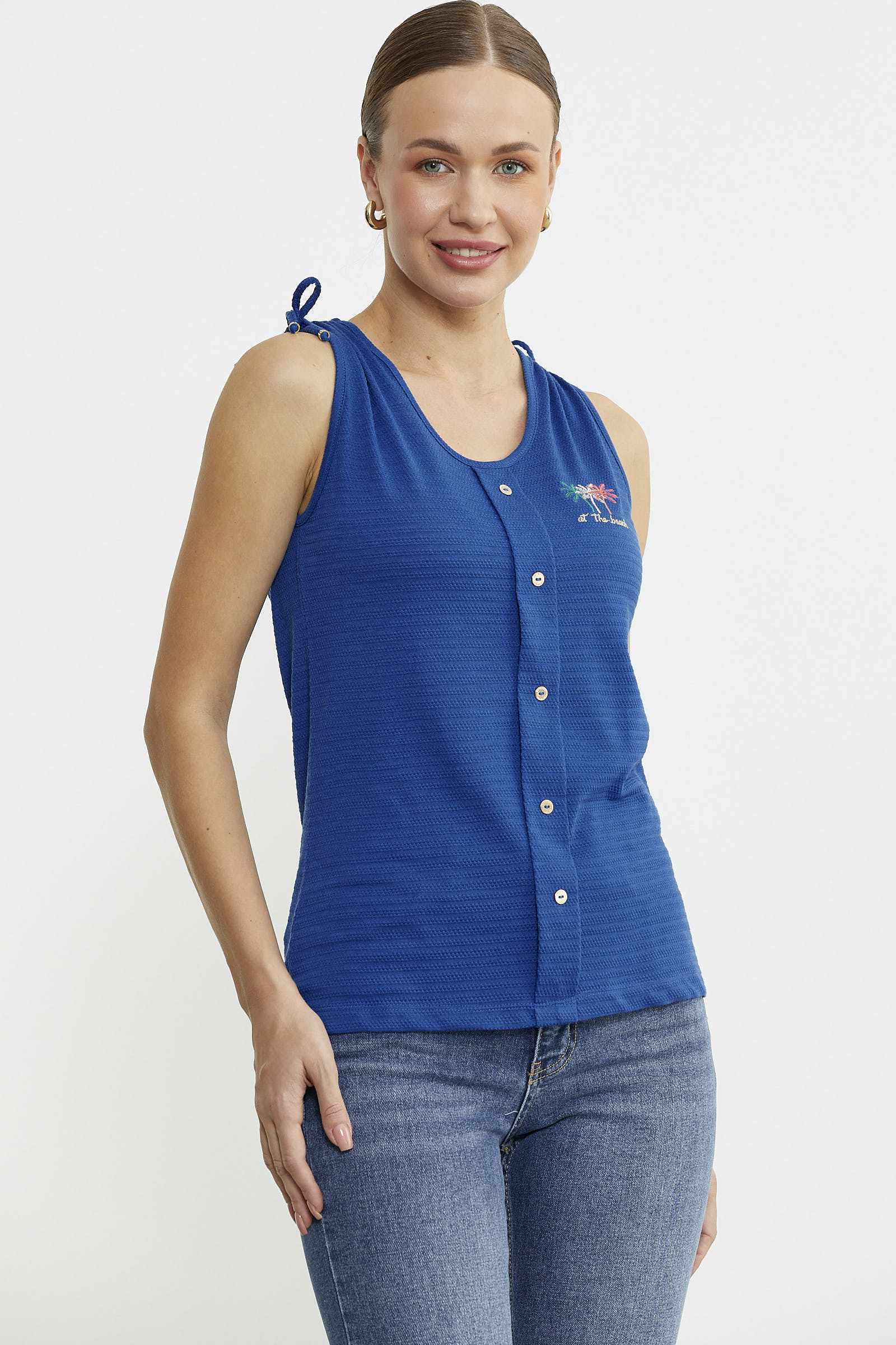 Dokulu nefes alabilen kumaştan üretilmiştir. Nakış detaylıdır. Omuzda ayarlanabilen ipler vardır.