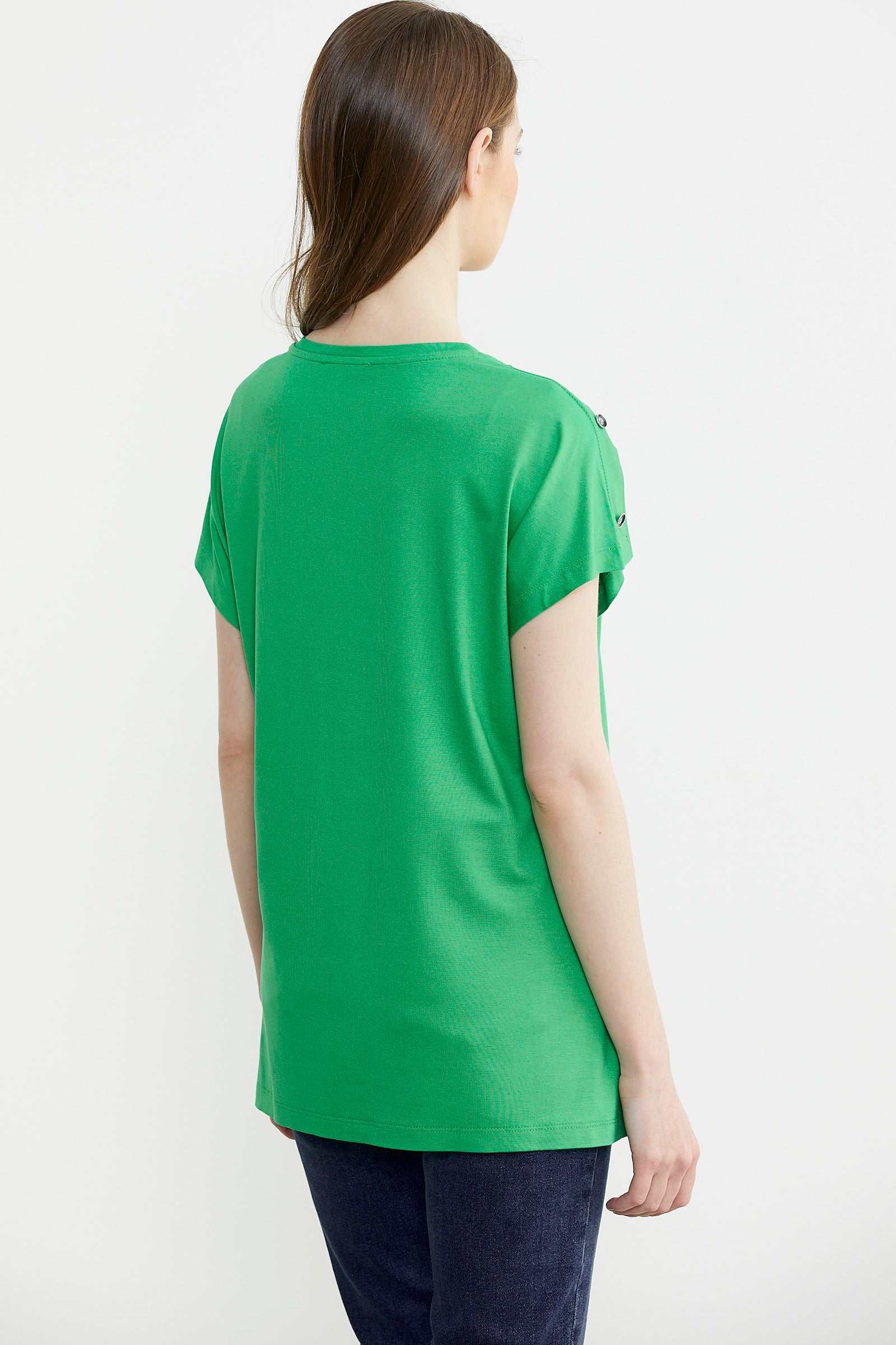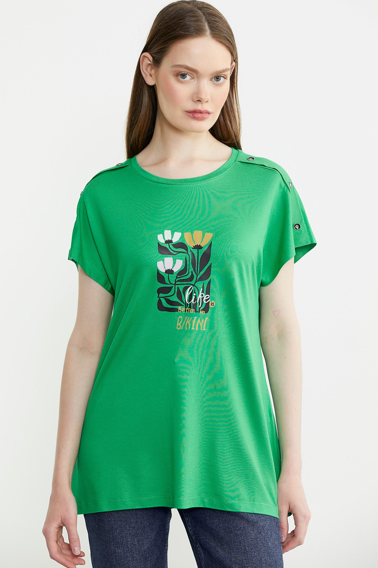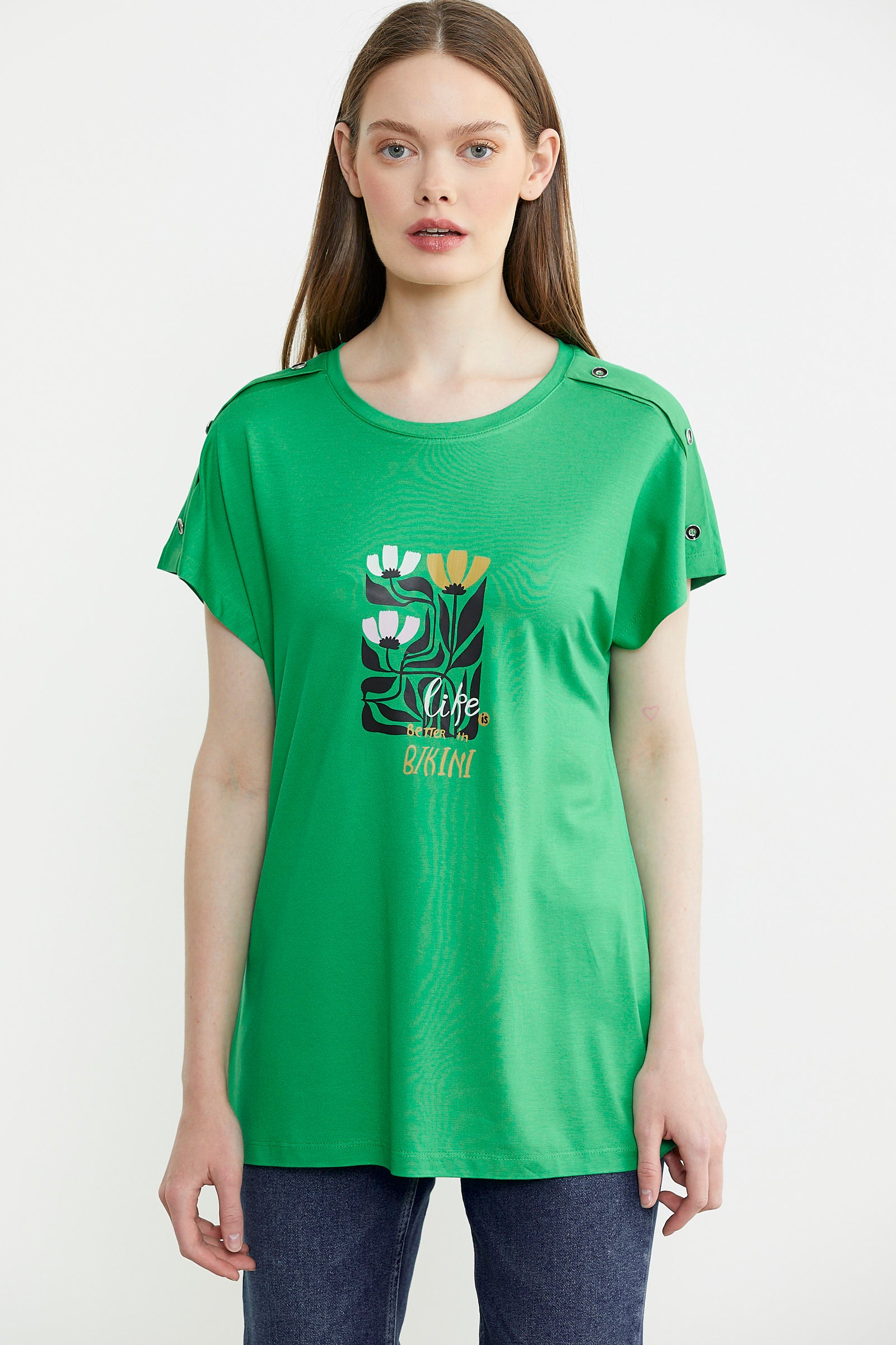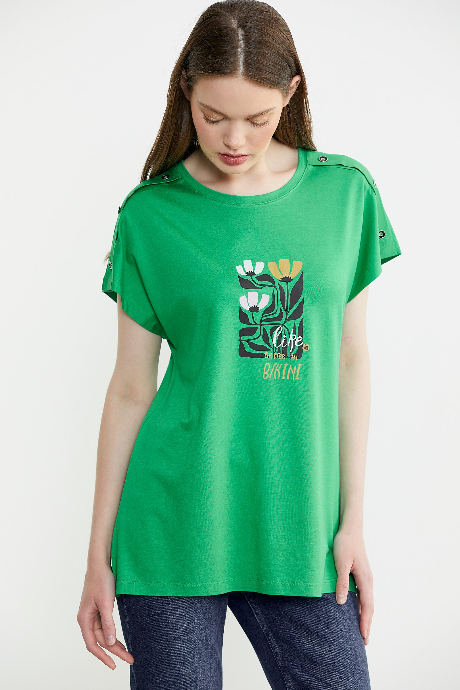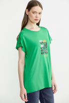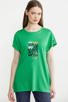 Omuz Detaylı Baskılı Penye Tişört - Yeşil