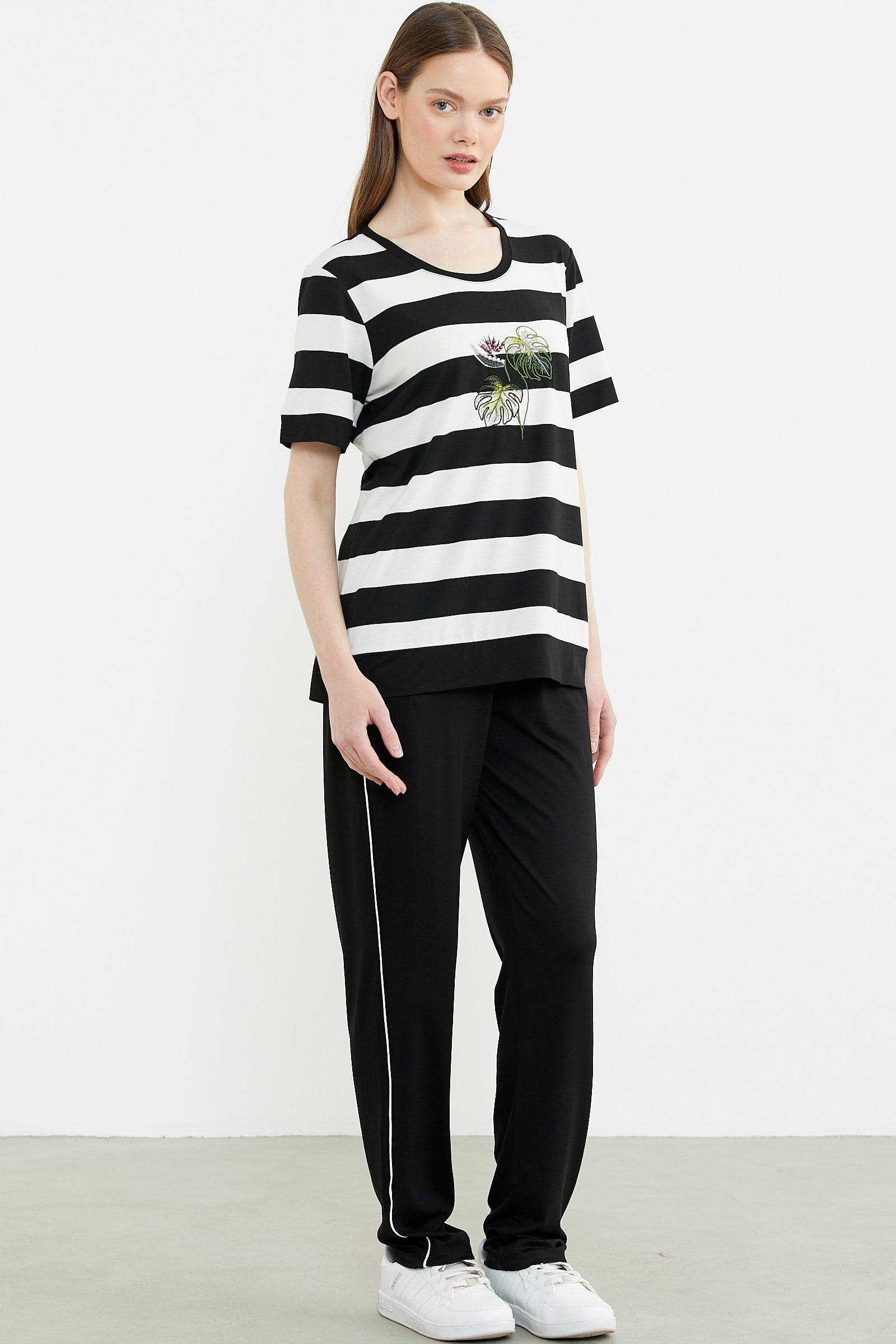 Zamansız çizgili deseniyle dikkat çeken bisiklet yaka tişört, düz renk kombinli rahat kalıp pantolonla takımdır. Yumuşak dokusuyla günlük kullanım için idealdir.