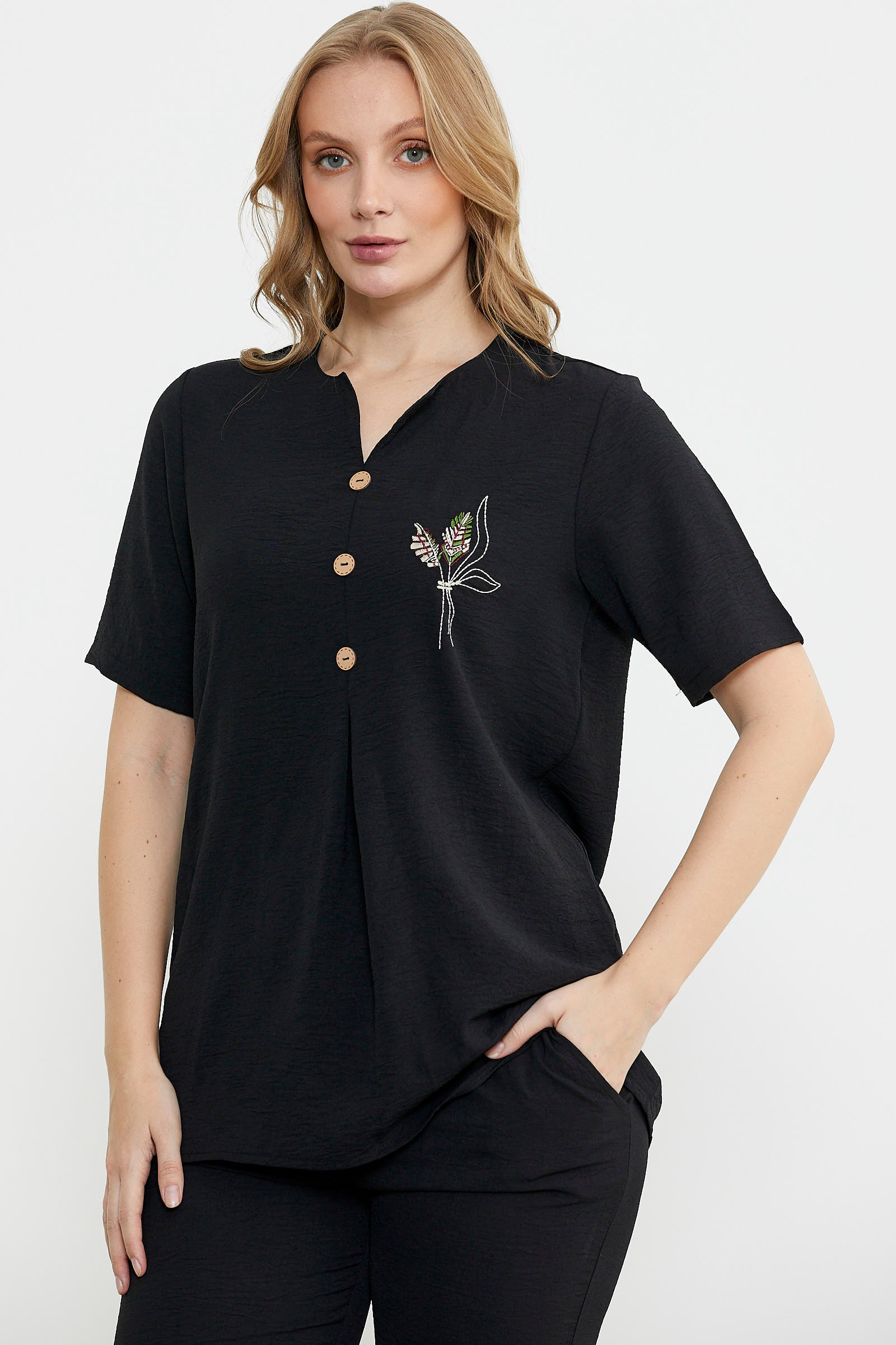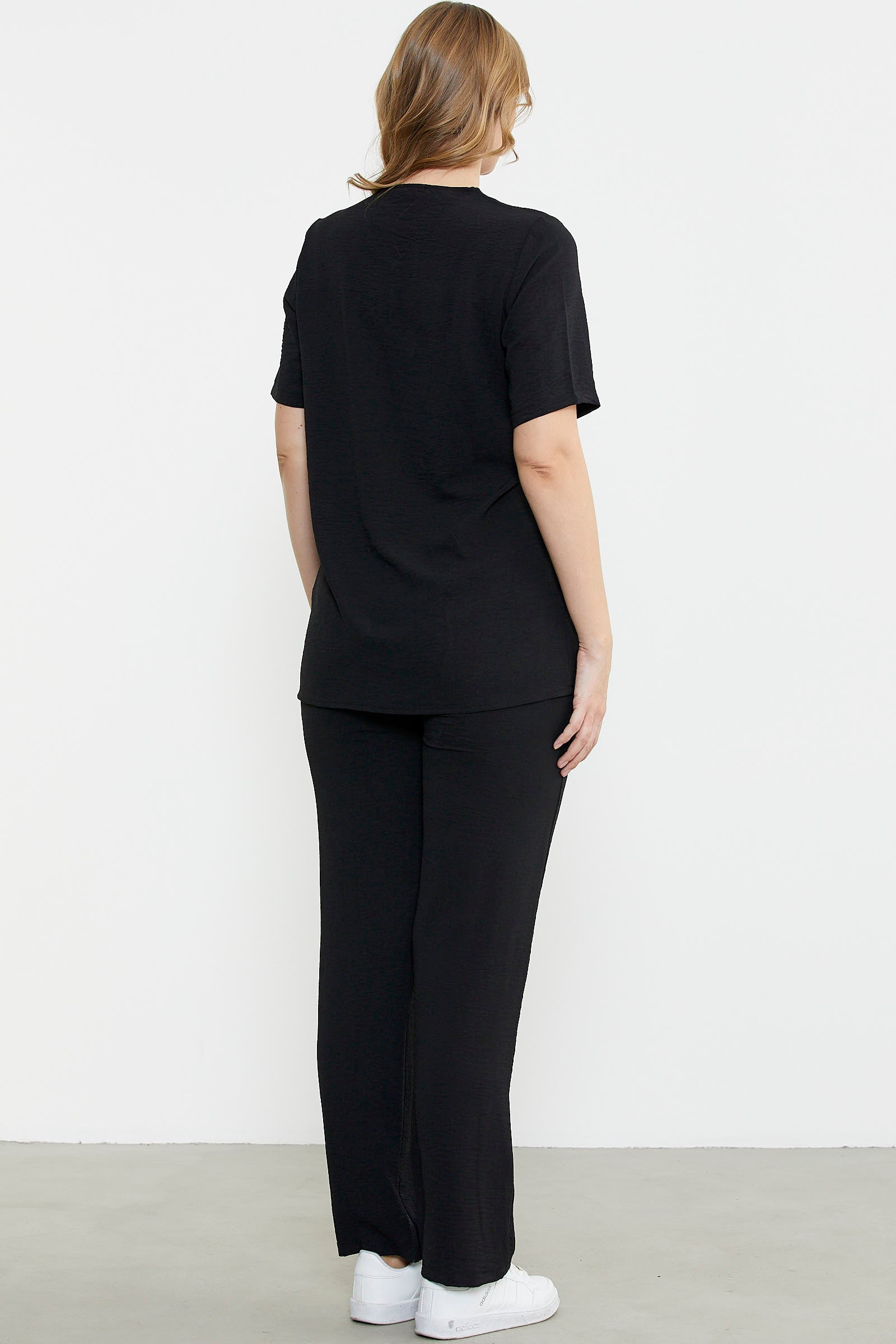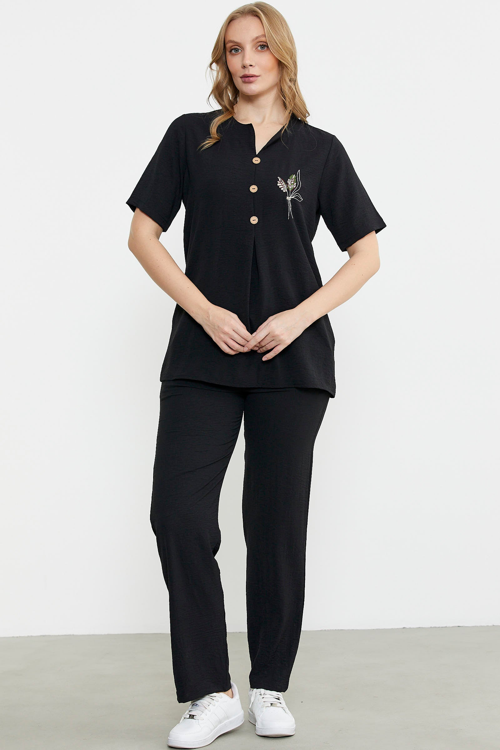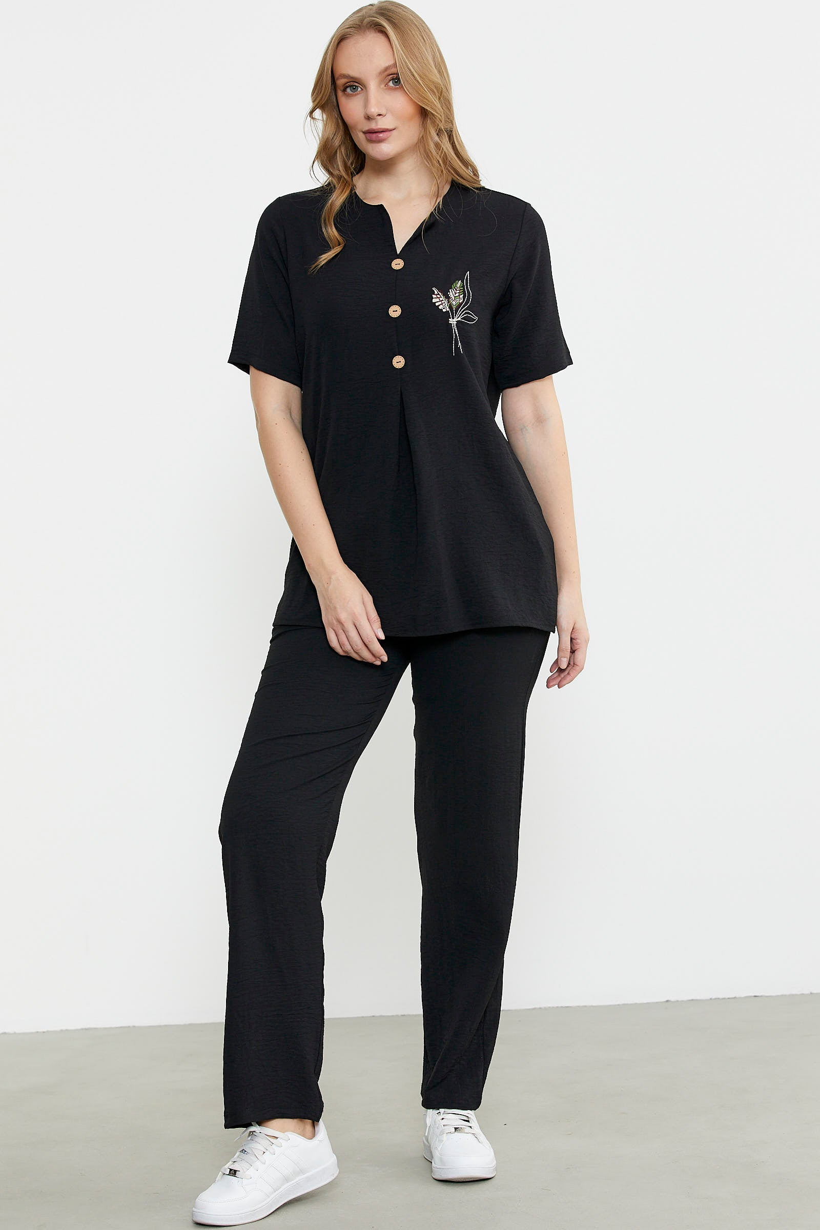 Sıfır Yaka Düğmeli Viskon Takım - Siyah