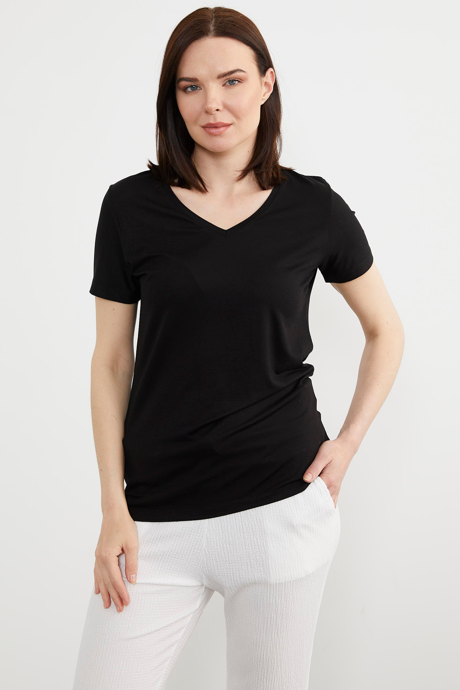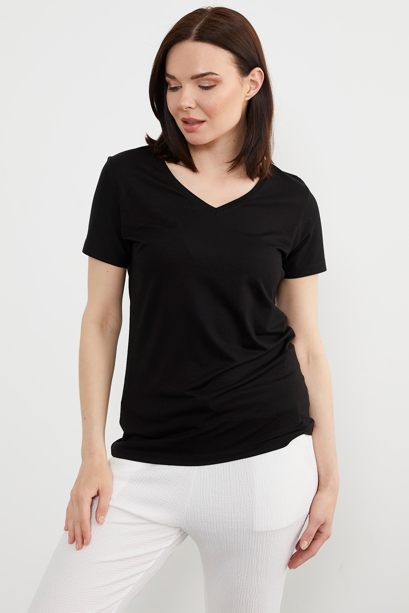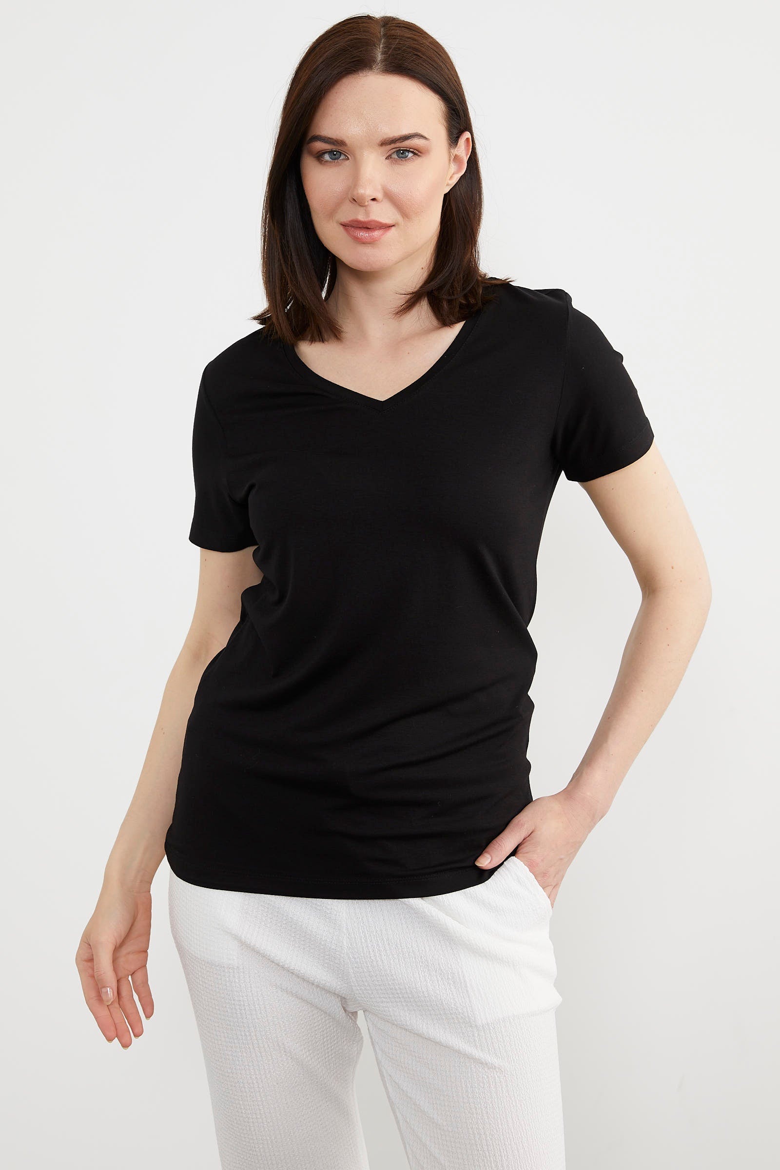 Yaz mevsiminde gardıroplarınızın kurtarıcı parçası; V yaka, kısa kollu, dökümlü ve rahat basic tişört.