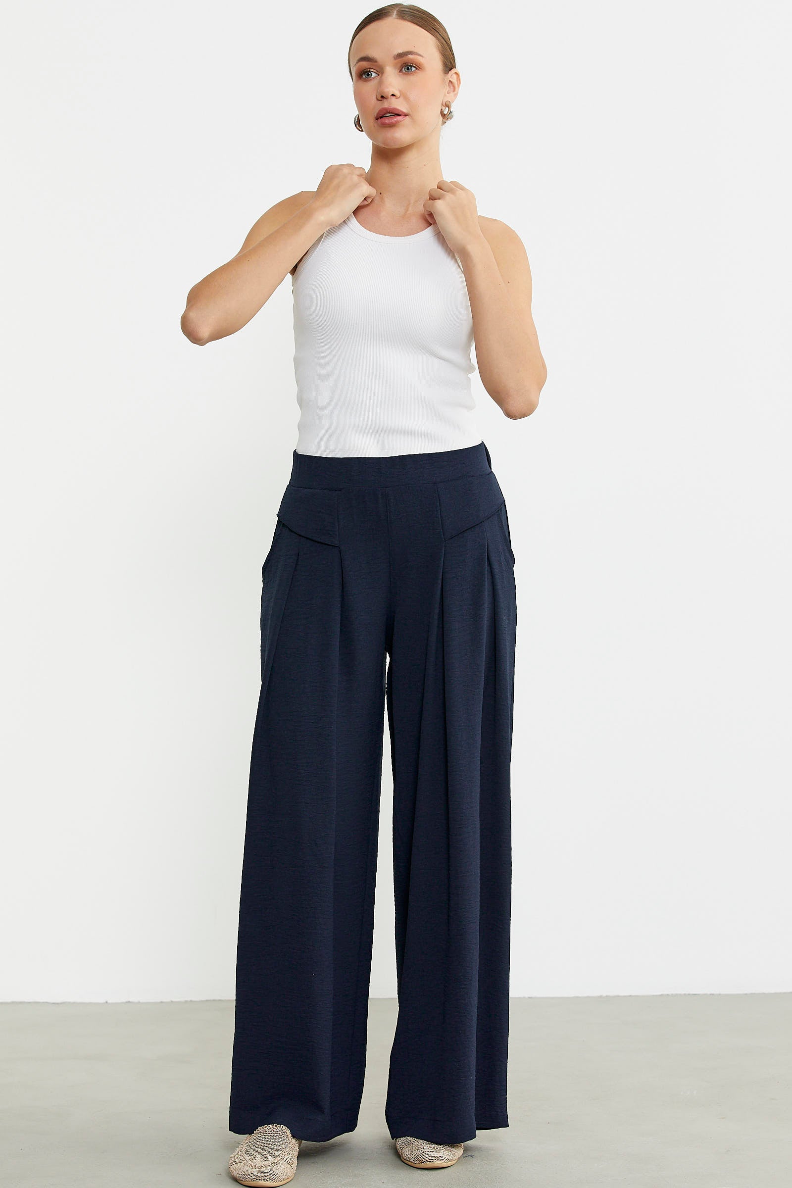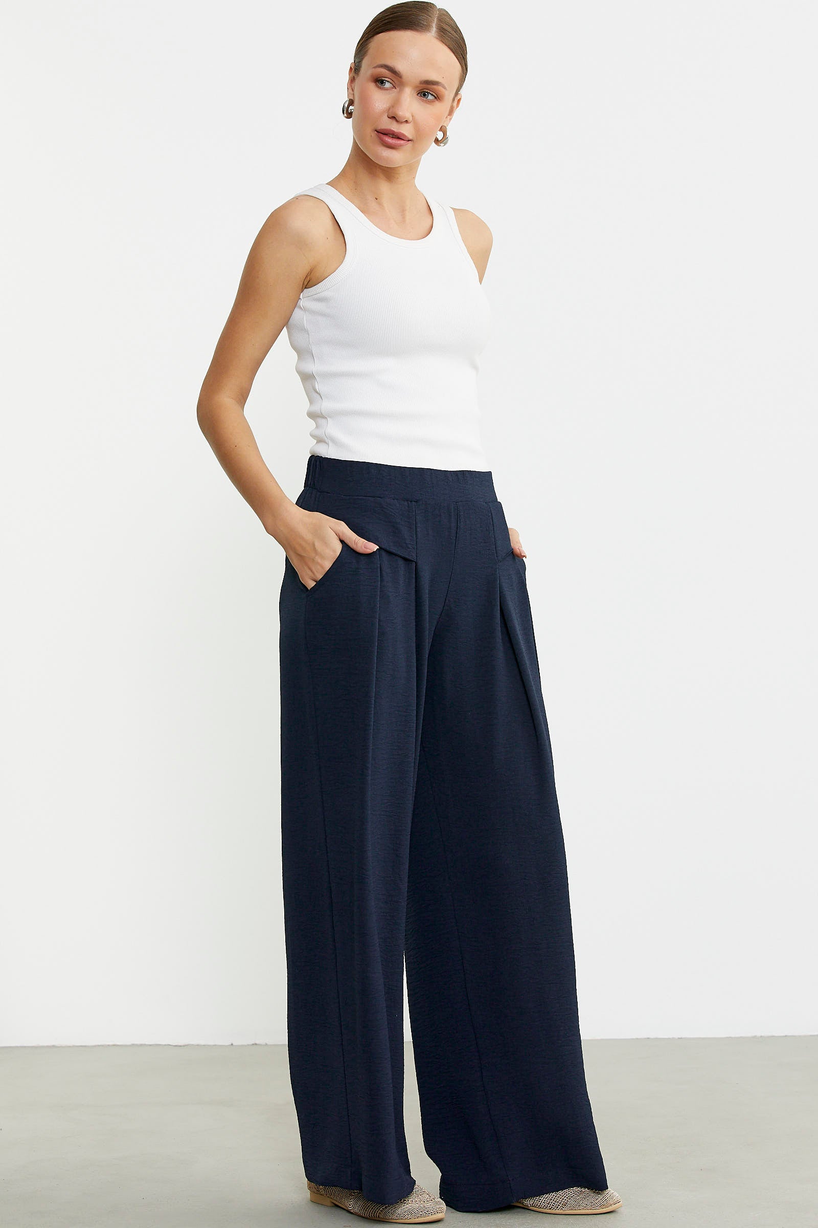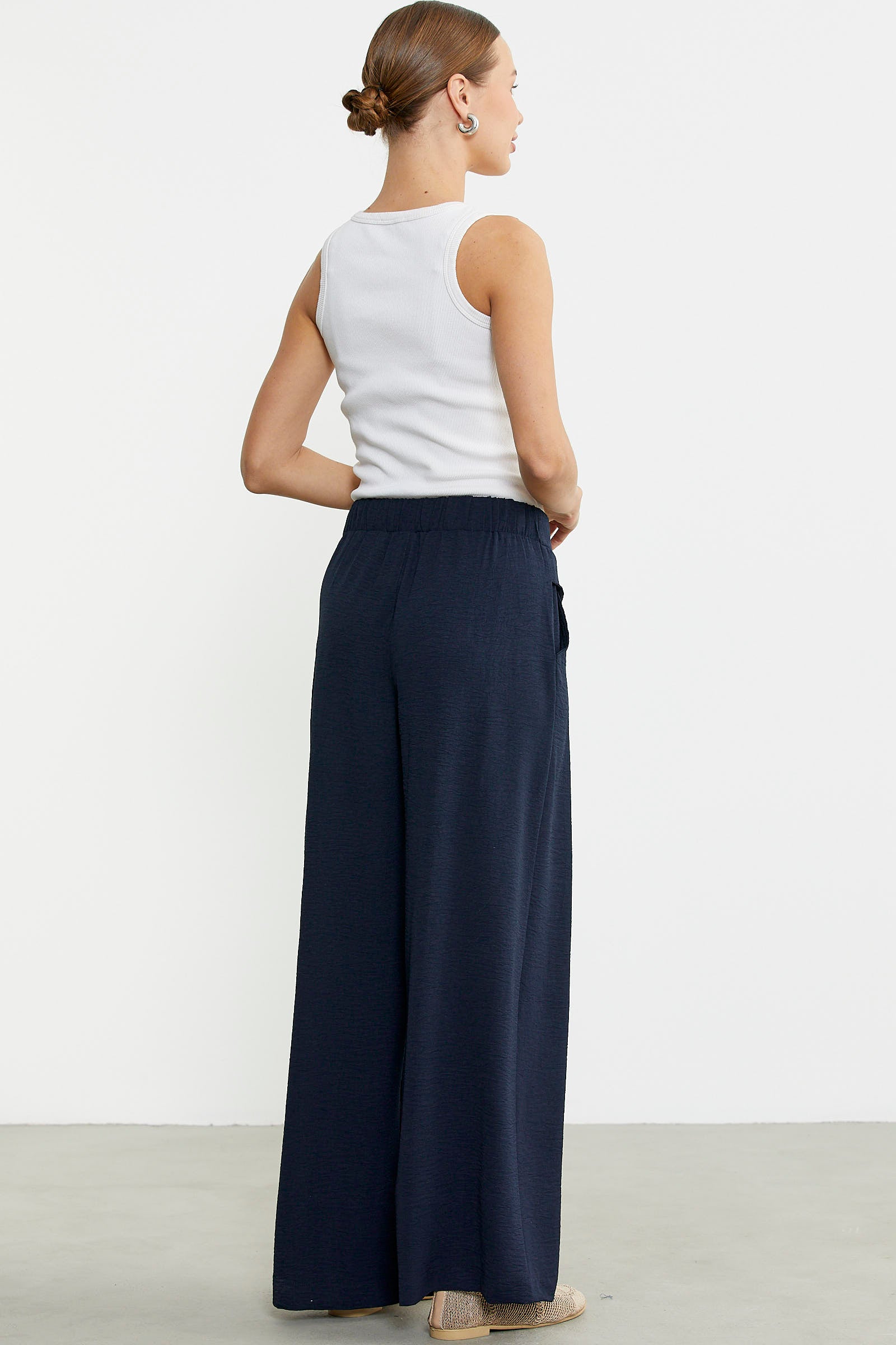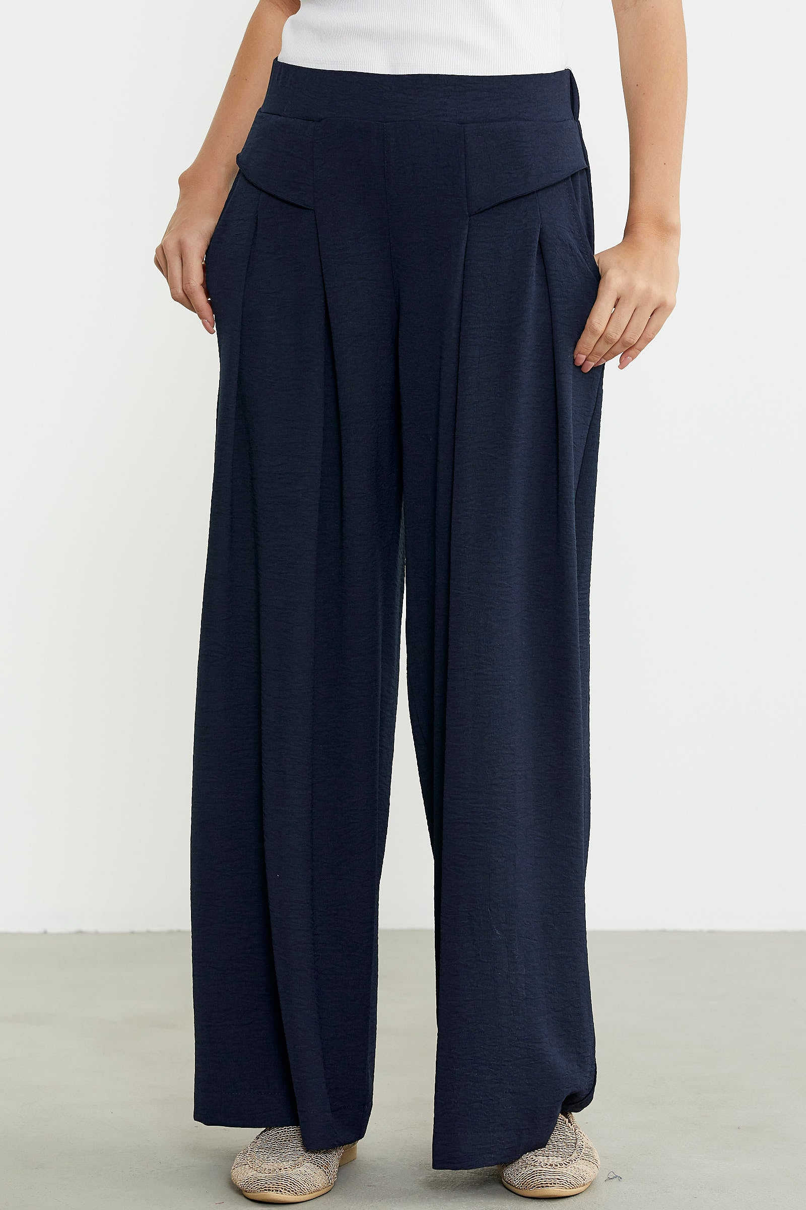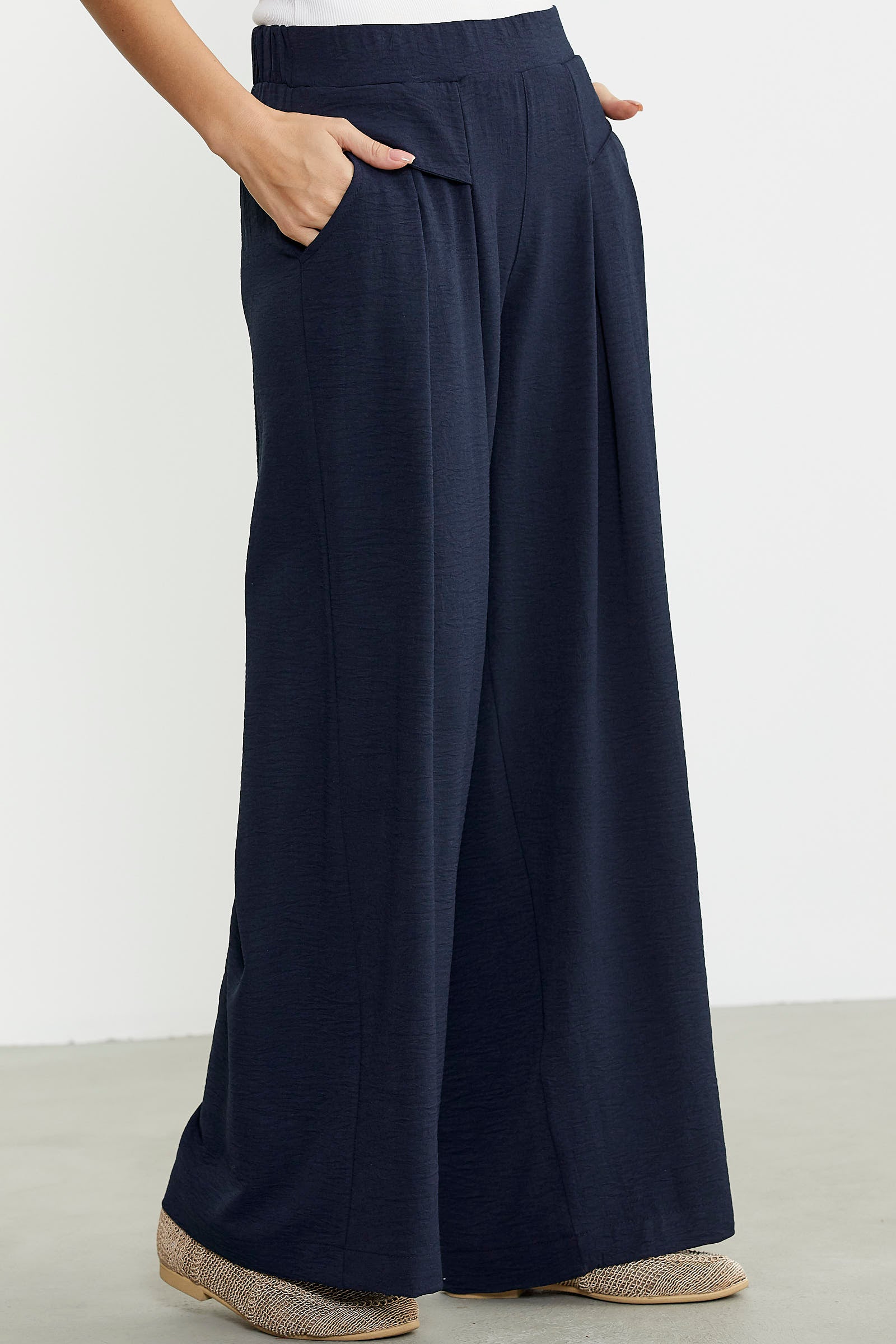 Bol kesim üretilen krep pantolonun ön belinde volan detayı kullanılmıştır. Cepli ve rahat kalıp olarak tasarlanmıştır.