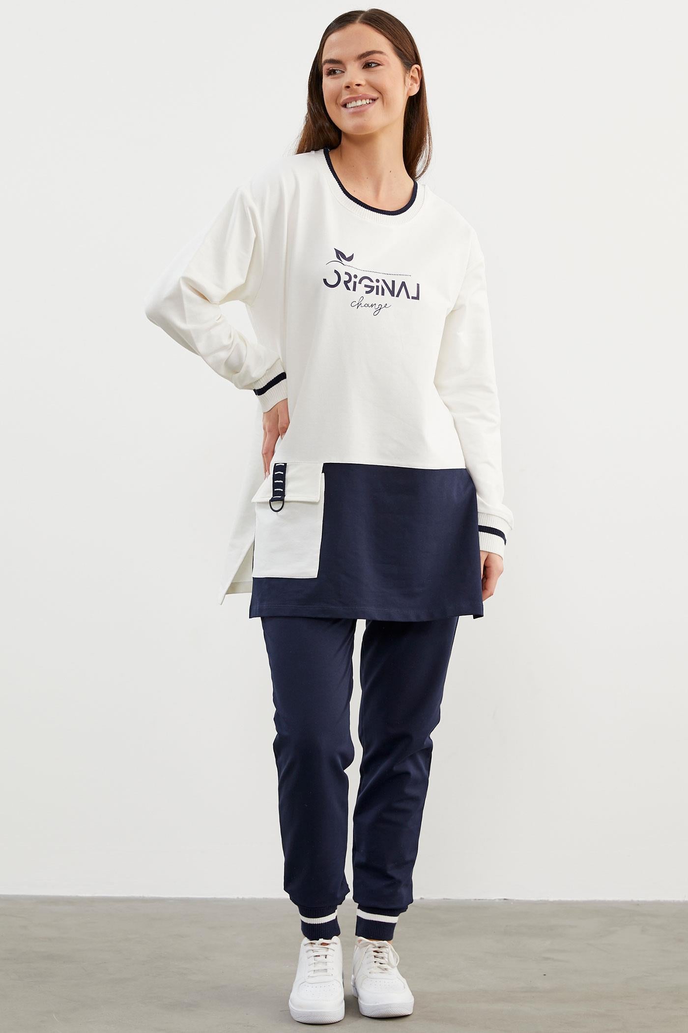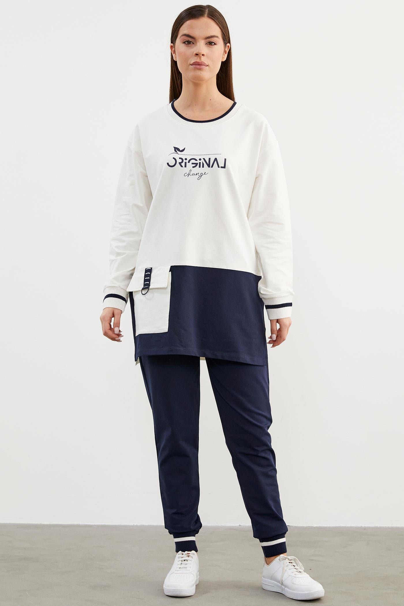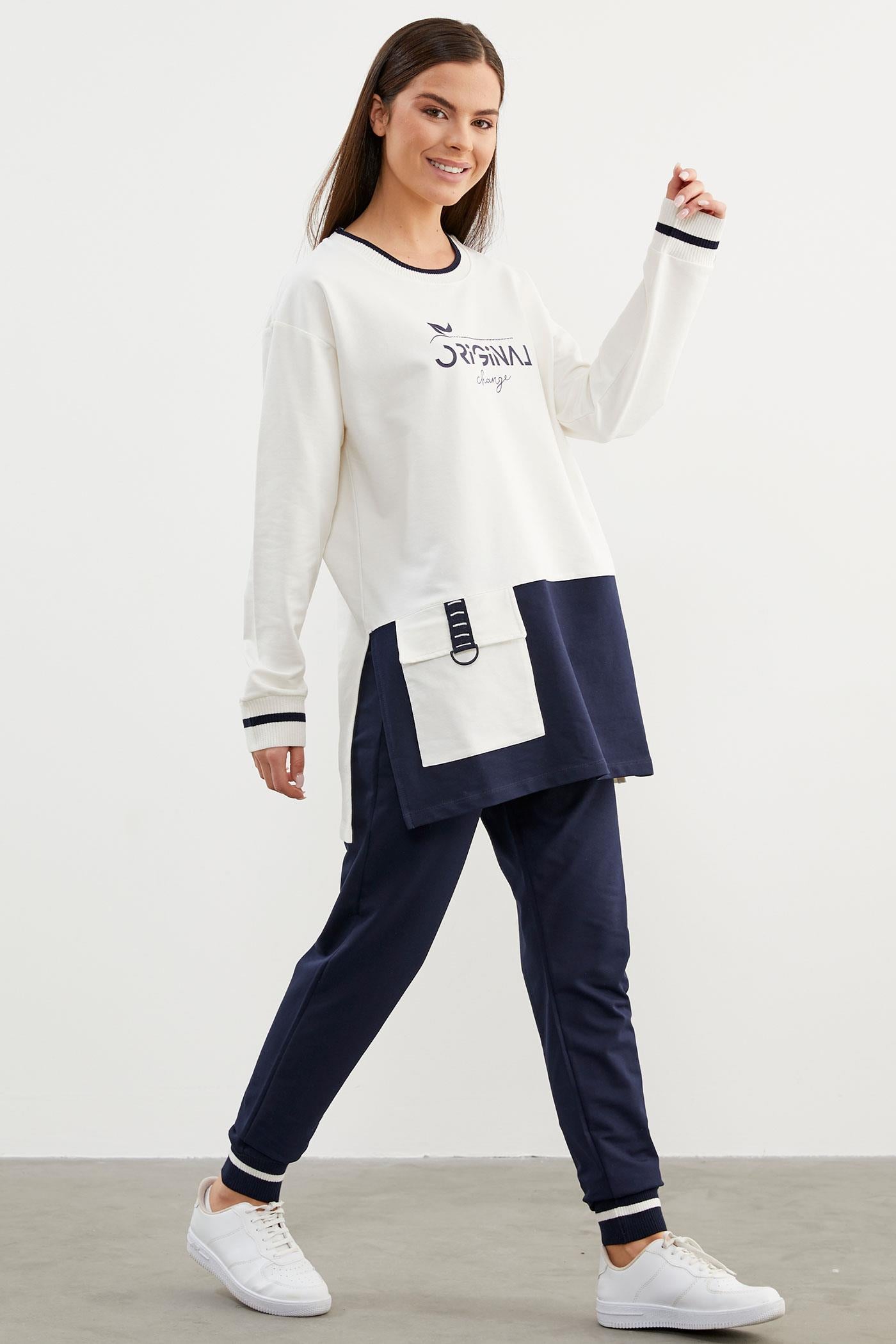 Uzun kollu sweatshirt, cep detayı ile ön plana çıkıyor. Yan kısımları yırtmaçlı, yakası ve manşetleri ribanalı olan tasarım göze çarpıcı bir dokunuş katıyor. Ribanalı dar paça alt tasarımıyla da bütünlük sağlayan takım ile rahatlığın keyfini sürün...