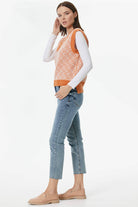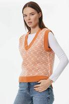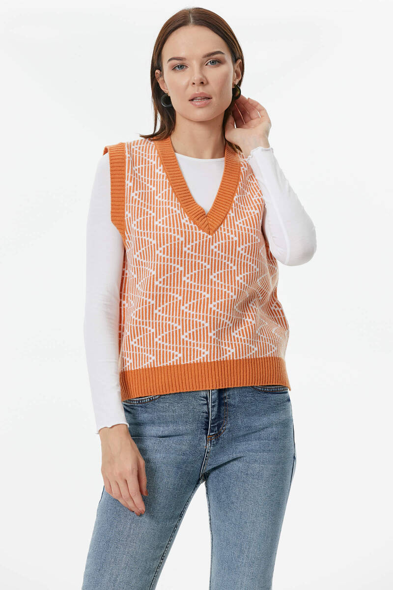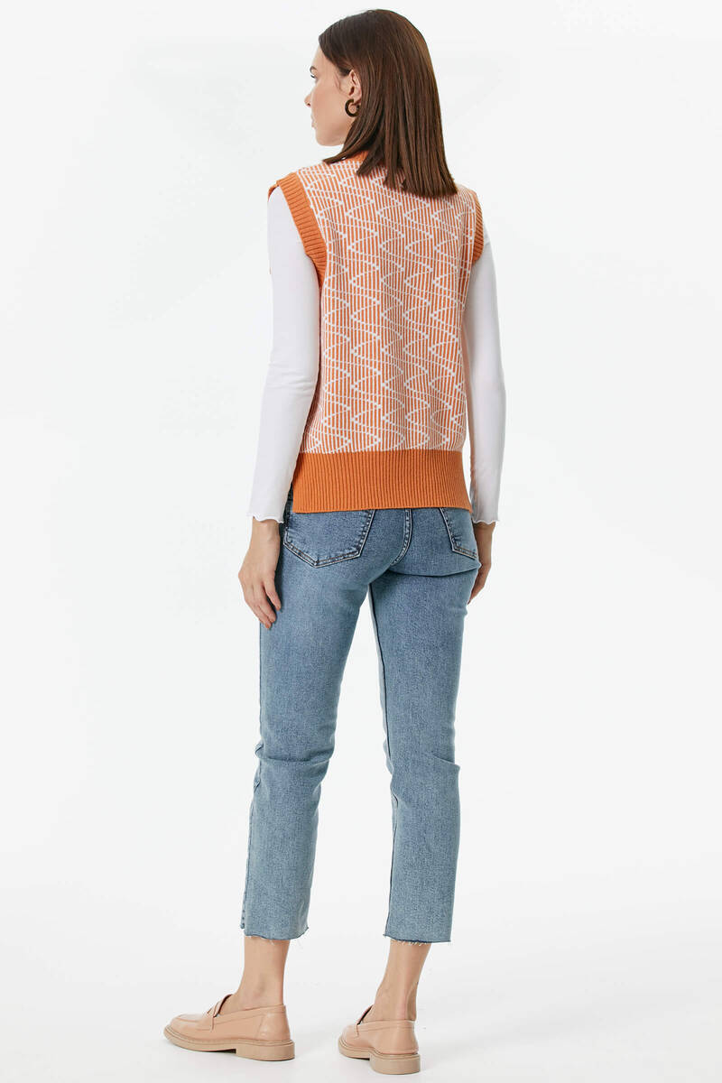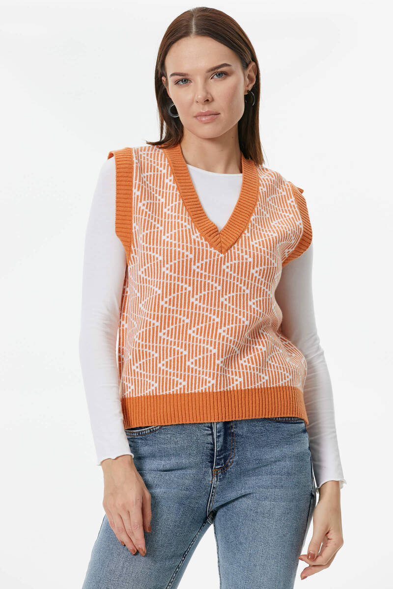 V yaka,kolsuz,kumaşı yumuşak dokulu ve desenli triko süveter.