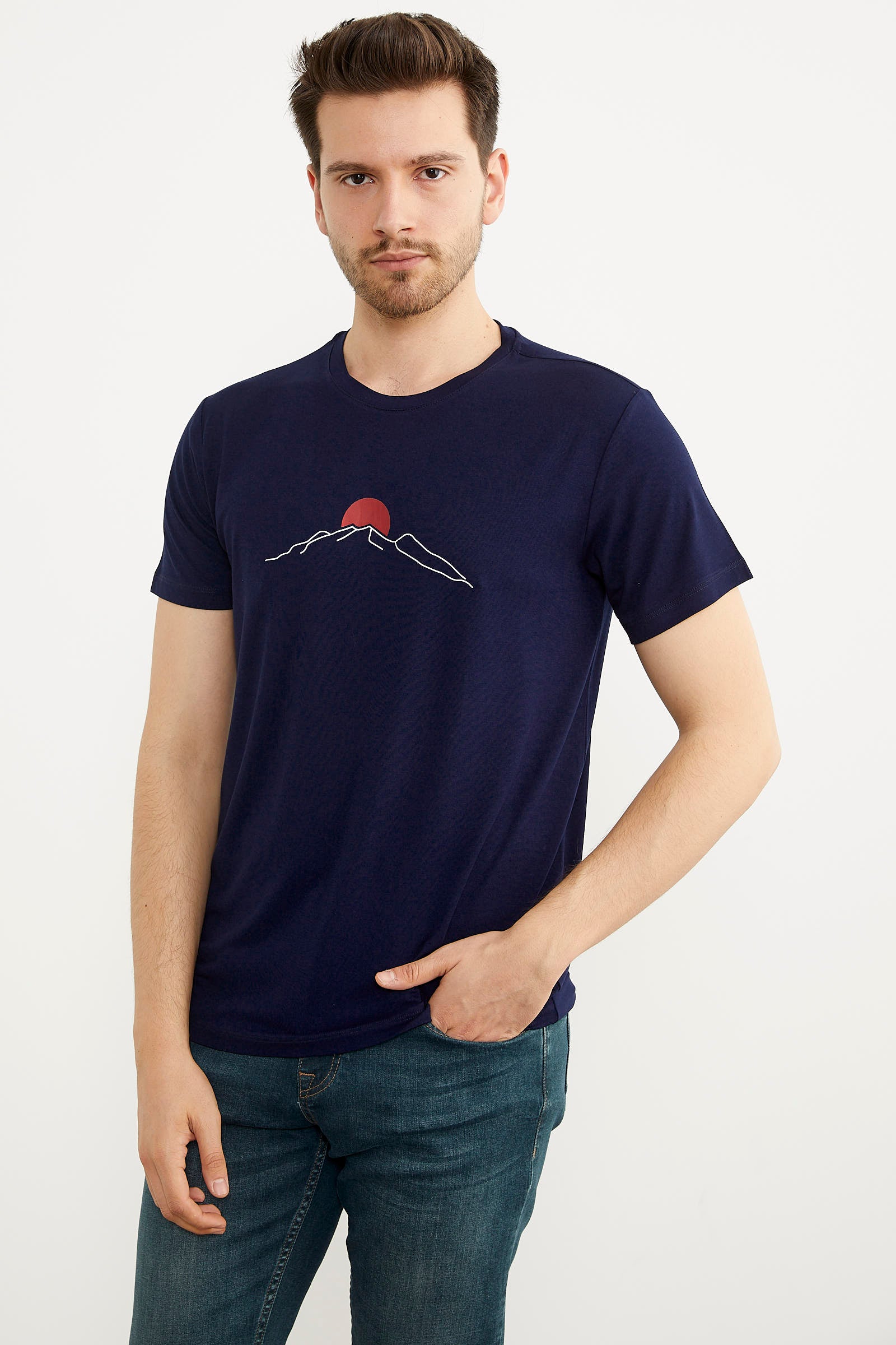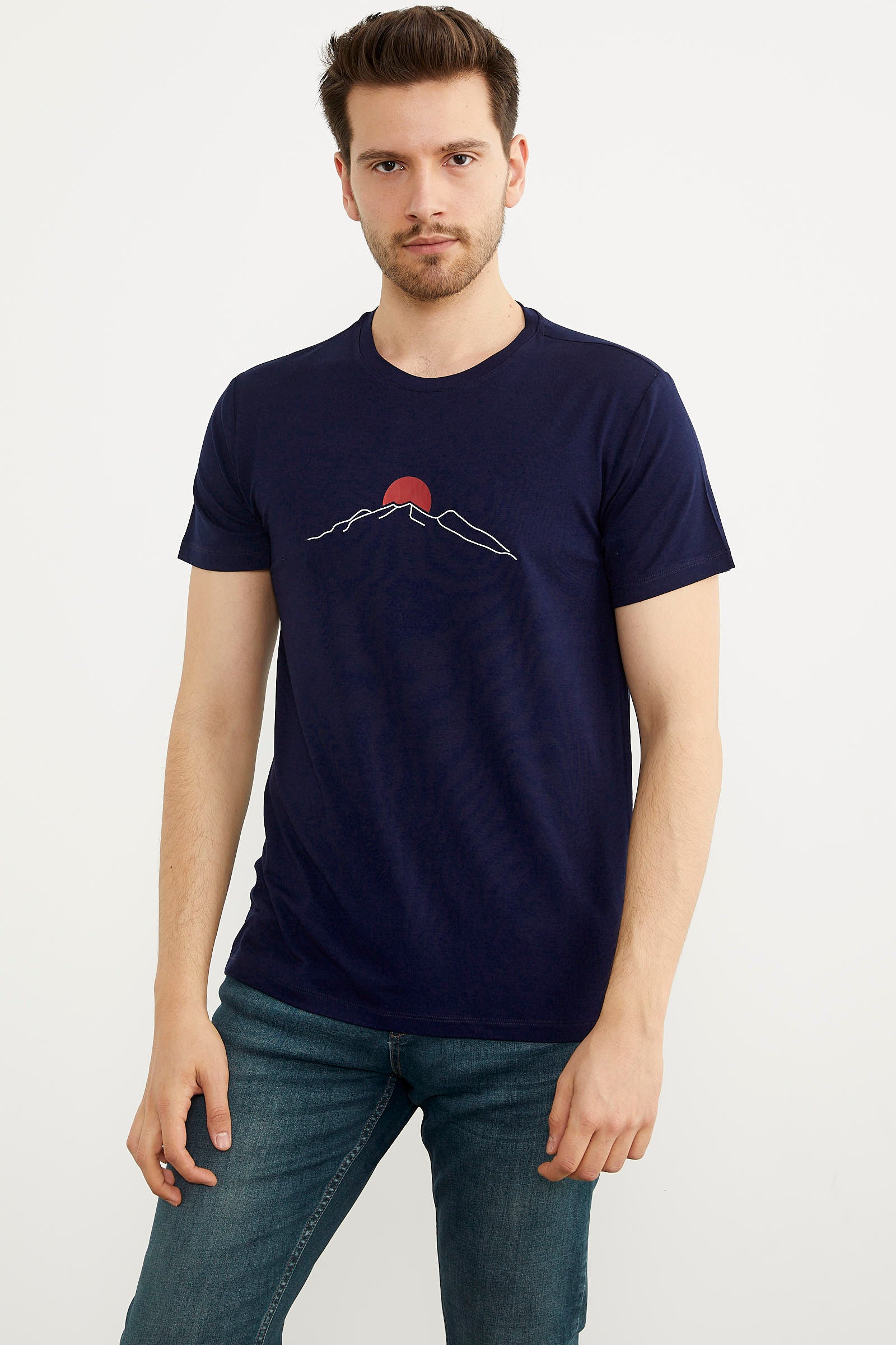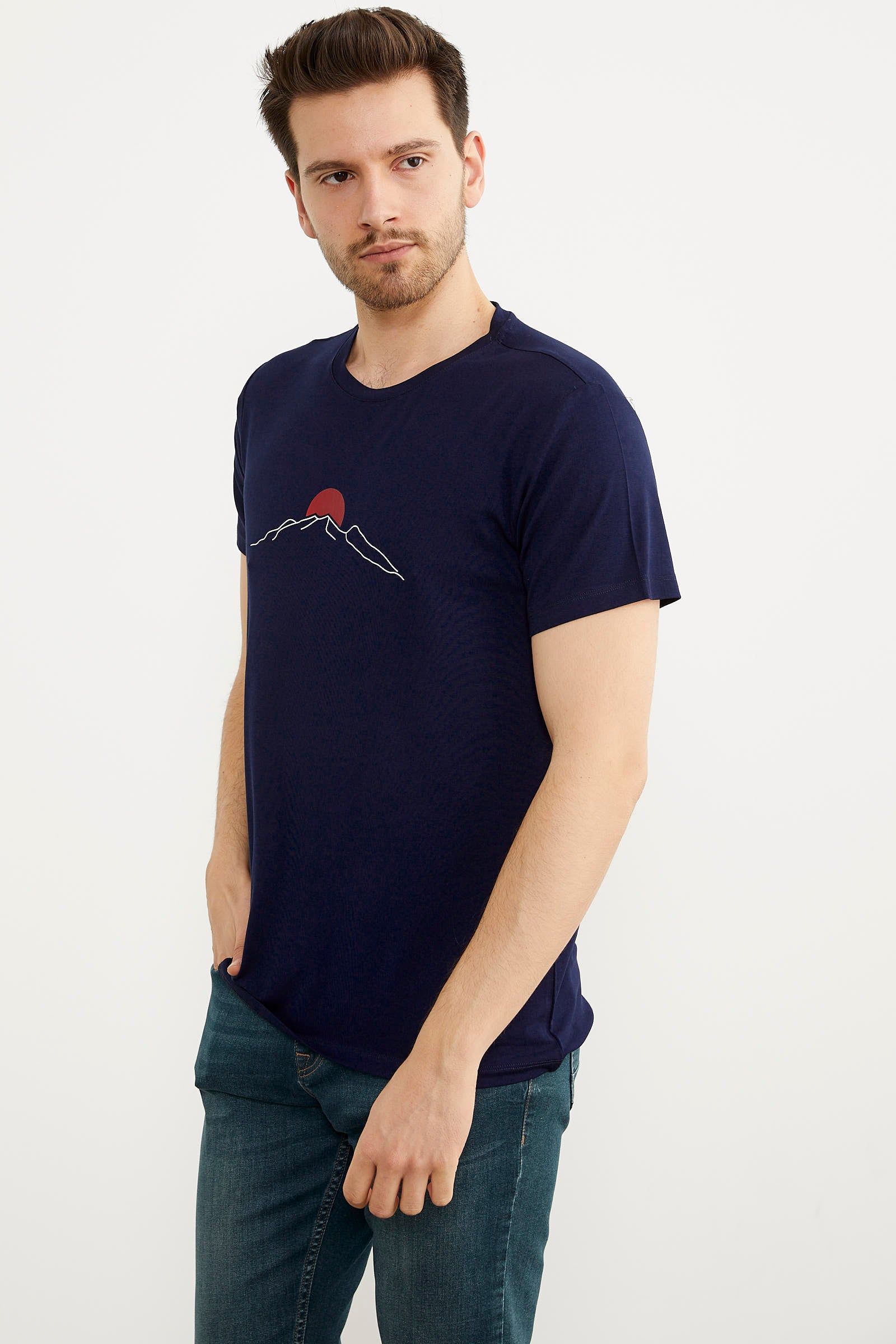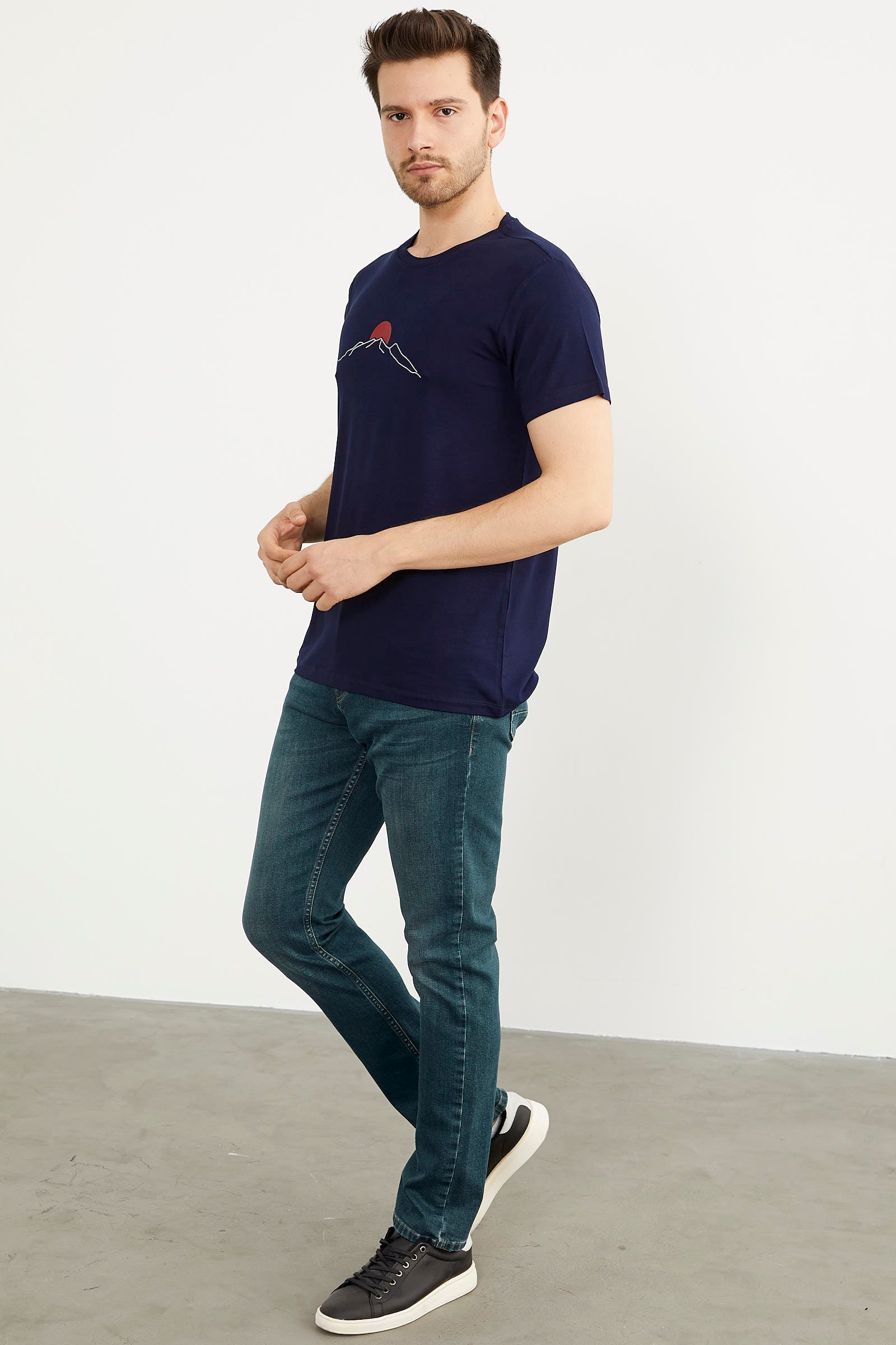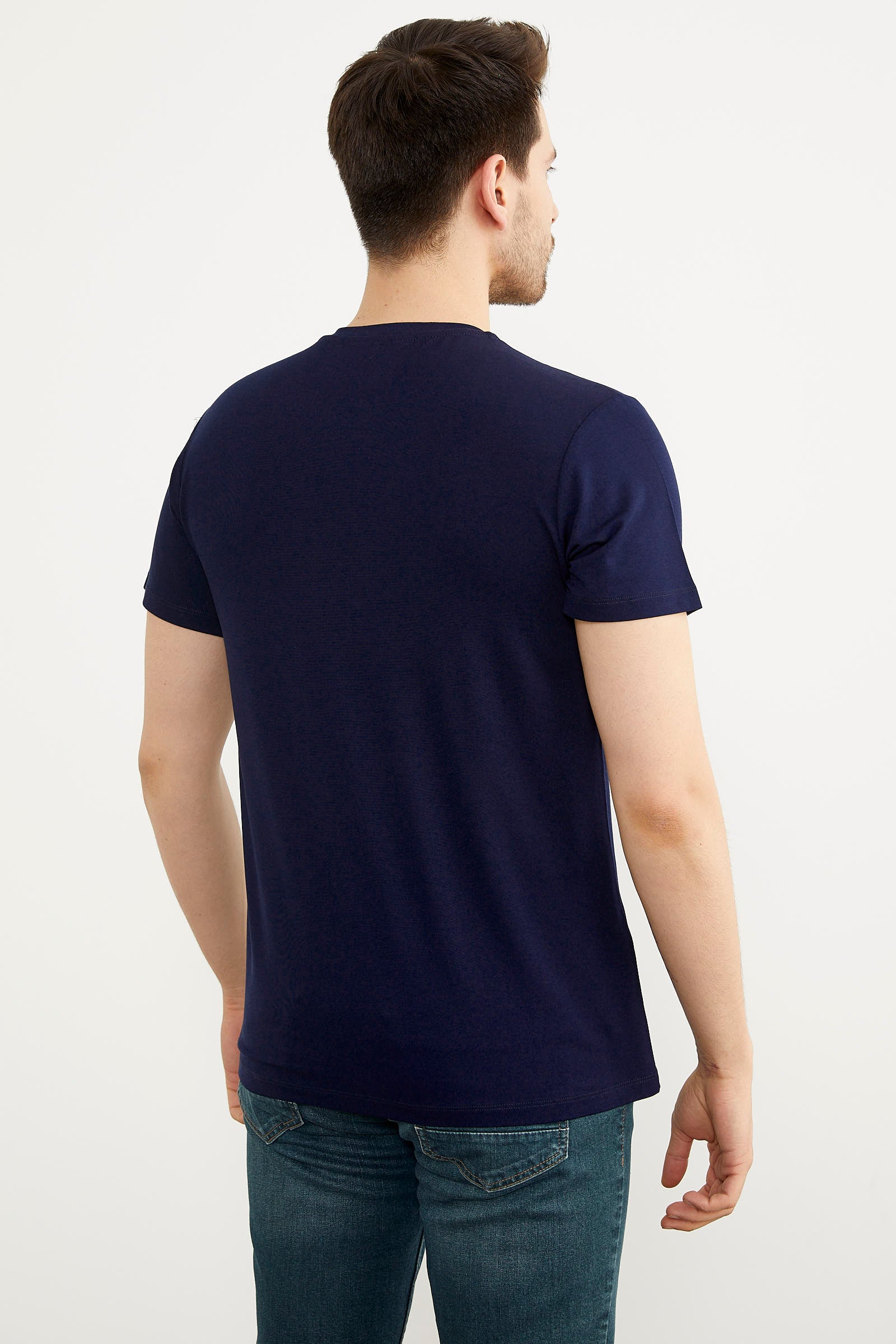 Sıfır Yaka Baskılı Kısa Kol Tişört - Lacivert