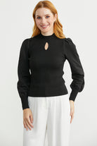 Dik Yaka Balon Kol Triko Kazak - Siyah