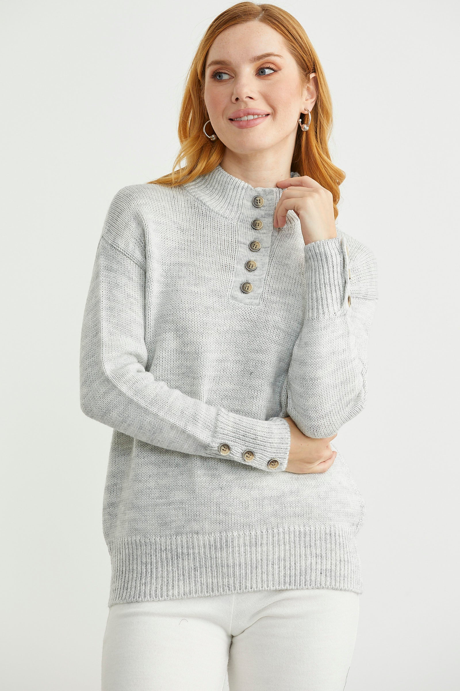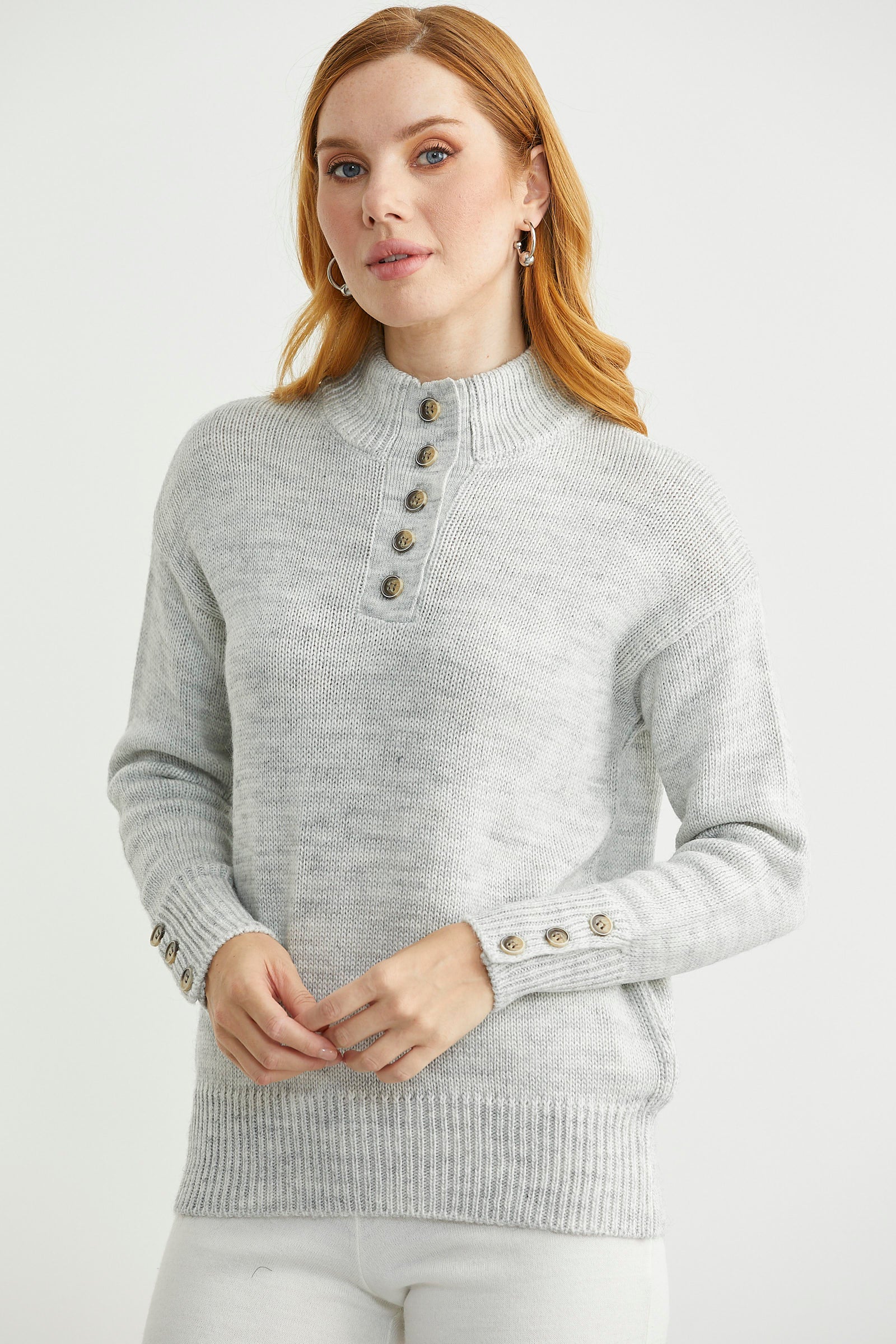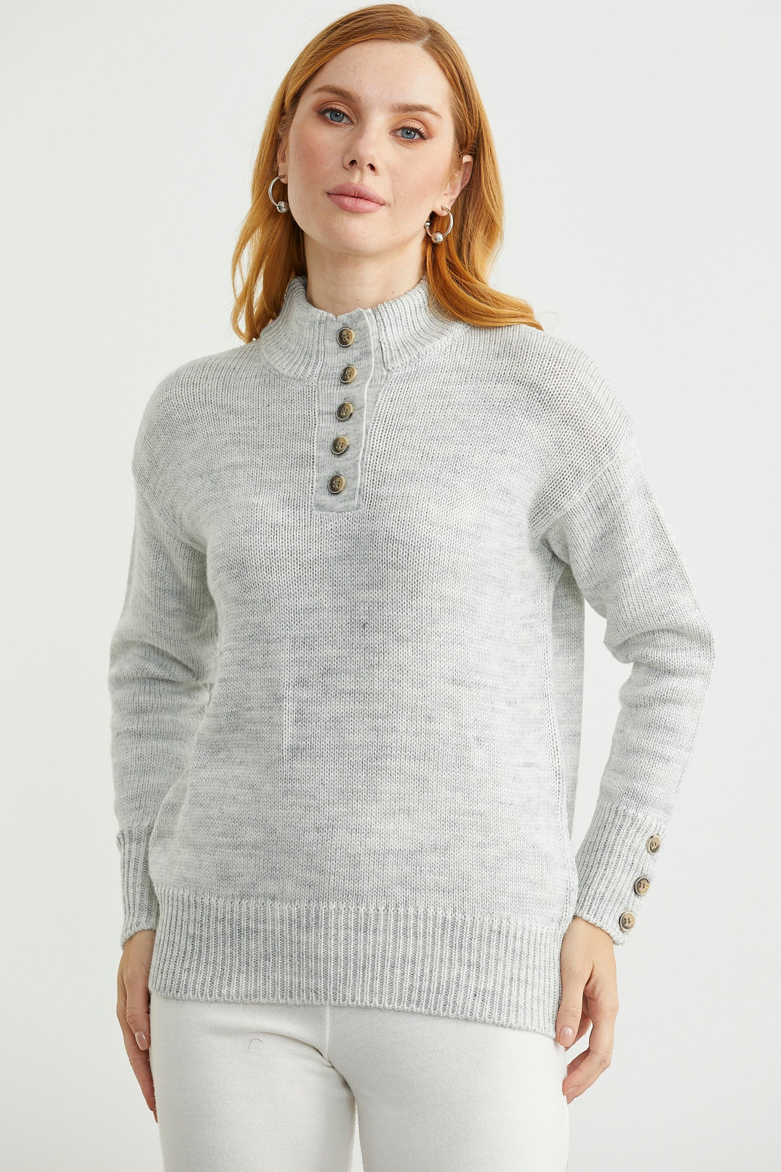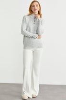 Dik Yaka Düğme Detaylı Yünlü Triko Kazak - Açık Gri