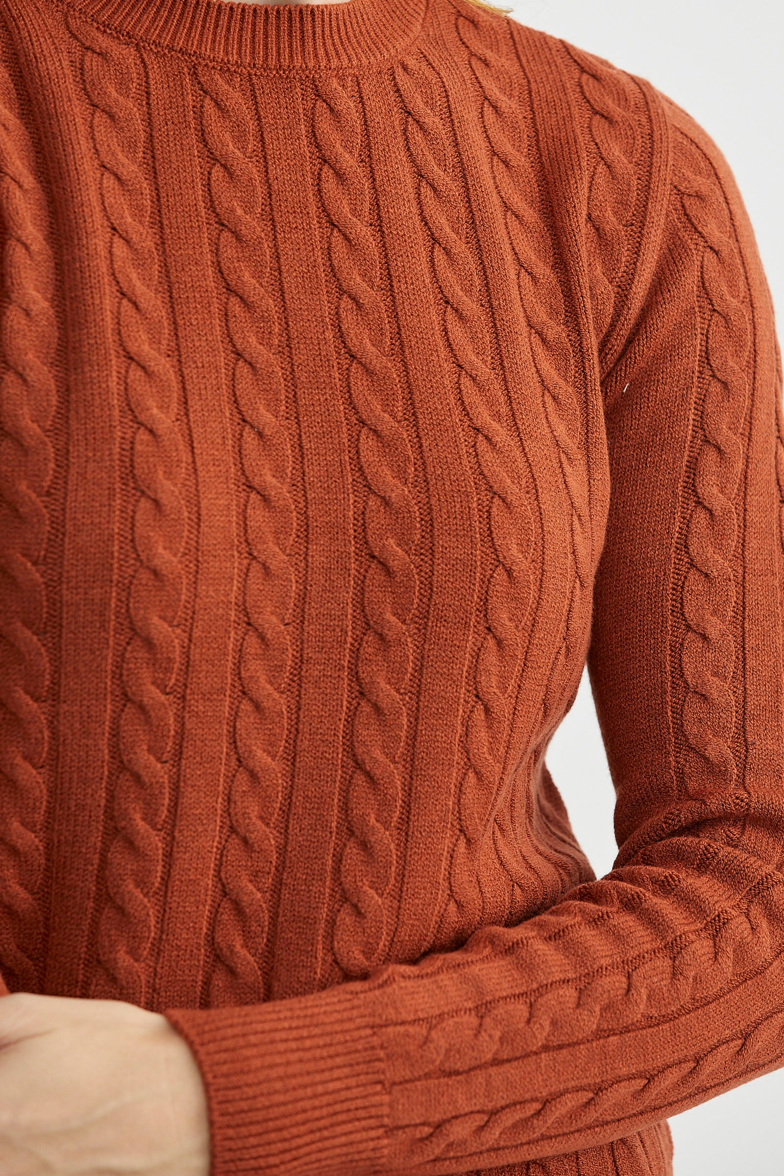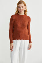 Dilimli Saç Örgülü Triko Kazak - Kiremit