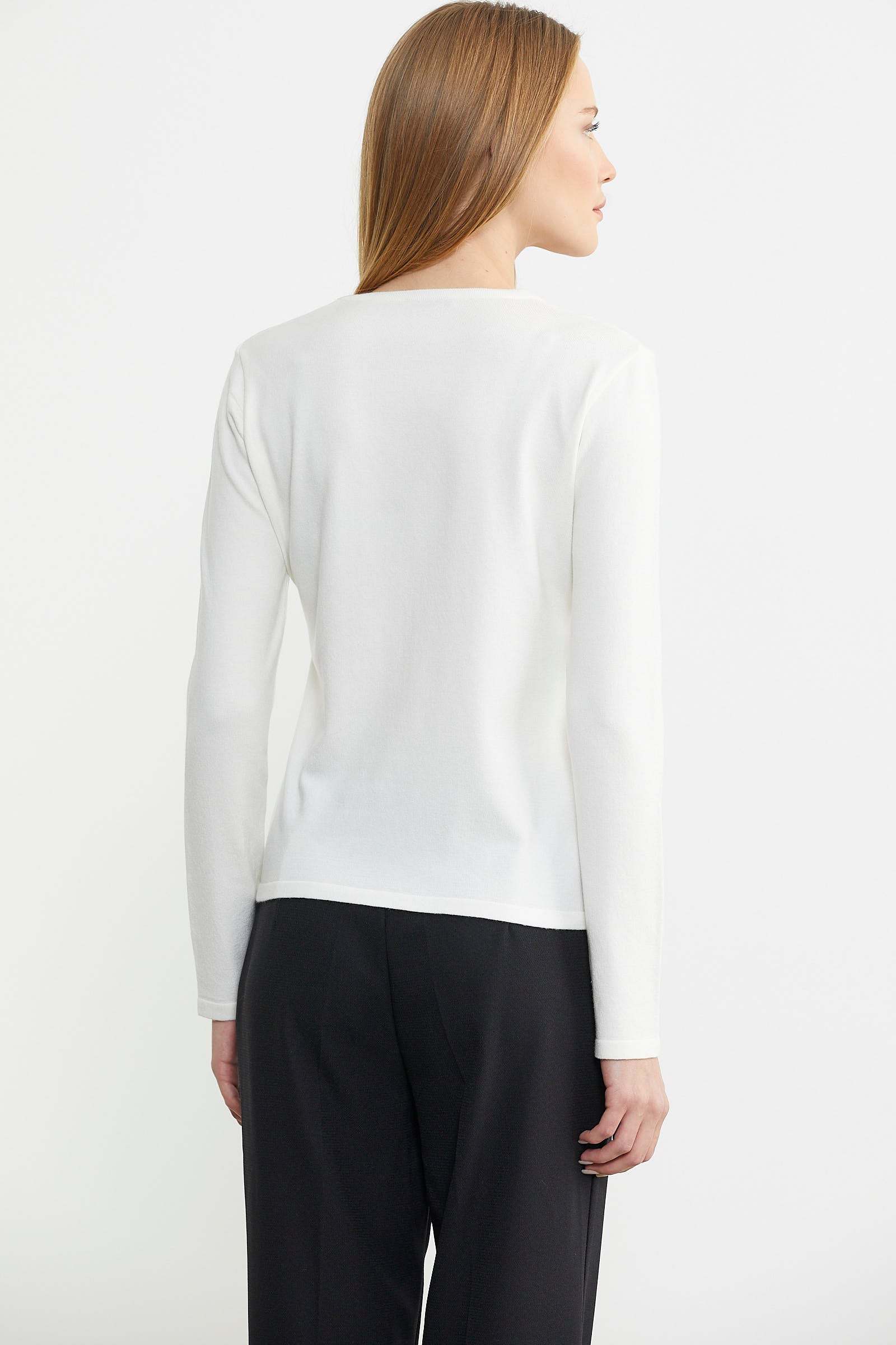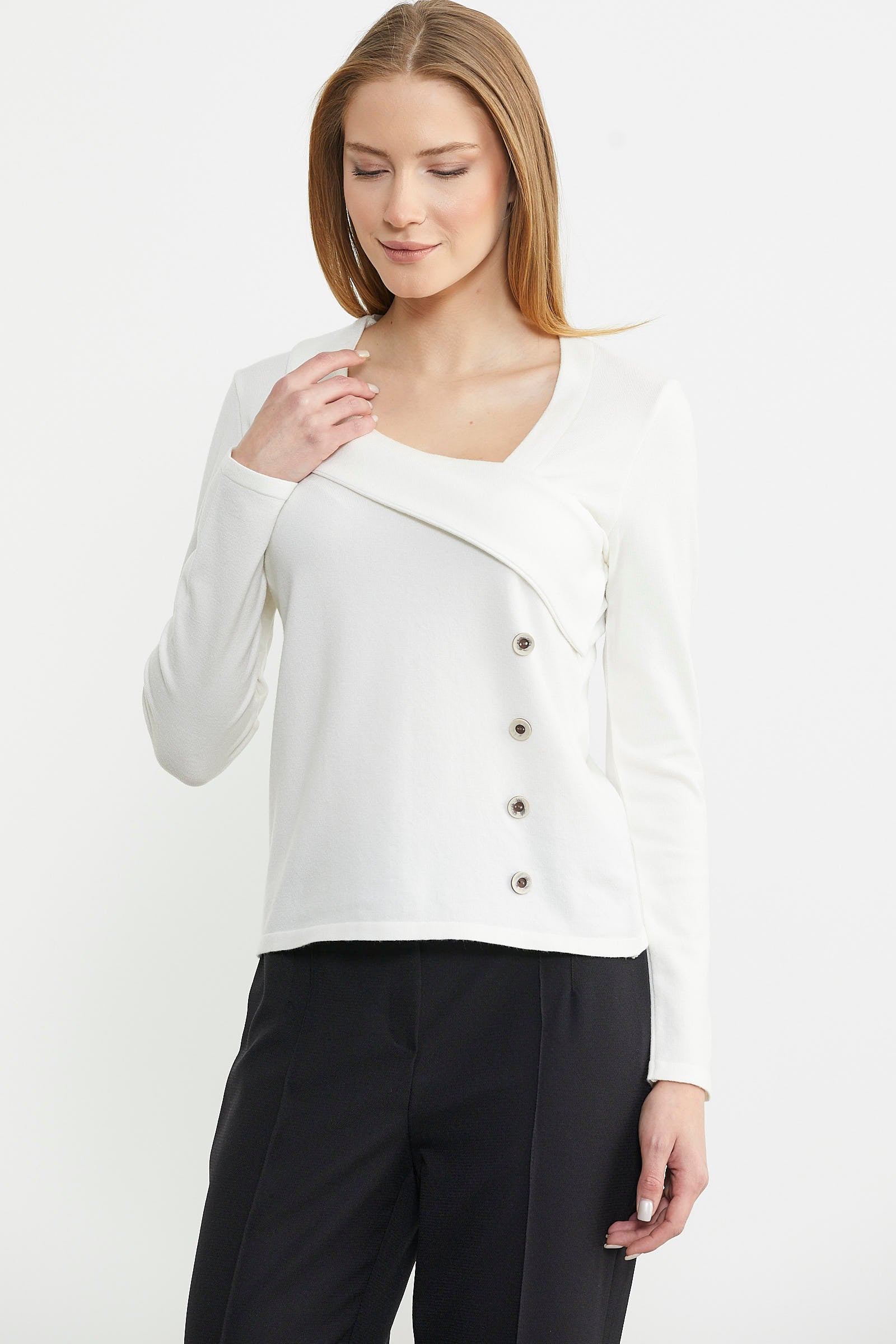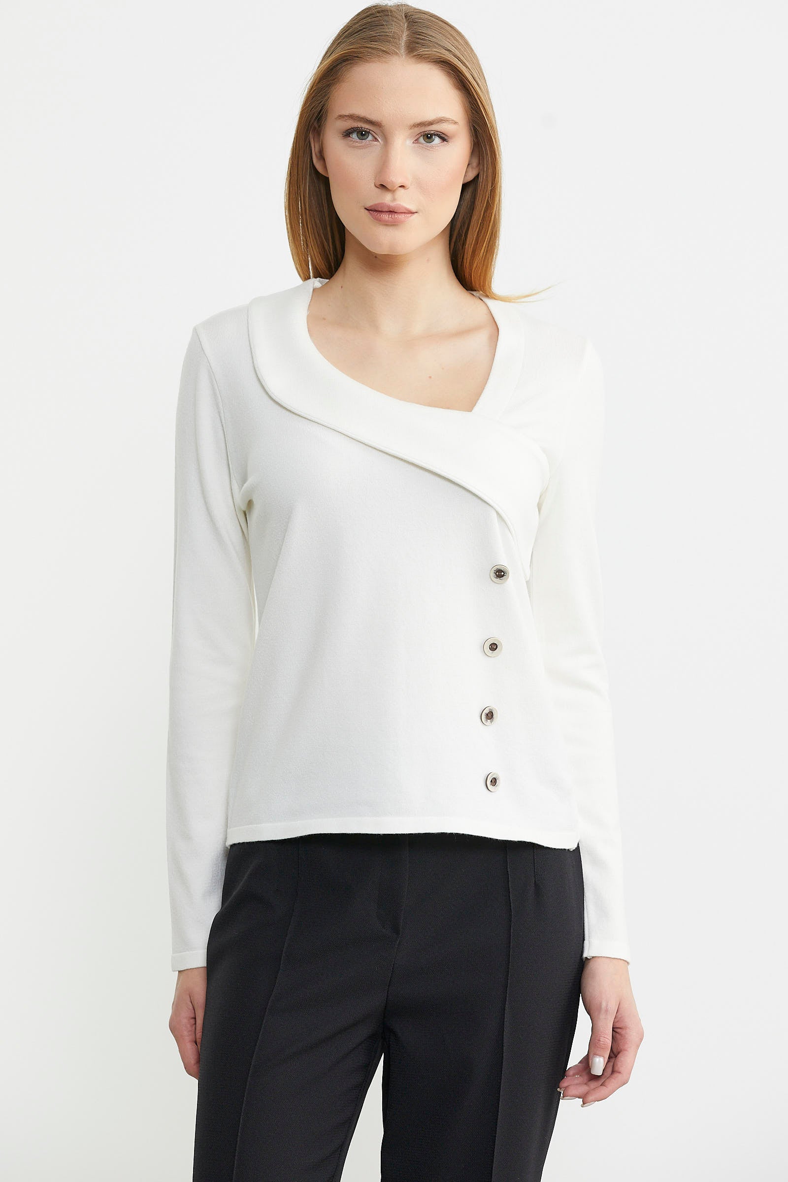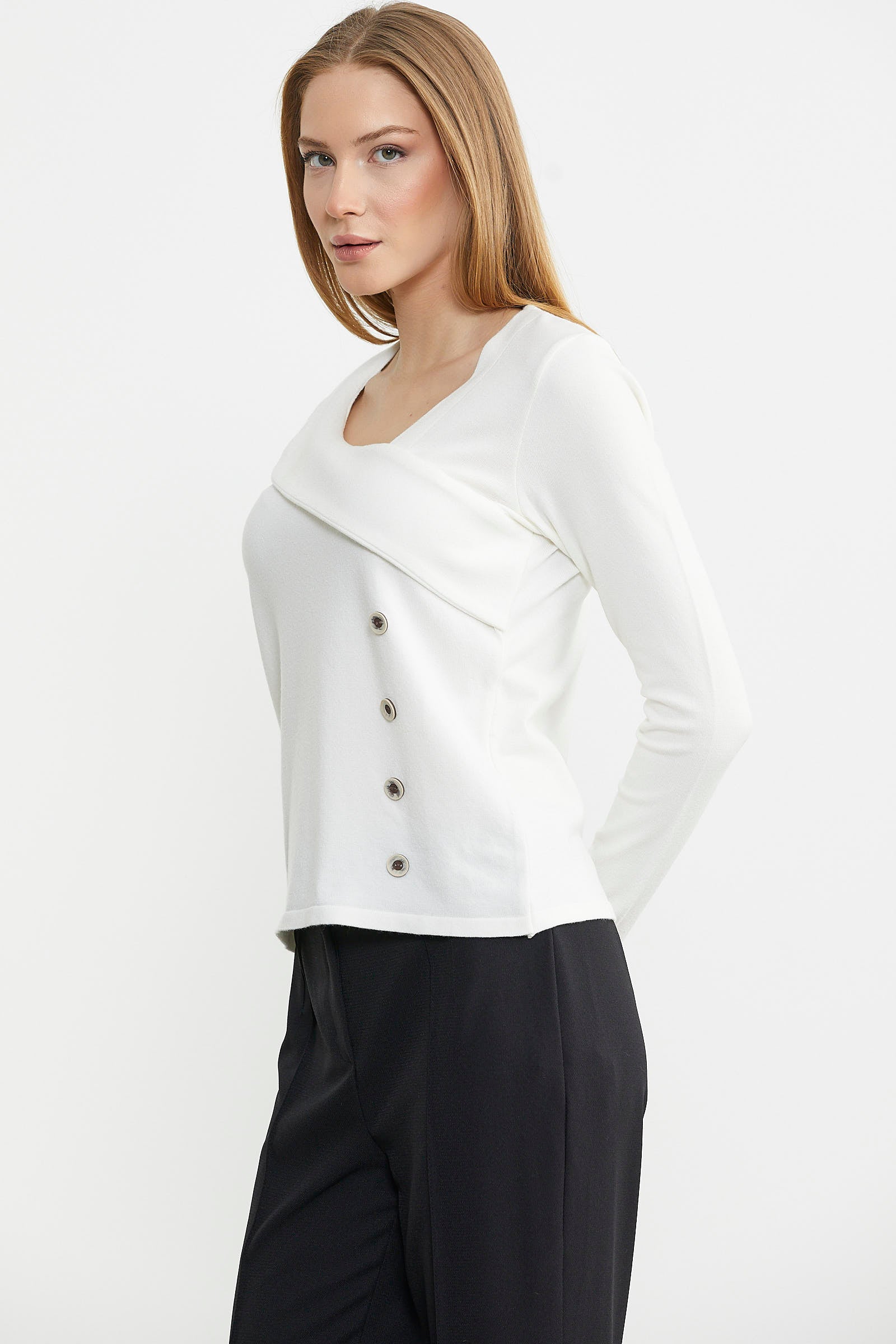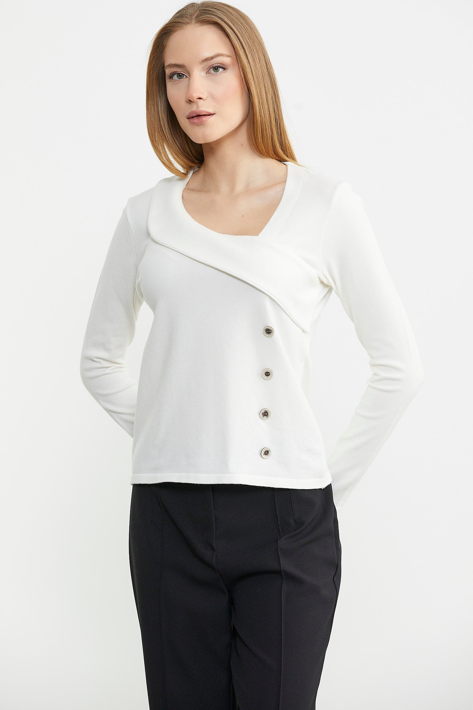 Asimetrik yaka tasarımıyla öne çıkan triko kazak modeline eklenen düğme detayları spor şık görünüm oluşturmaktadır.