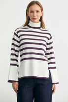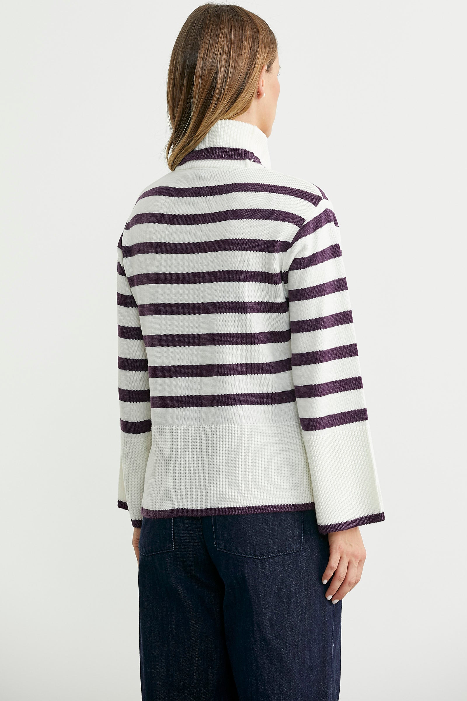 Balıkçı yaka, çizgili triko kazak yüksek oranda yün içermektedir. Geniş kol kesimli ve yanları yırtmaçlı olarak tasarlanmıştır.