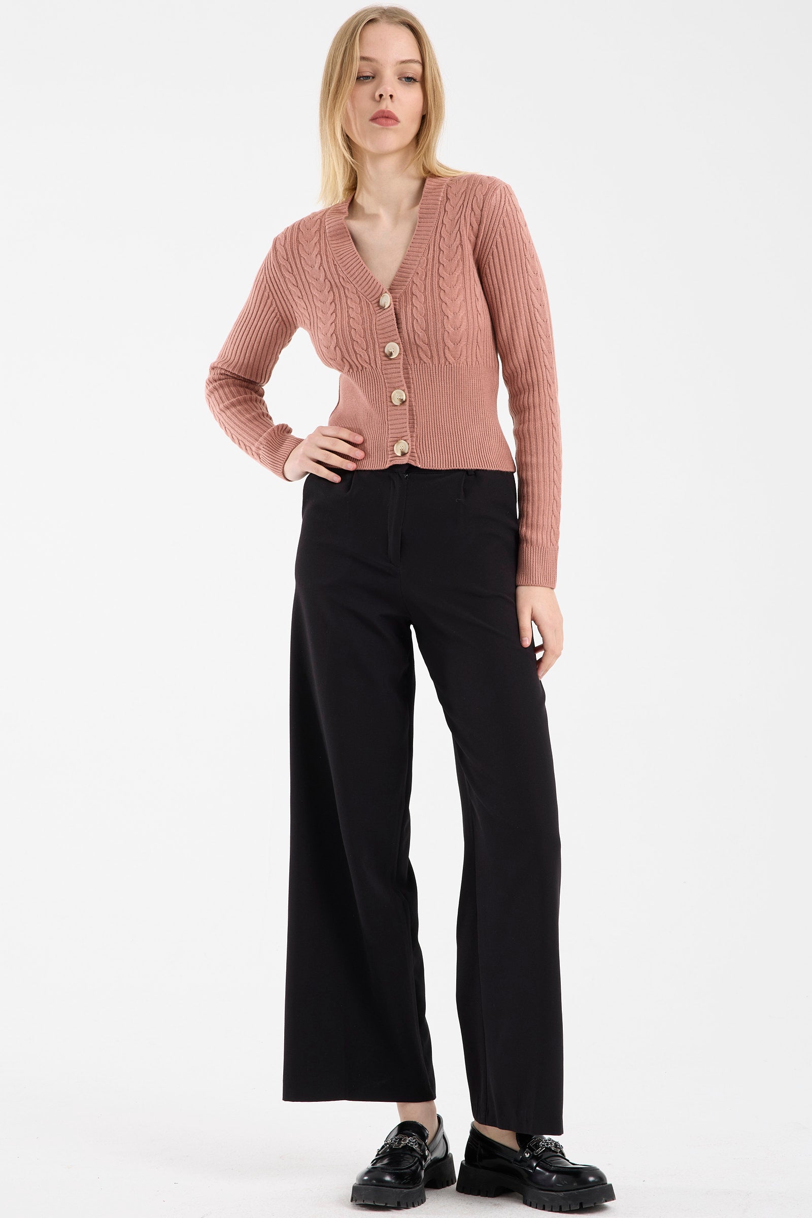 V yakalı, önü büyük düğme kapamalı kısa triko hırka. Bele oturan lastik örgü detayına sahip, saç örgü desenli.