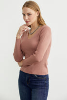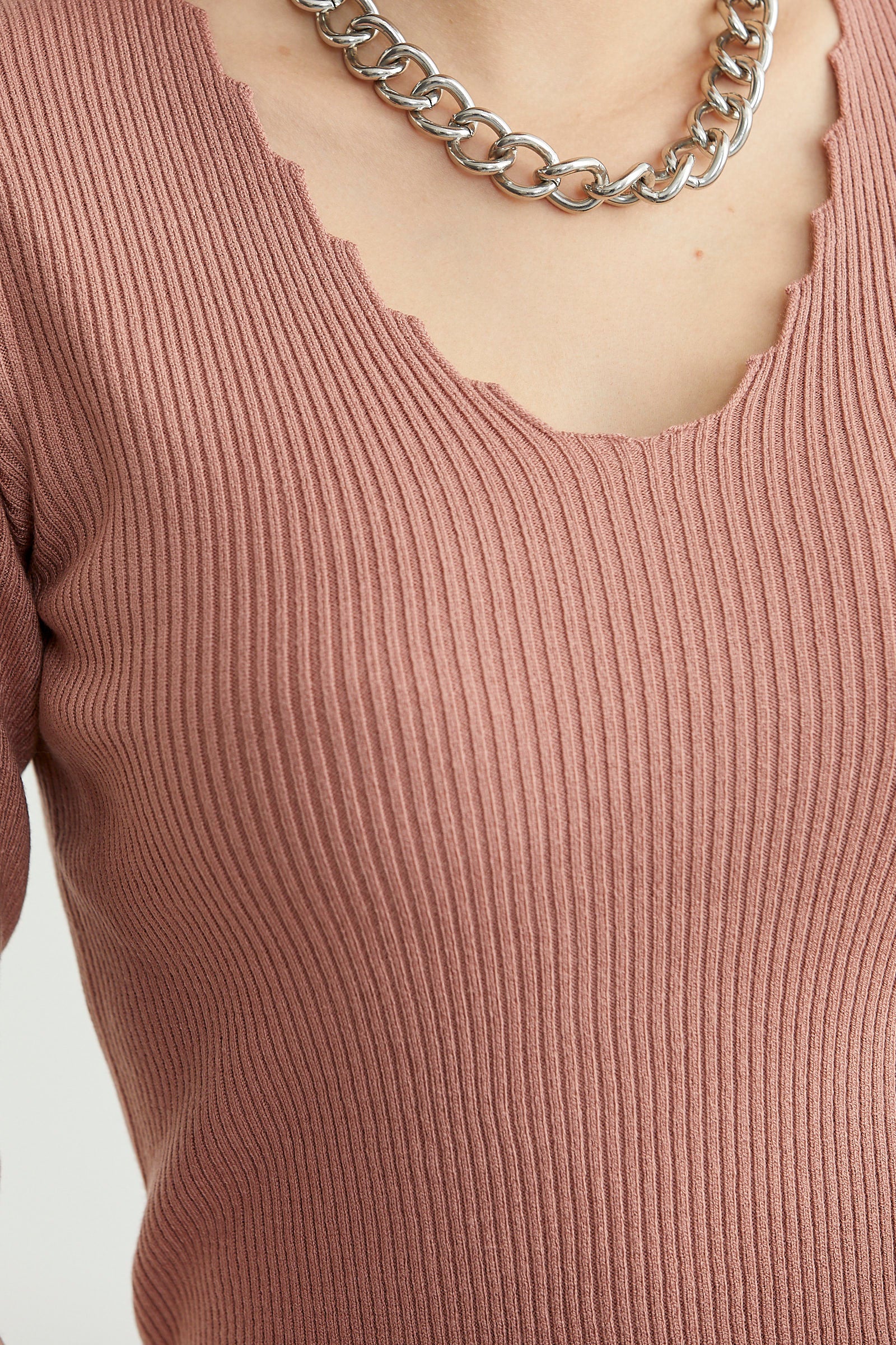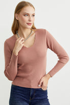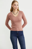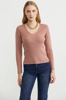 Fitilli Basic V Yaka Triko Kazak - Gül