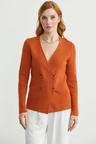 V yakalı, maskülen, kruvaze triko ceket. Vücuda oturan klasik kesim, uzun kollu yumuşak dokulu.