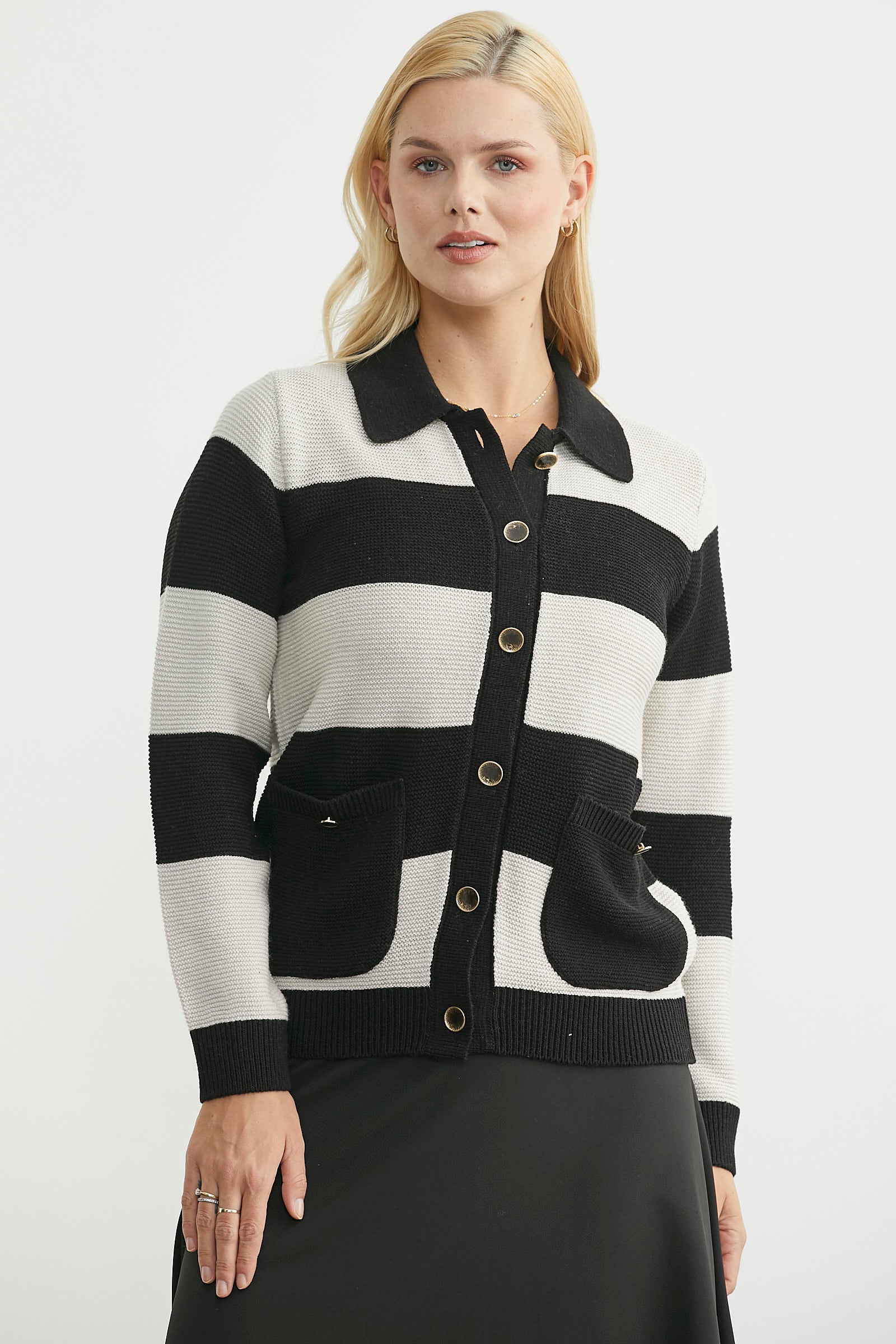 Yakası lastik örgülü, önü düğmeli, rahat kalıp triko hırka. Çizgili ve desenlidir.