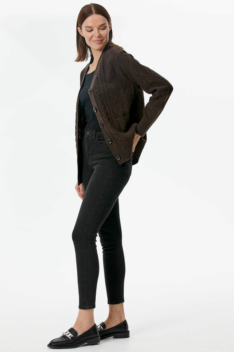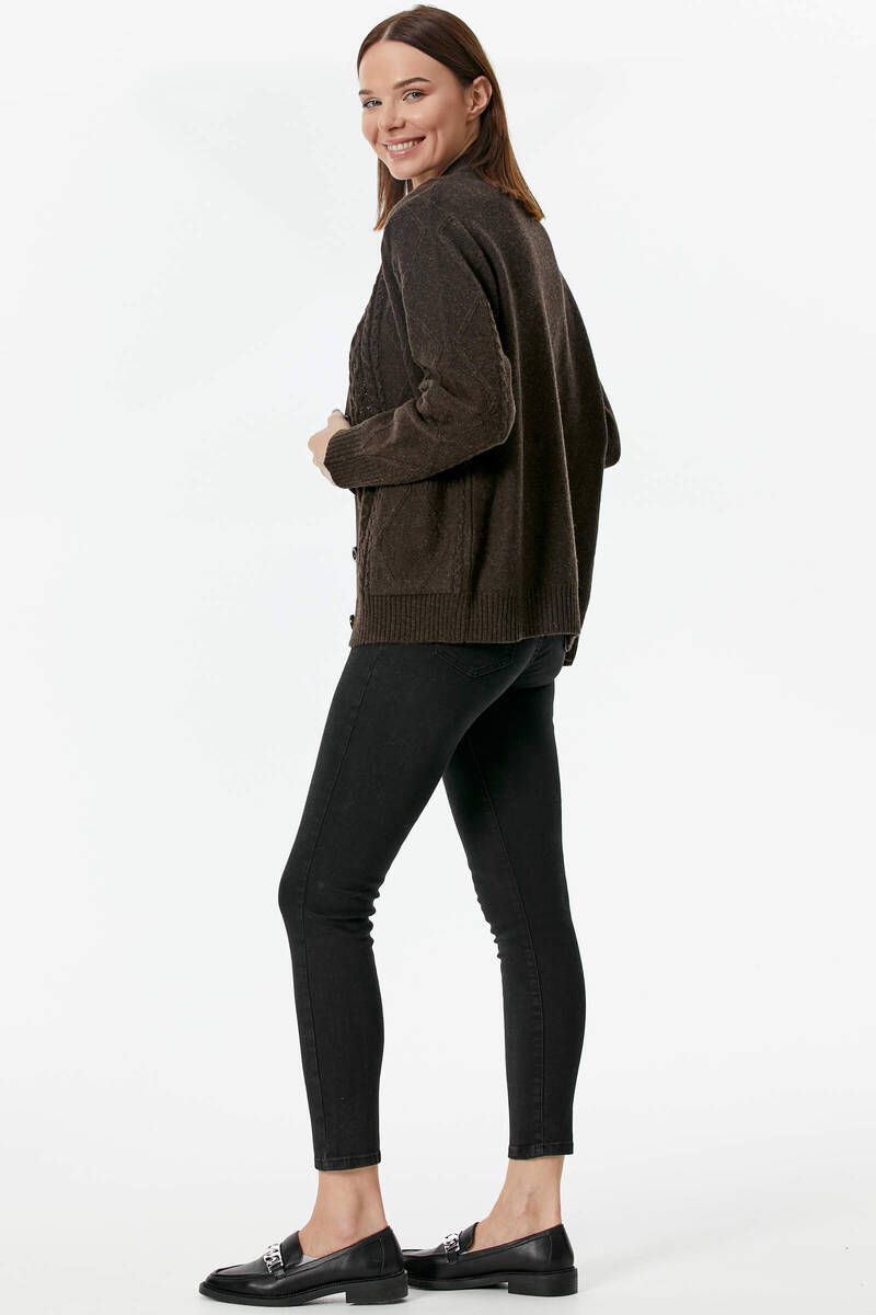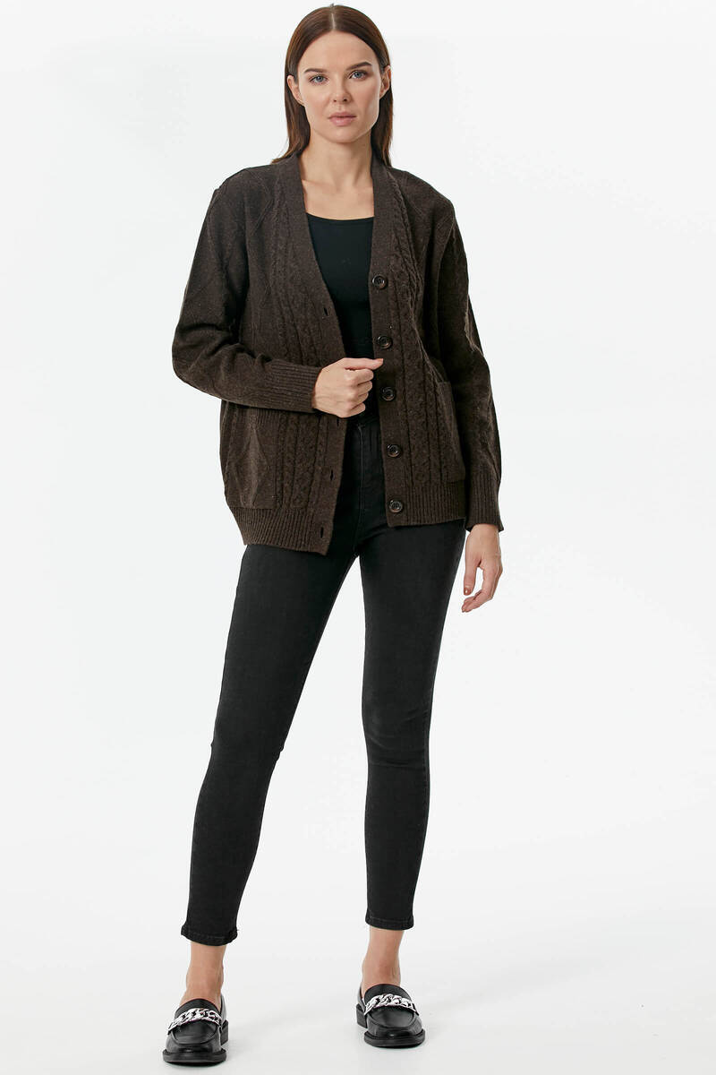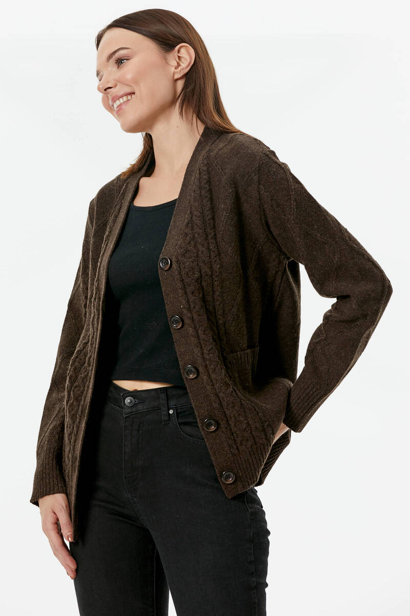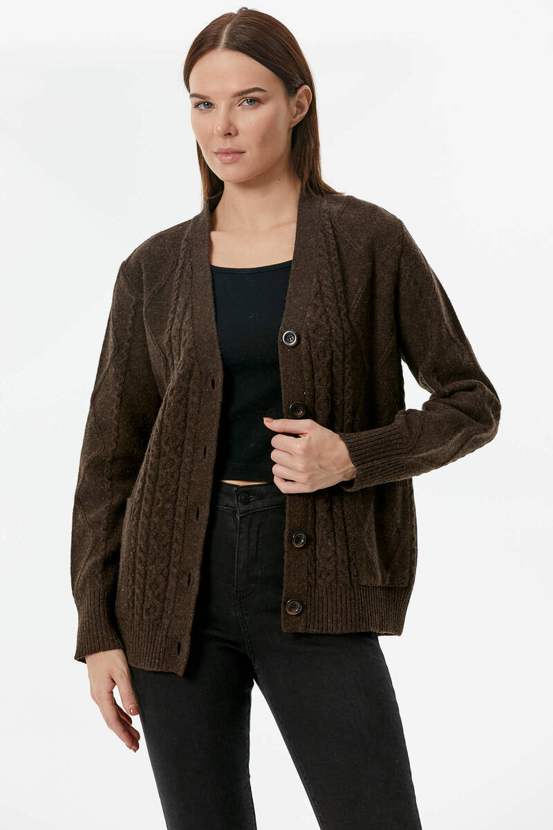 Knitwear cardigan made of wool blended yarn with a v-neck, long sleeves and button closure for practical use.