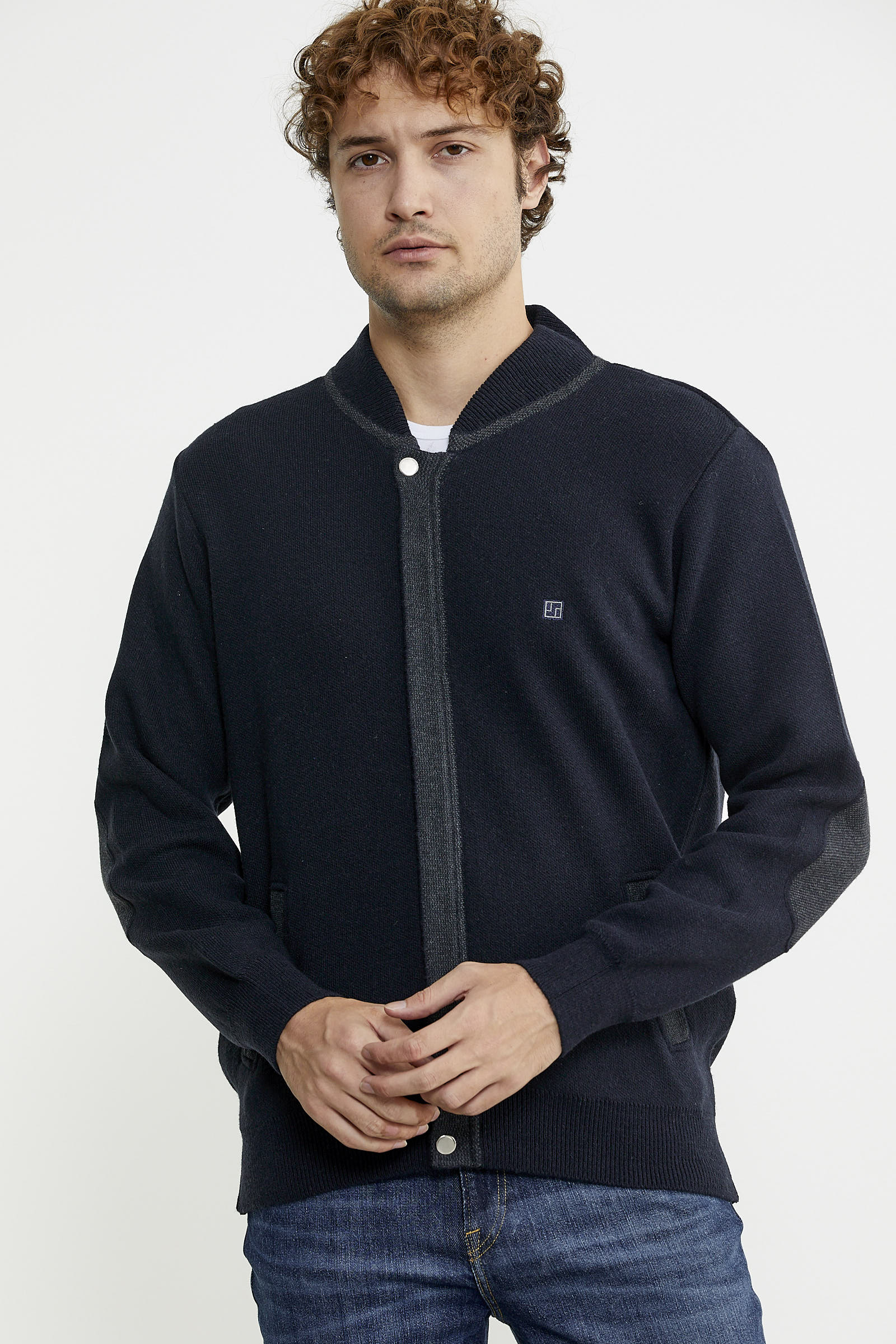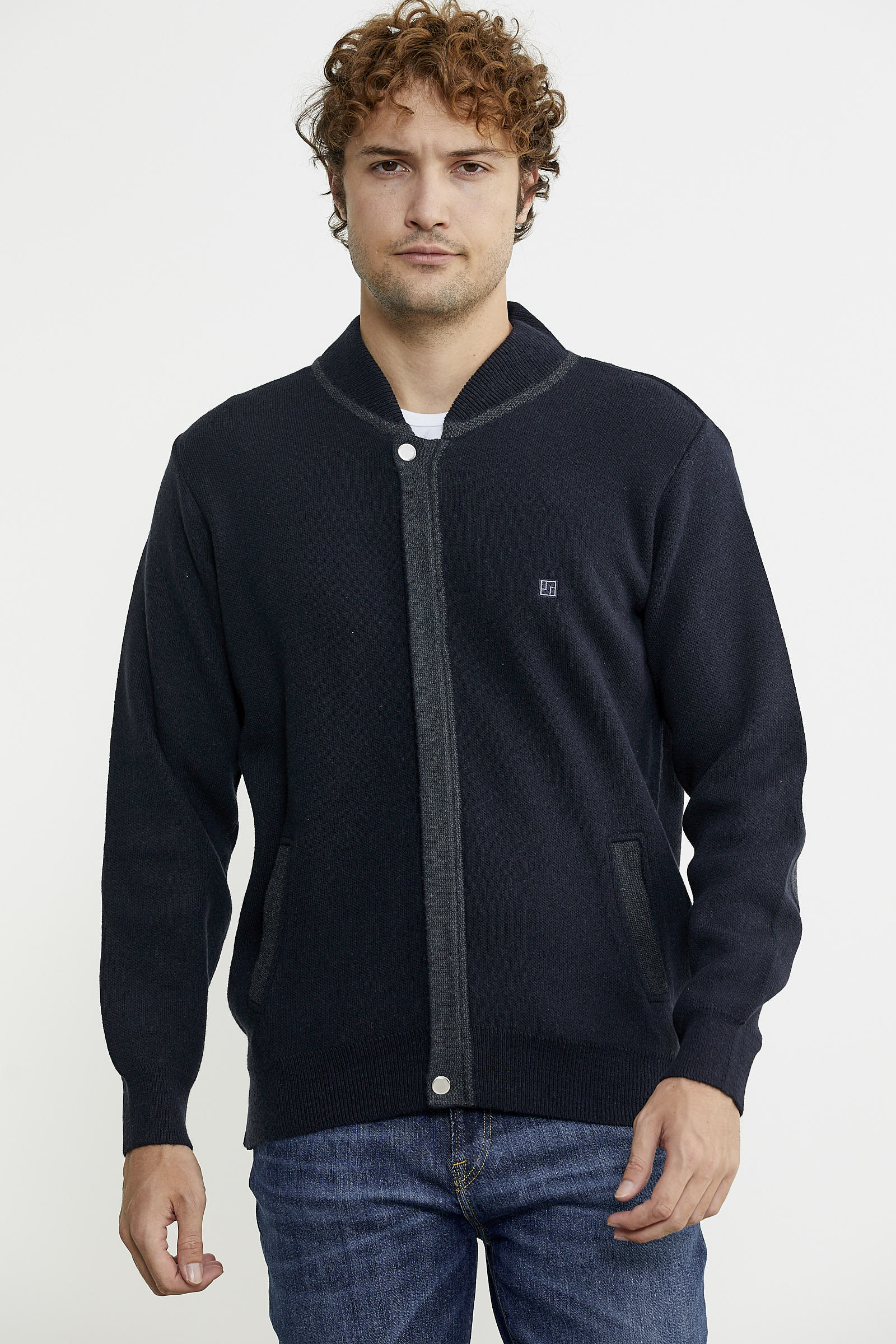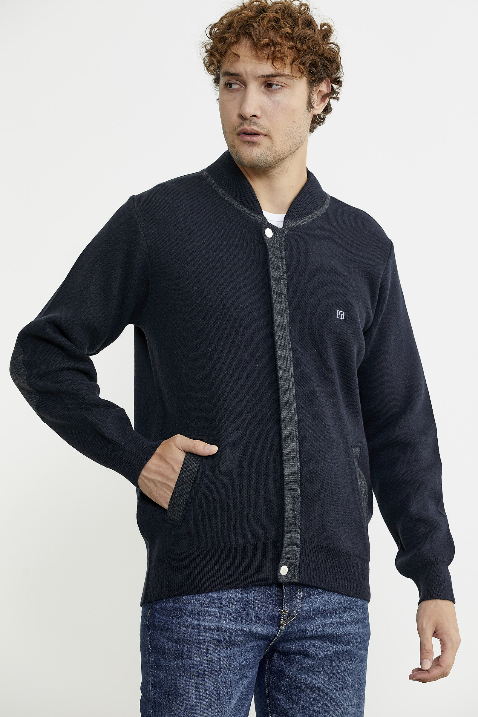 Color Combination Pocket Wool Knitwear Coat - Navy Blue - Dark Grey