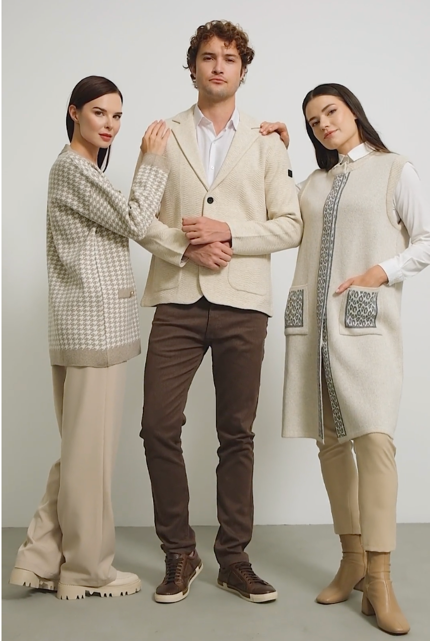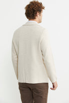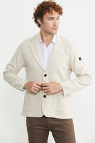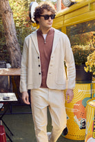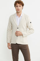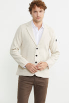 Button-down knit blazer jacket with a high wool content. Completed with motif and crest details.