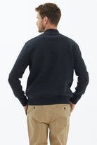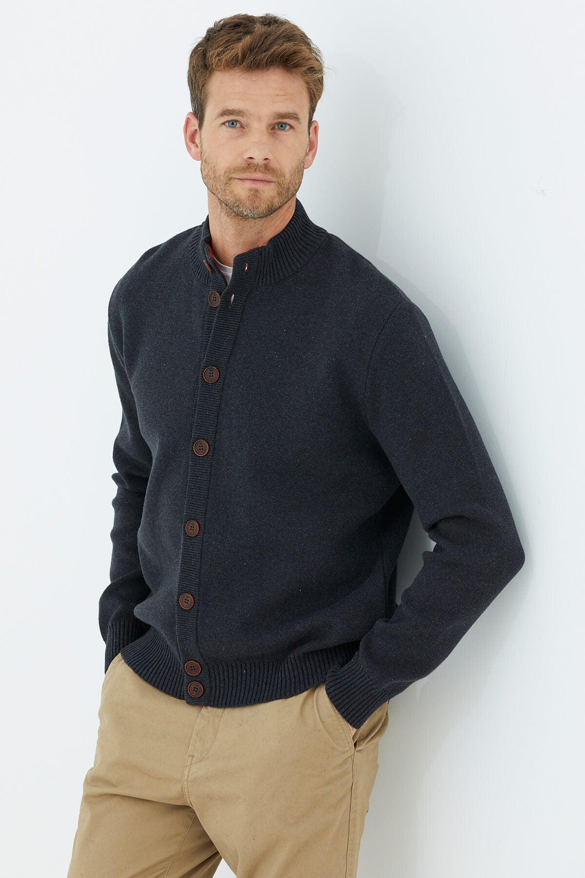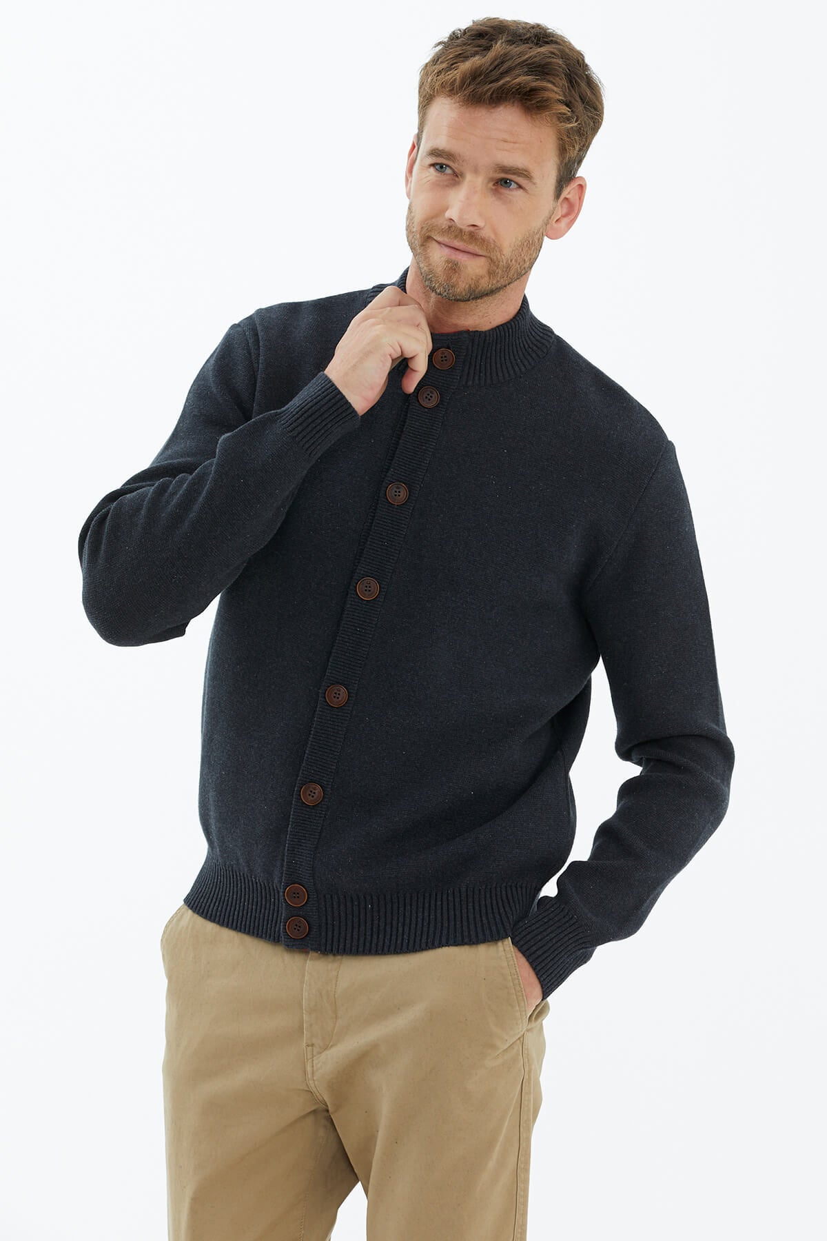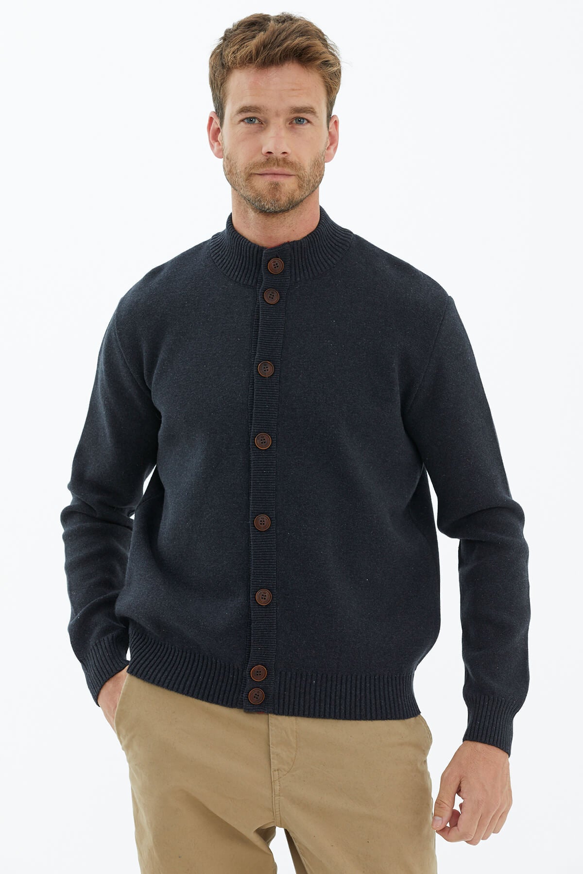 The cardigan with a stand-up collar, long sleeves, ribbing on the collar, cuffs and hem offers ease of use with its full-length button closure.
