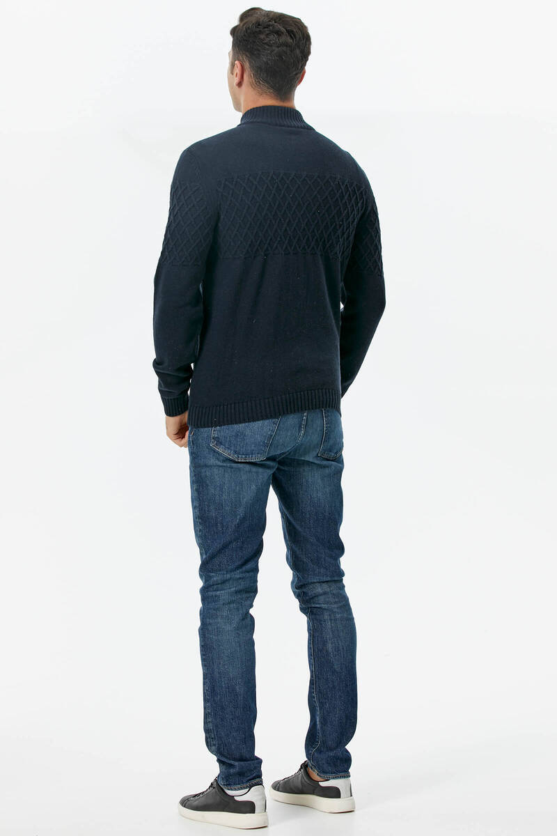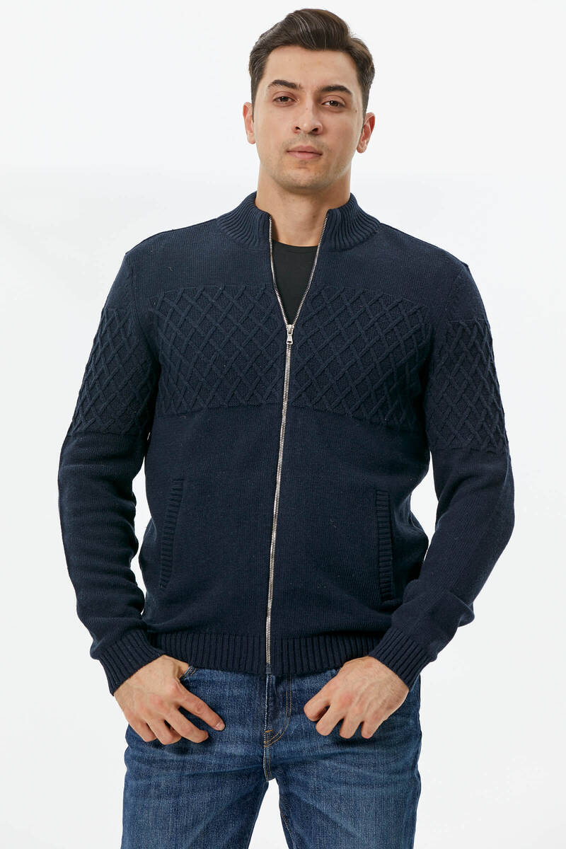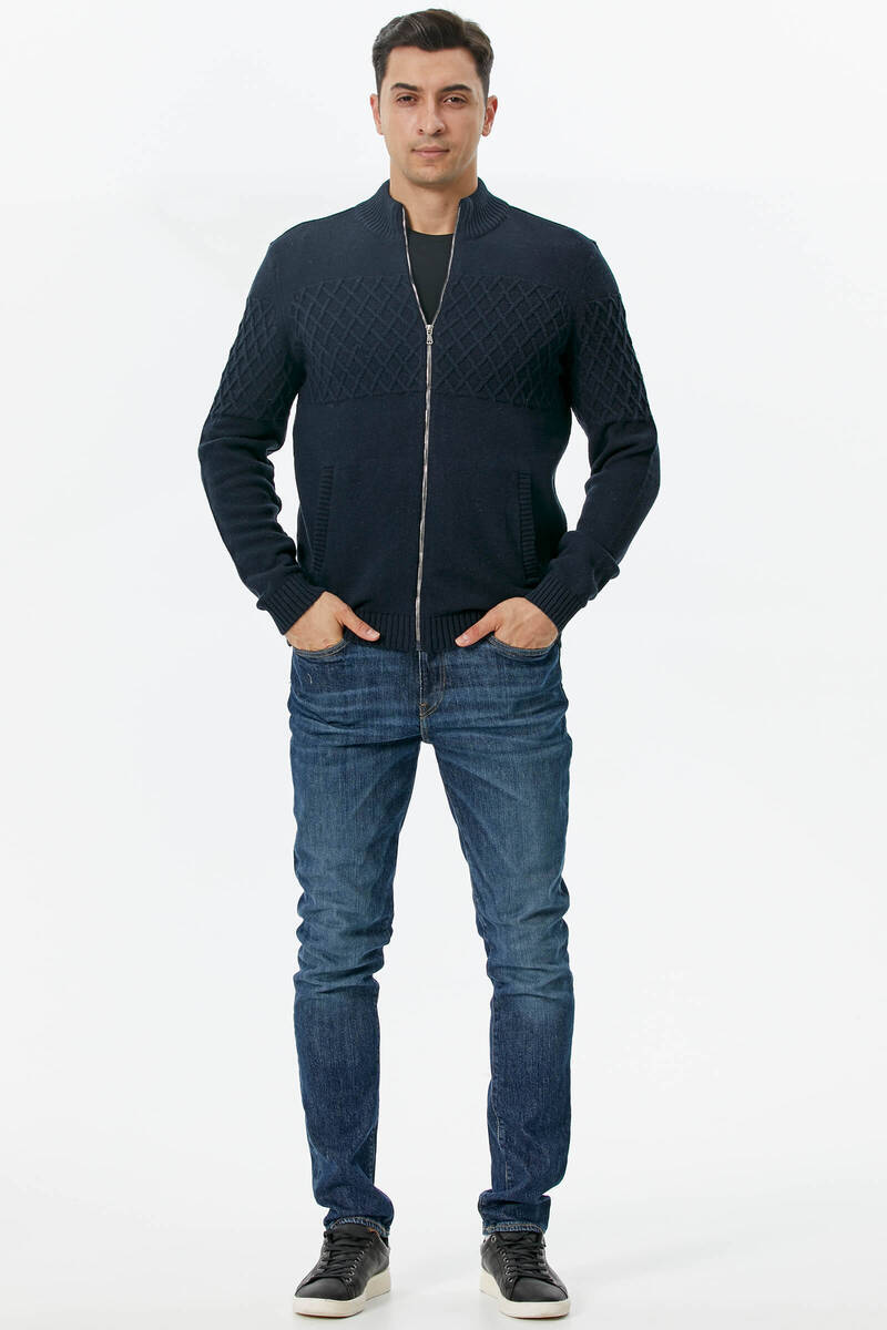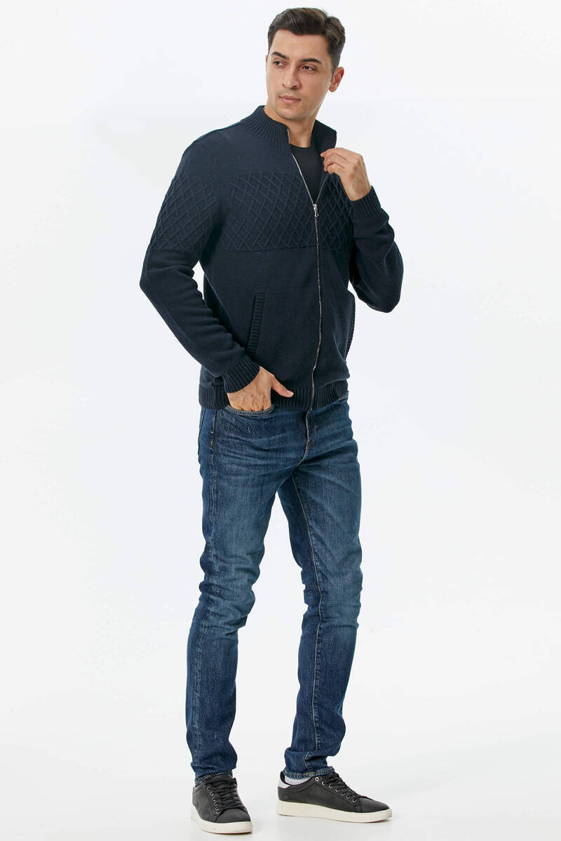 The cardigan, produced from wool blended yarn, becomes indispensable for combinations with its comfortable structure and stylish design. It promises an impressive stance with its standard pattern and stand-up collar model. It offers practical use with its zipper that can be opened and closed easily.
