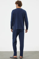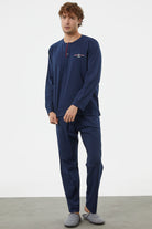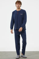 Double Color Buttoned Pajama Set with Placket - Navy Blue