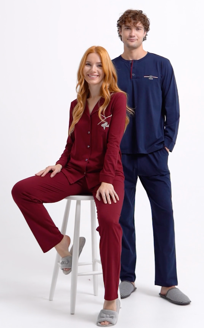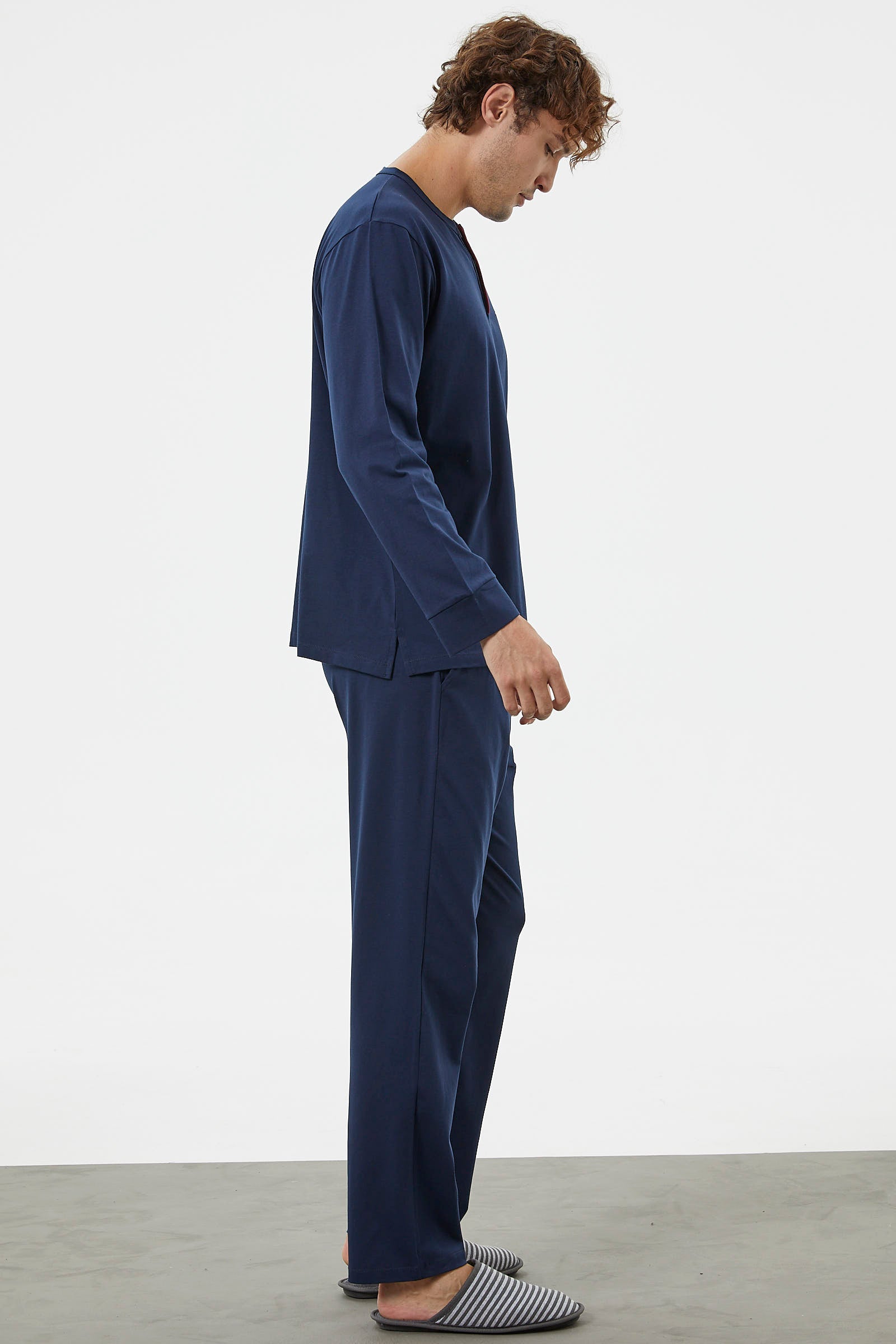 The double pajama set, consisting of a buttoned, crew neck, long-sleeved plain top and pocketed bottom, with color details on the collar and cuffs, is designed to suit the comfort you are looking for in your home wear.