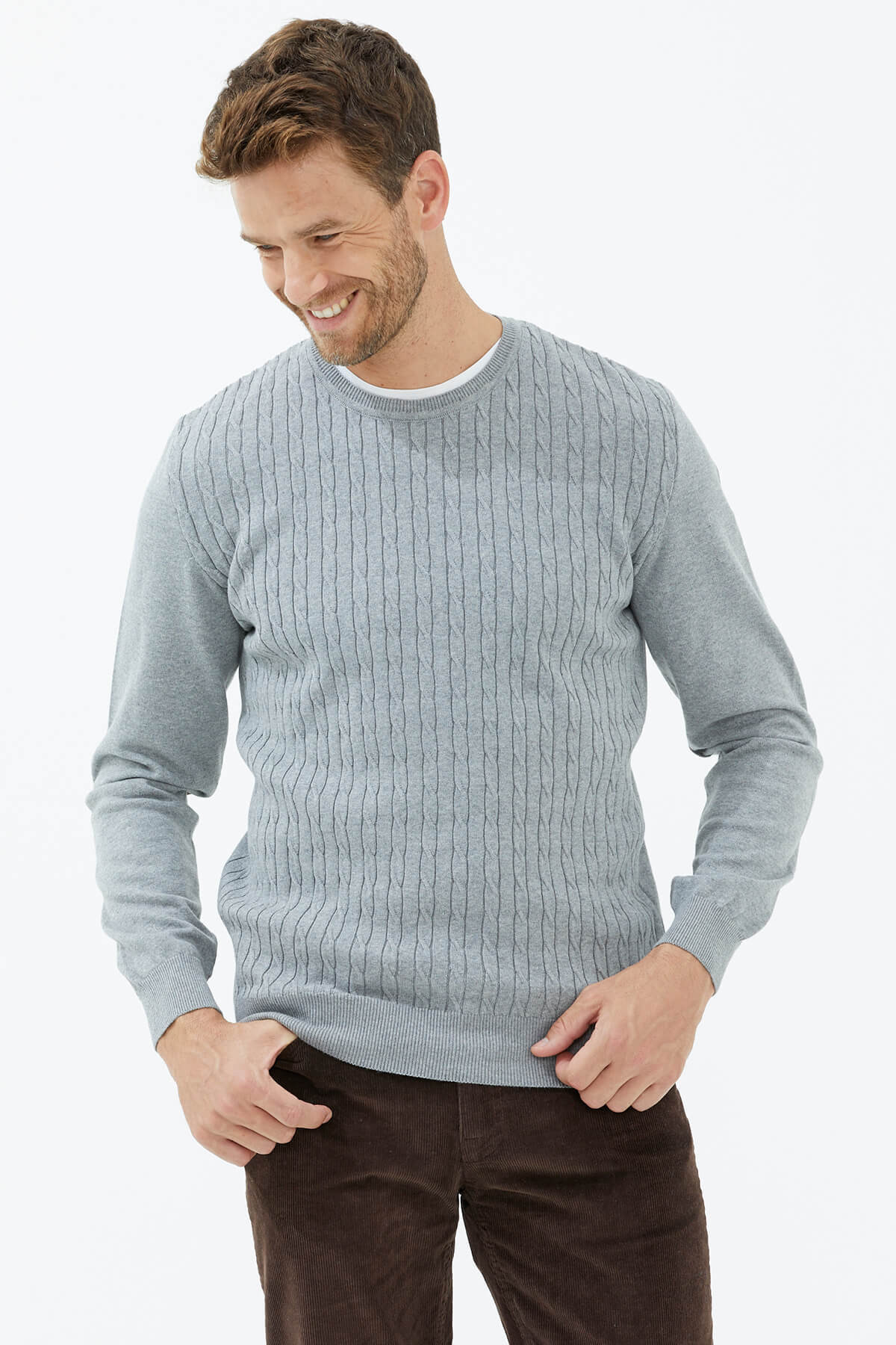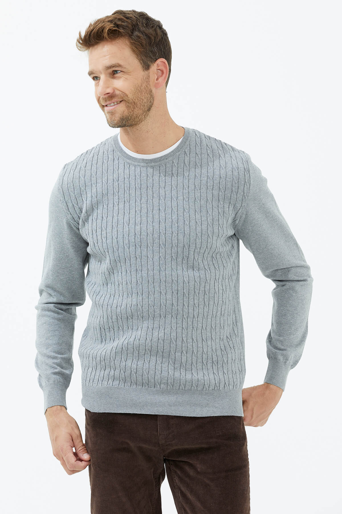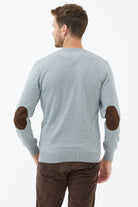 Made from soft cotton, the sweater has a cable knit pattern, a crew neck, long sleeves, suede details on the elbows, and elasticated collar, cuffs and hem.