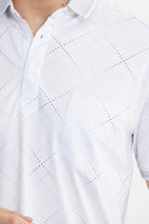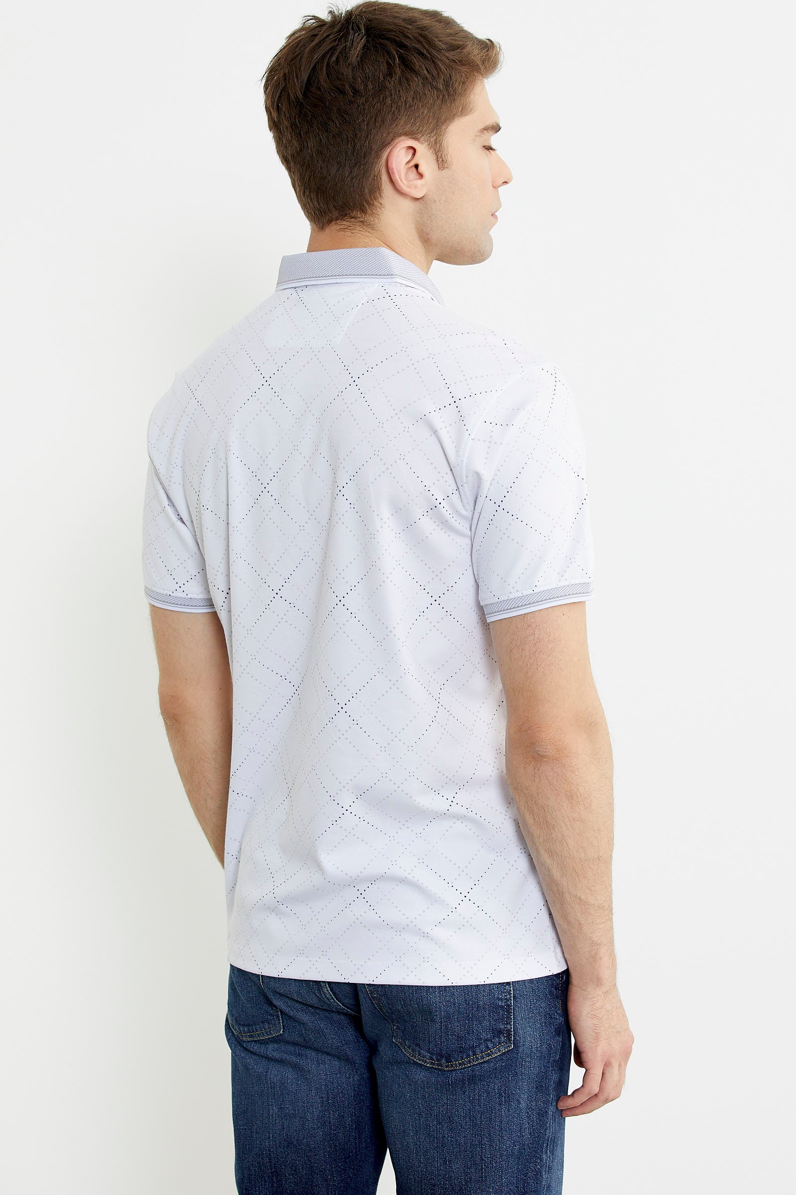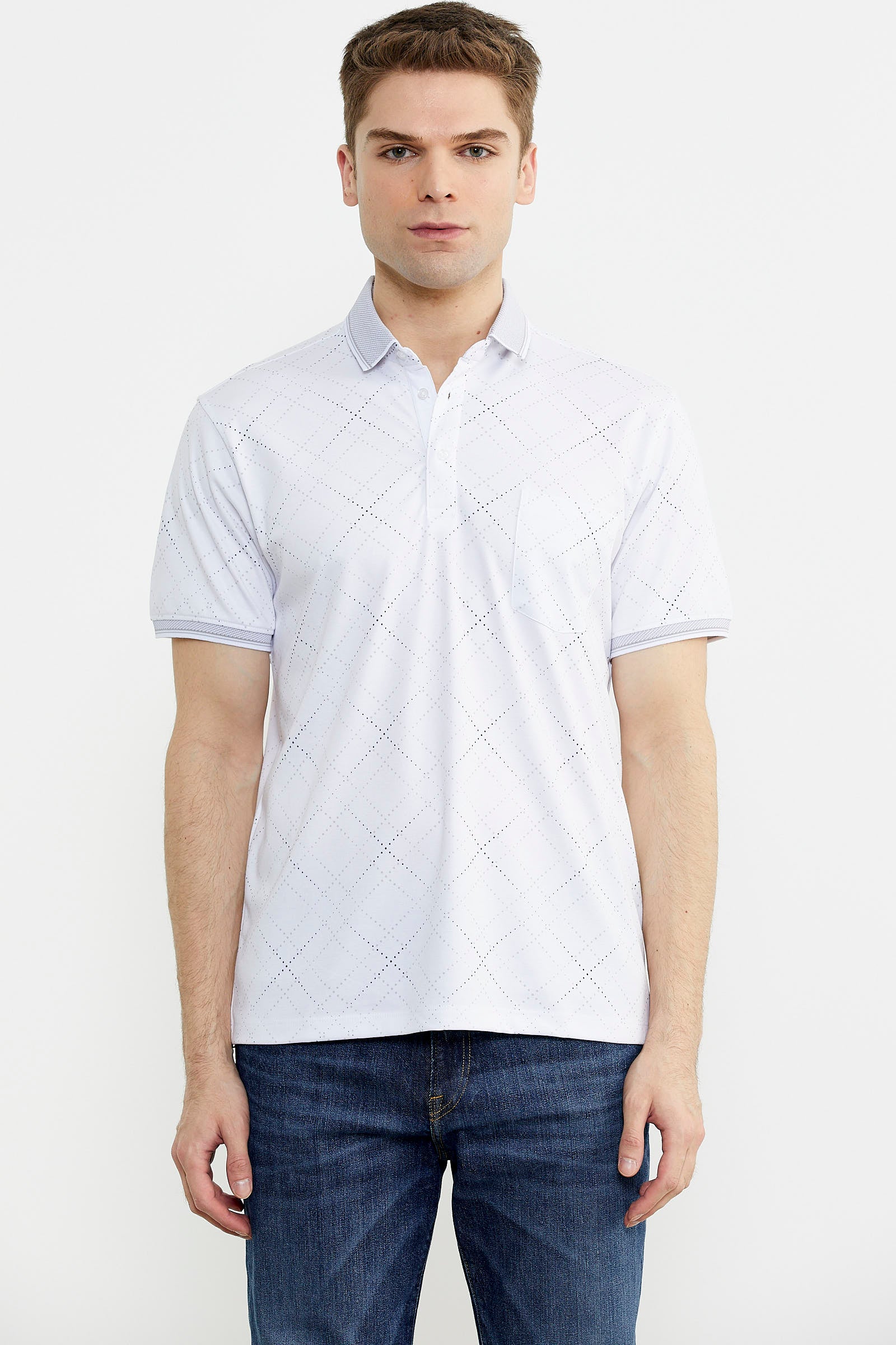 The t-shirt is made of self-printed fabric, has a polo collar and a standard fit. Ribbed detail is used on the collar and sleeves, and a chest pocket is added to the model.