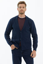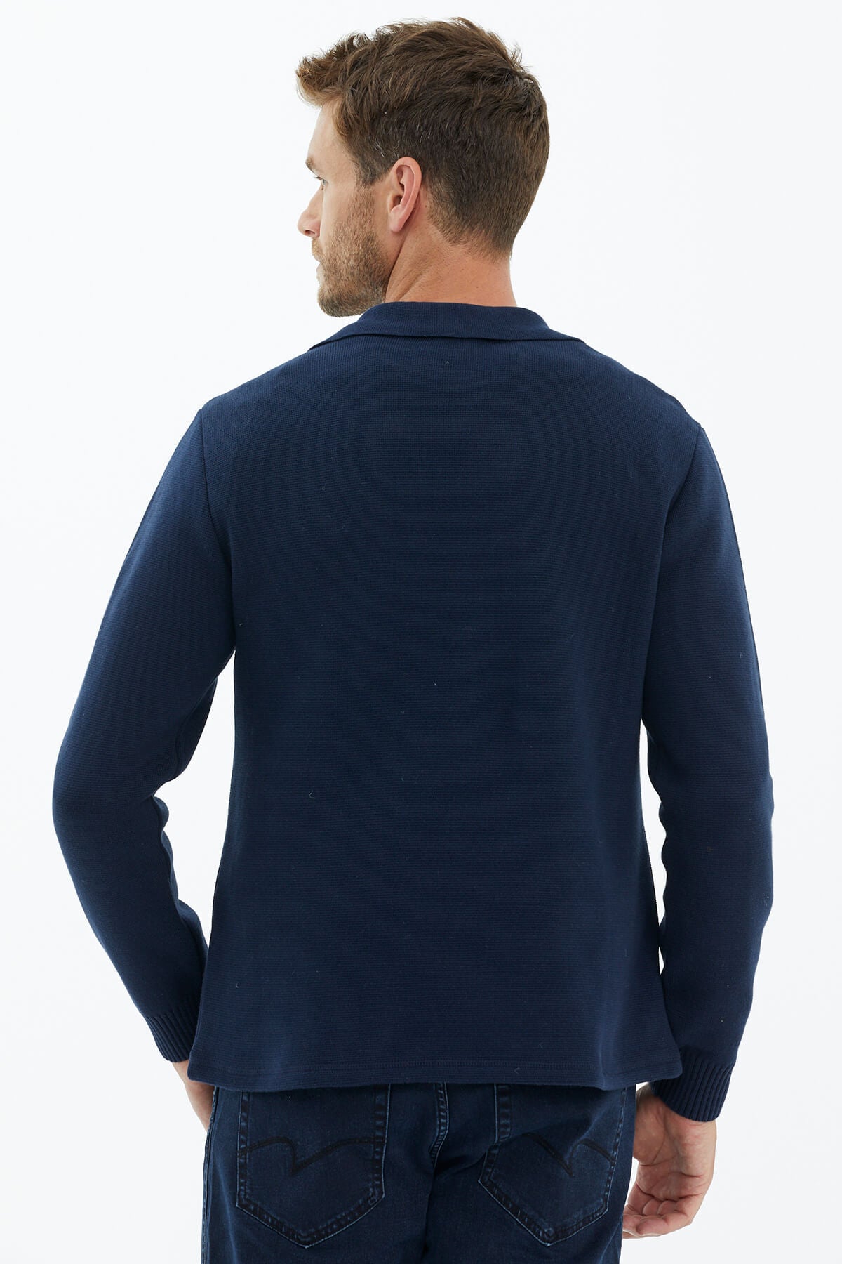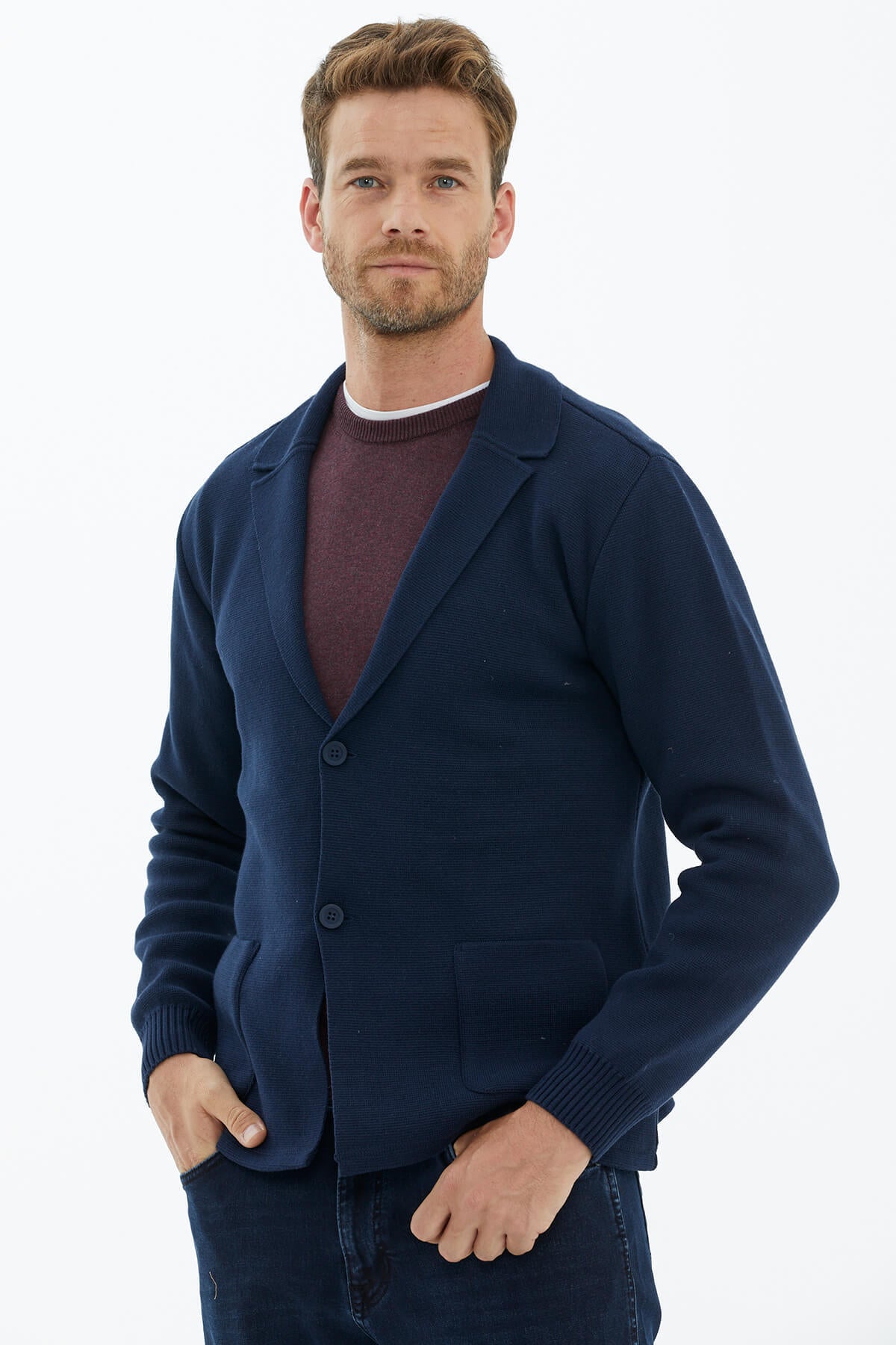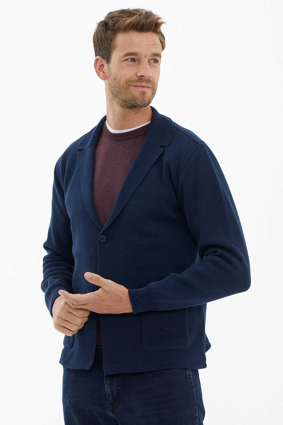 Knitwear jacket made of cotton yarn with long sleeves, ribbed cuffs, pocket detail and button closure for practical use.