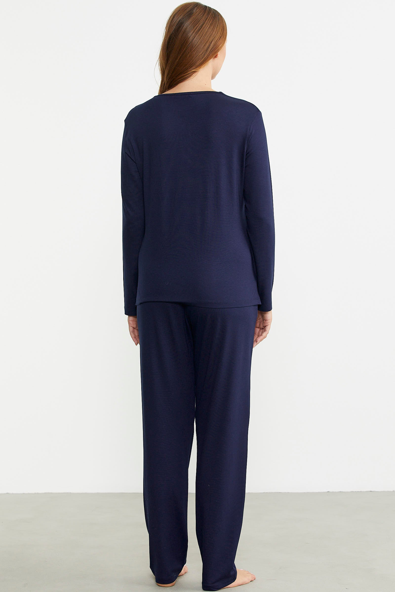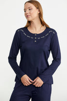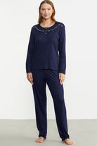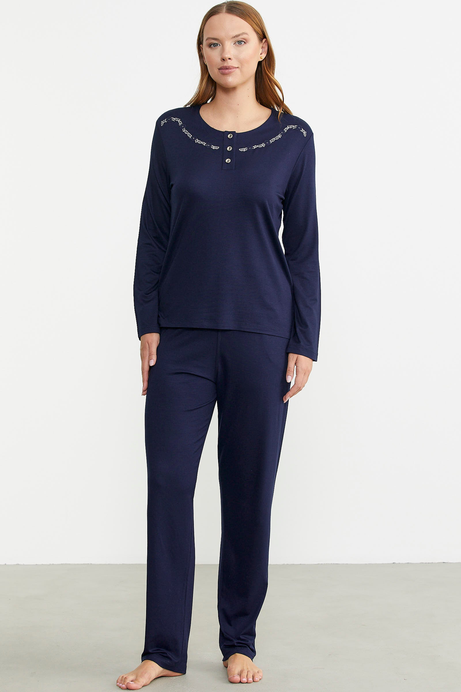 Offering comfort with its flexible texture, the long-sleeve pajama set with embroidery and button details has a comfortable fit.