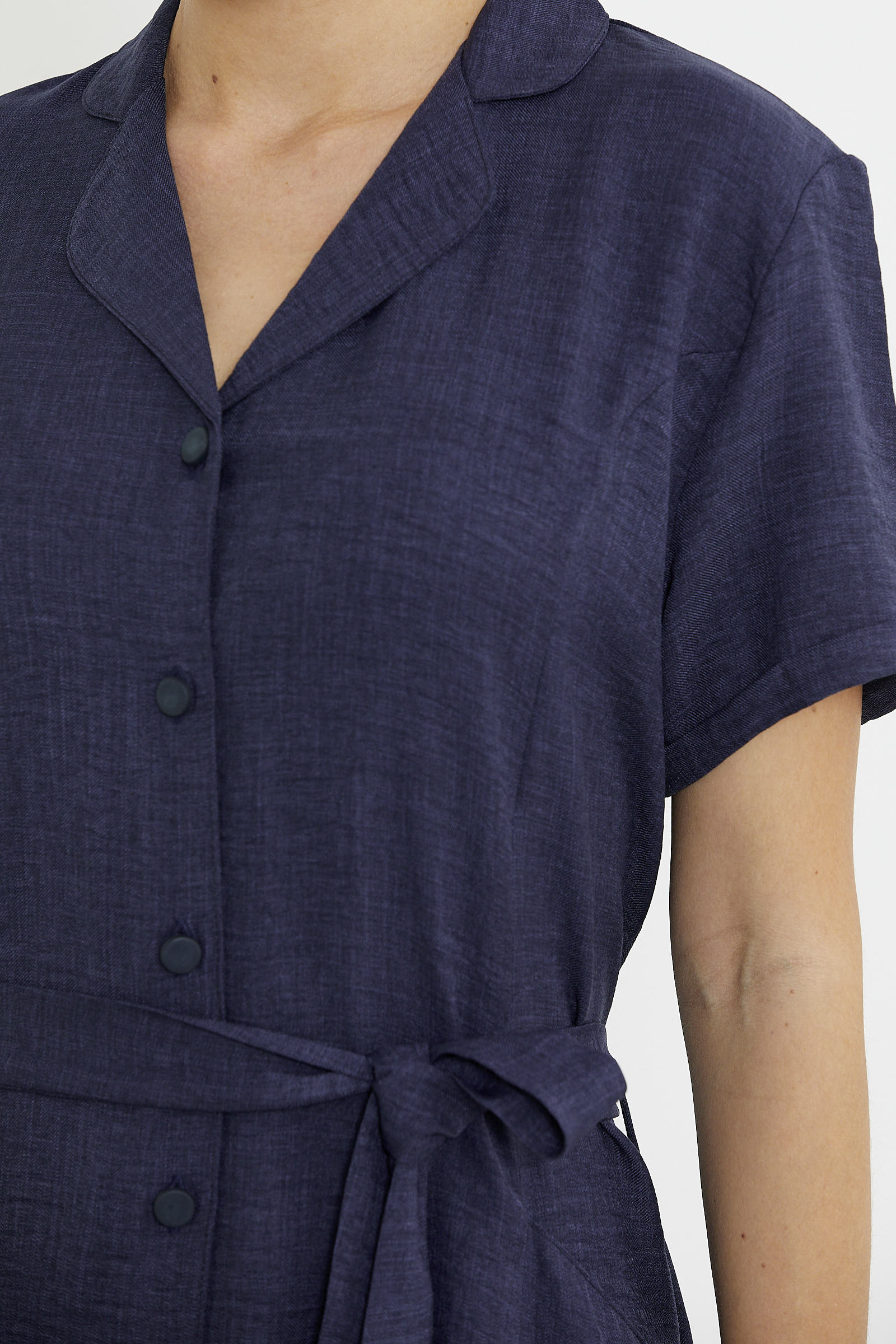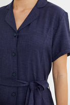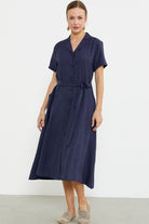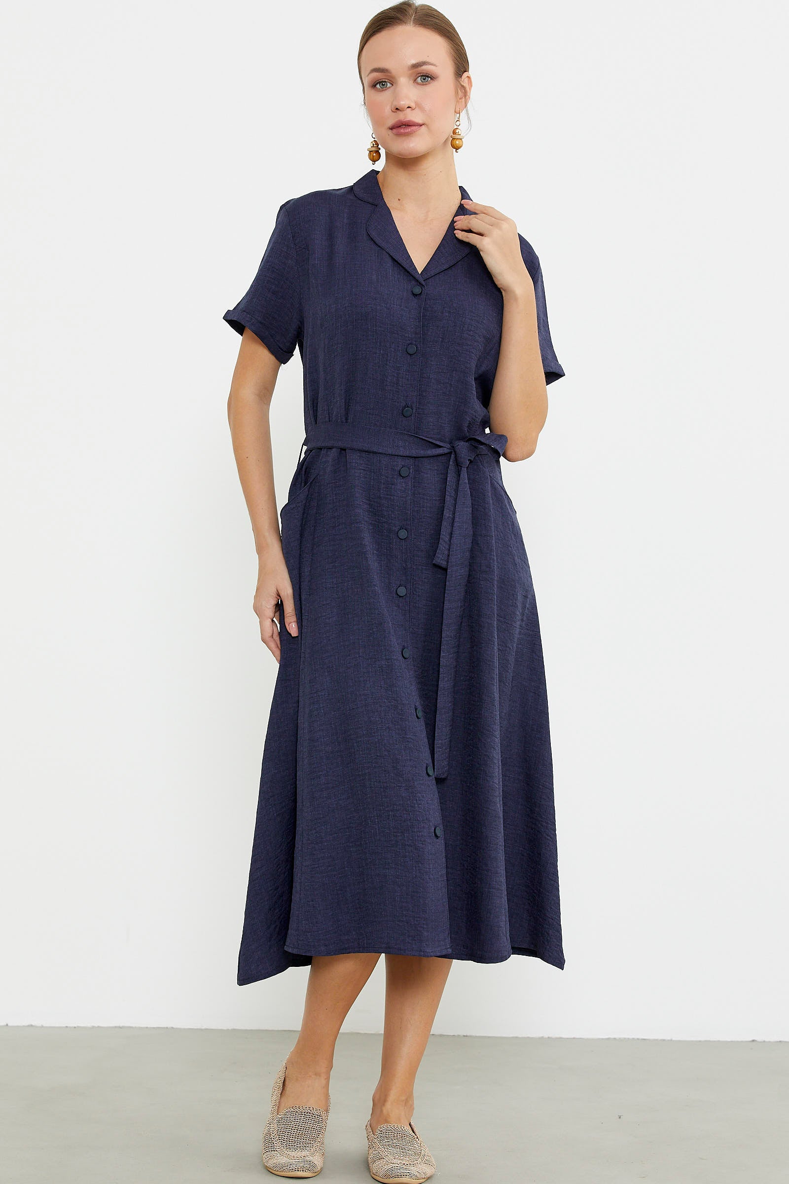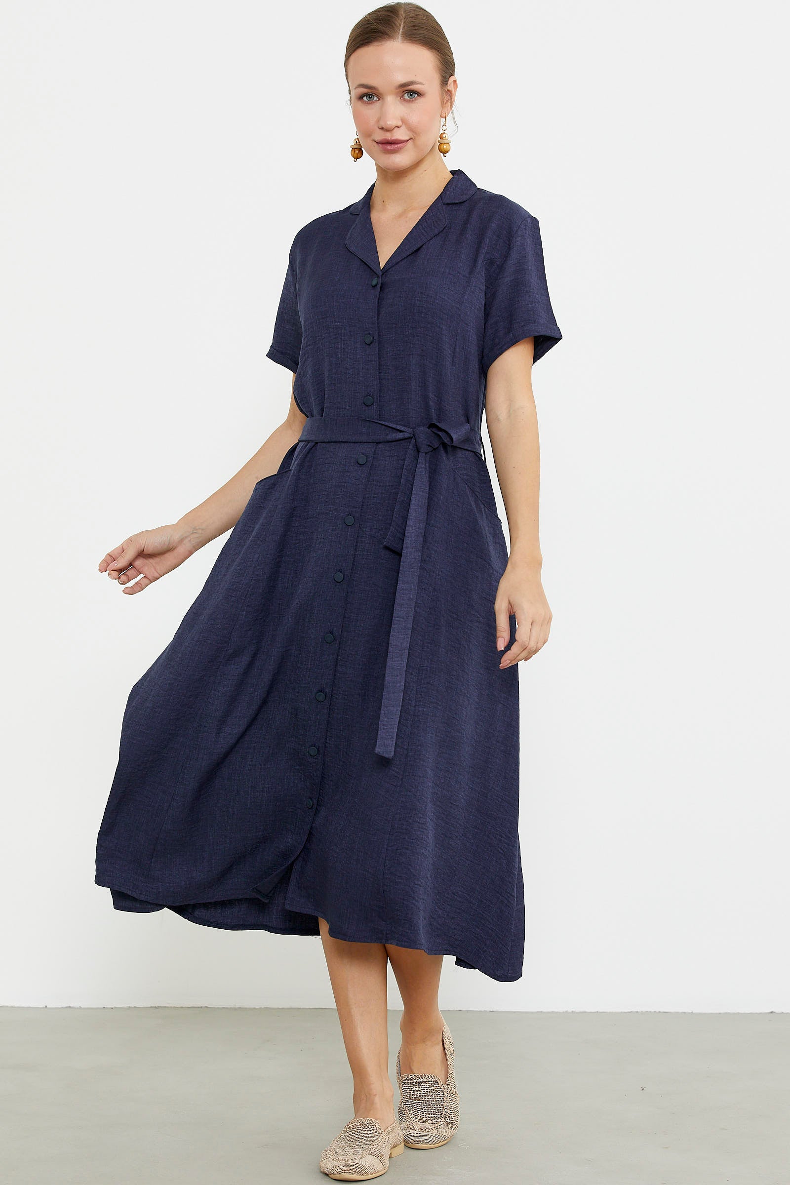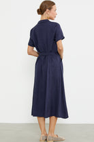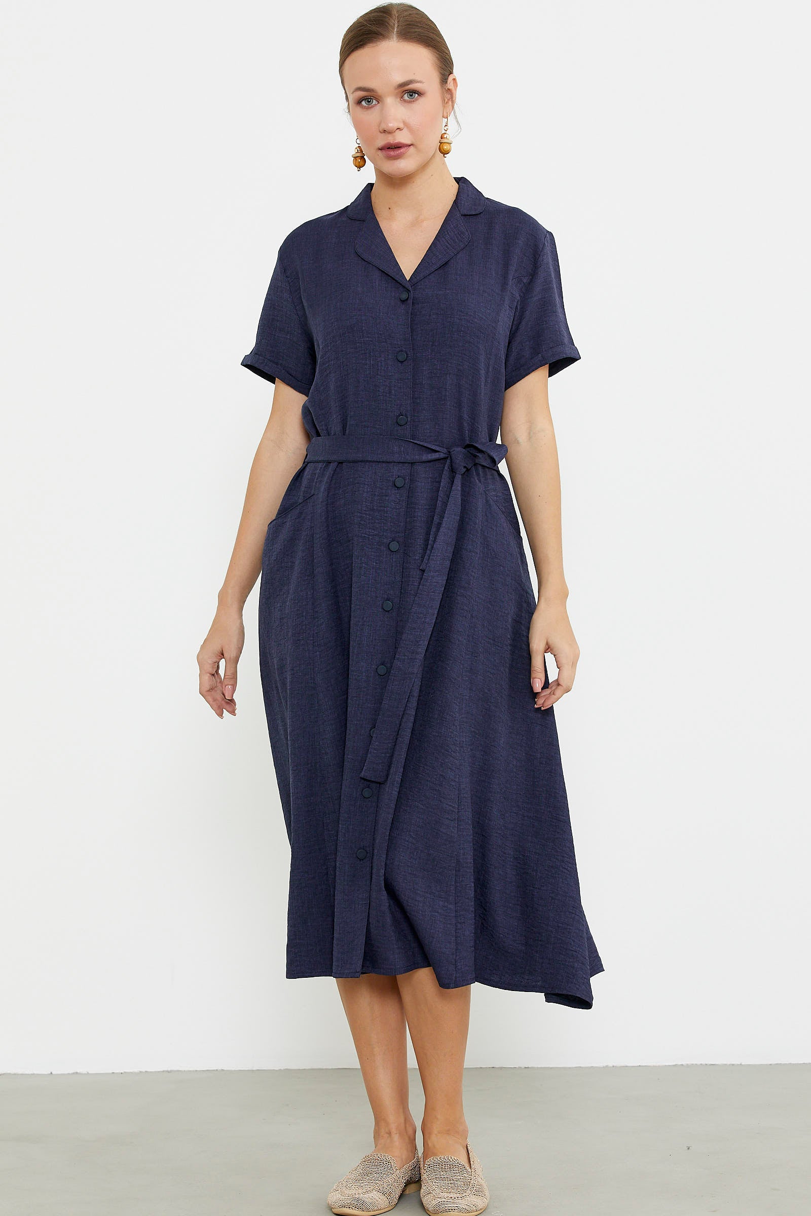 Linen Look Pocketed Shirt Dress - Navy Blue