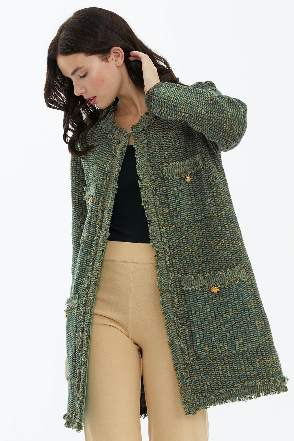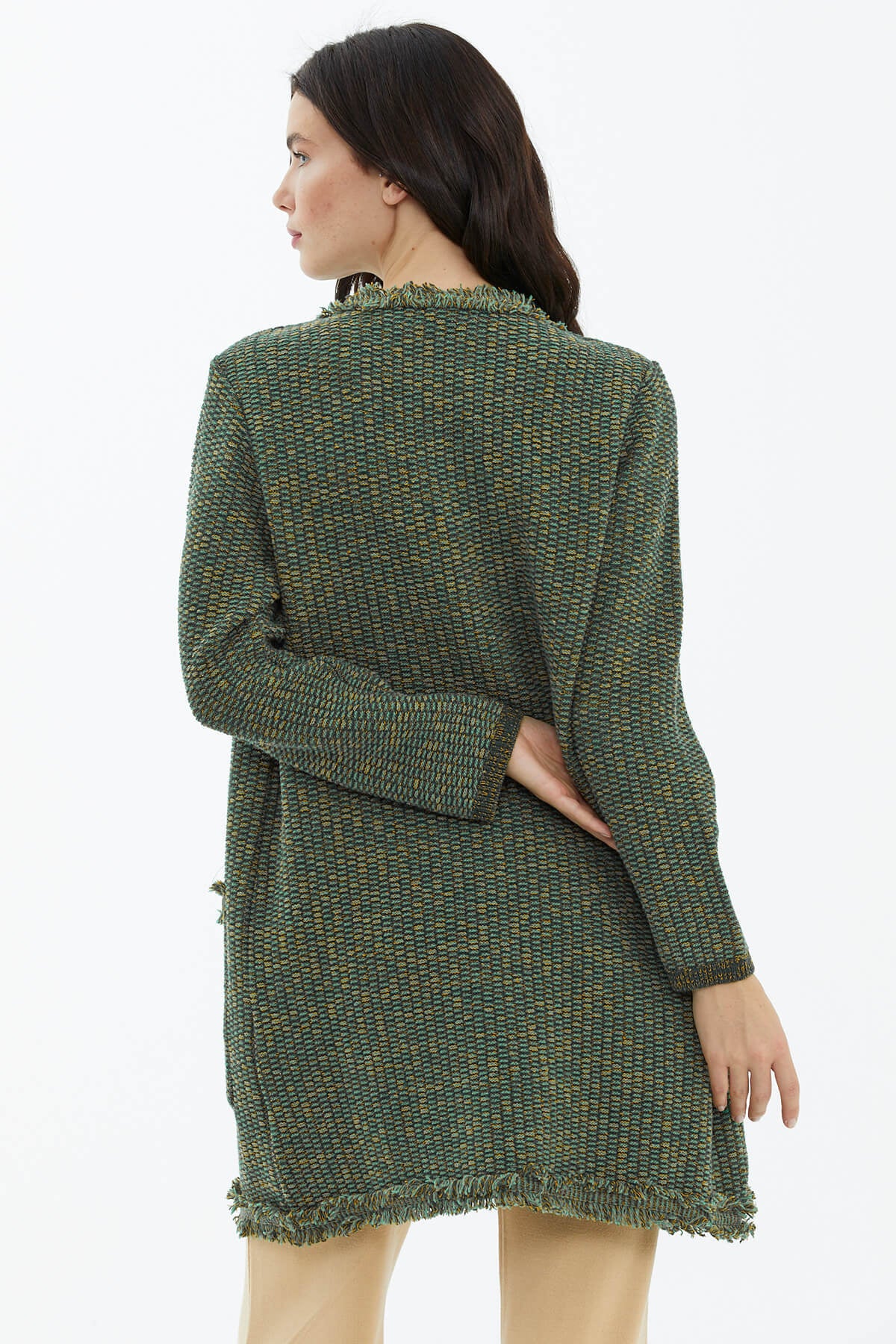 The patterned knitted jacket, which stands out with its tassel detail, will accompany many of your combinations. You can complete your office elegance with a knitted jacket, and combine weekend elegance with jeans in comfortable combinations.