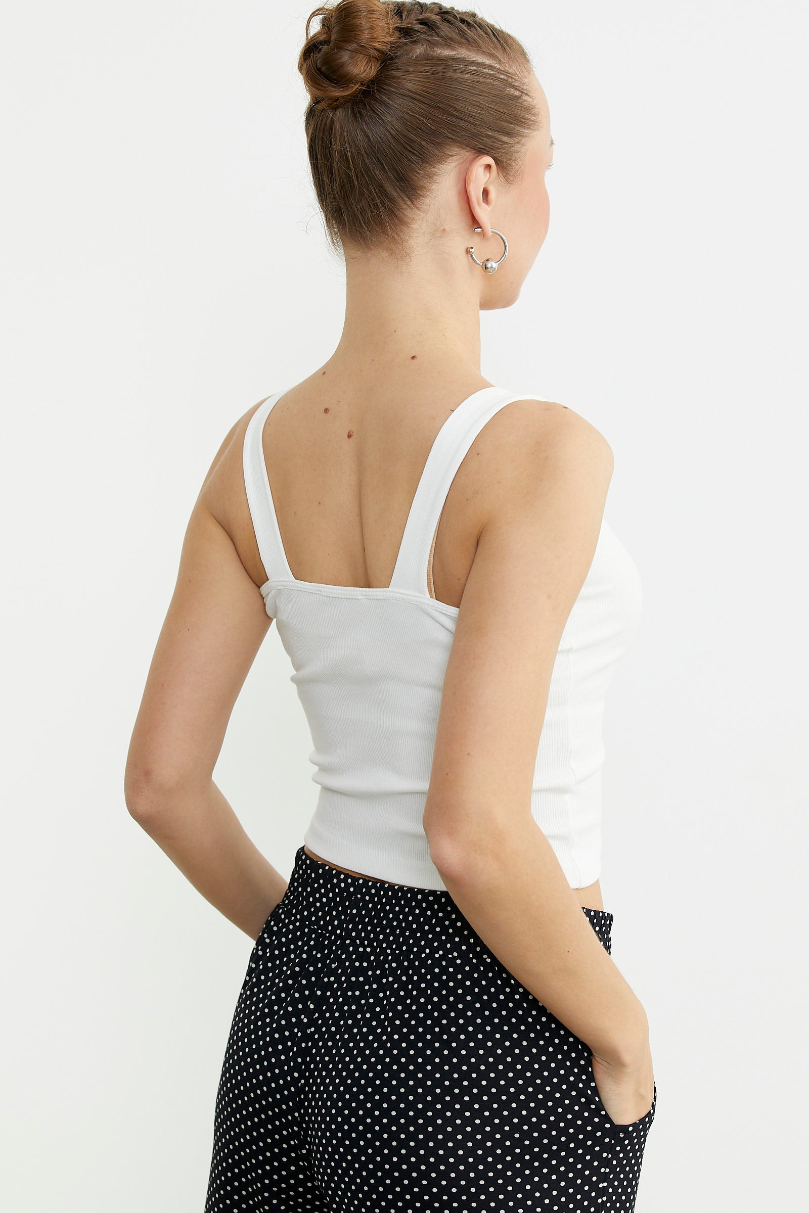 Fitilli askılı basic atlet, vücudu kusursuz şekilde sarar. Crop boydur. Düğme detayıyla hareketlendirilmiştir.