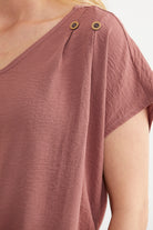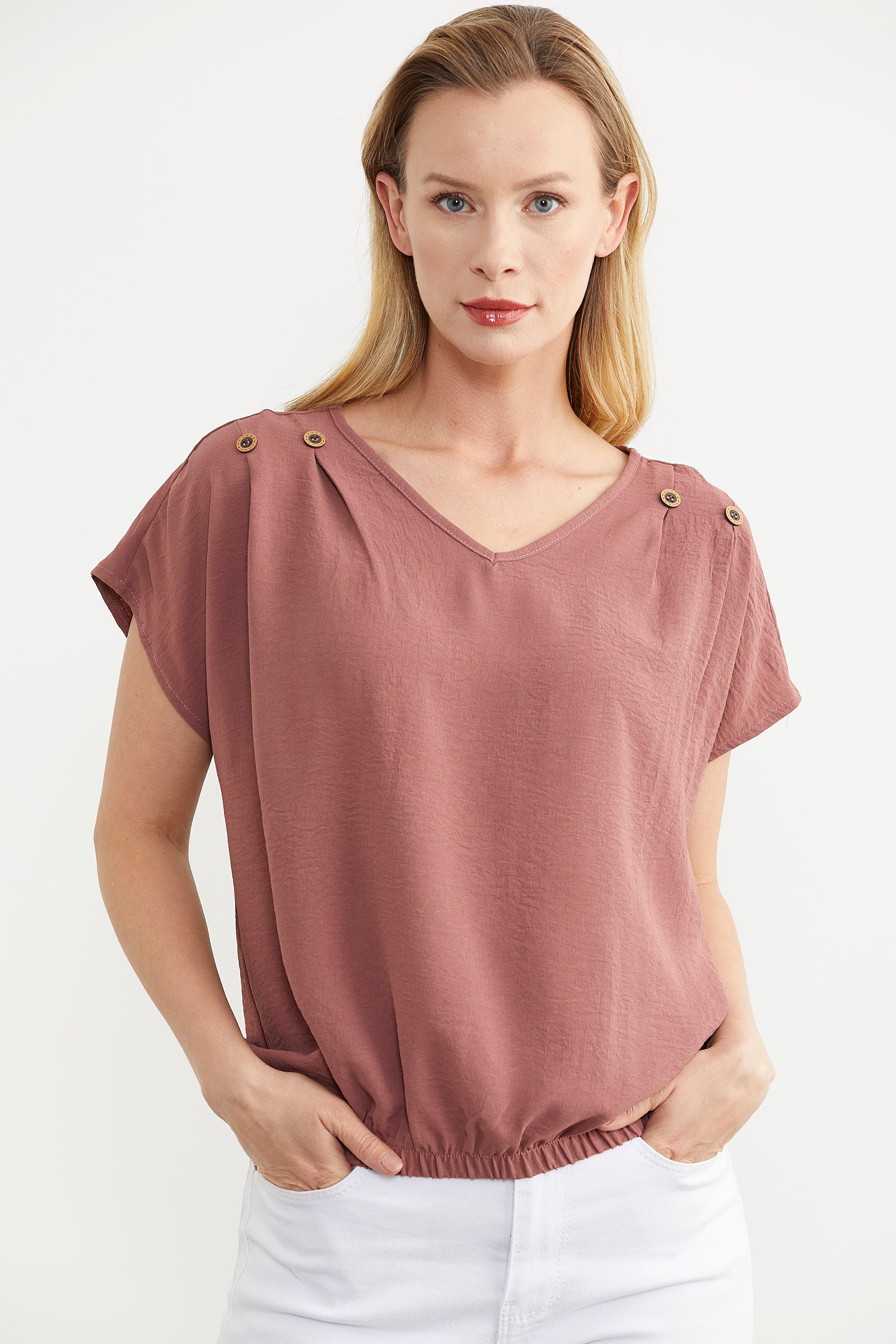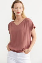 The crepe V-neck blouse with elasticated hem provides easy-to-use comfort in summer with all its parts.