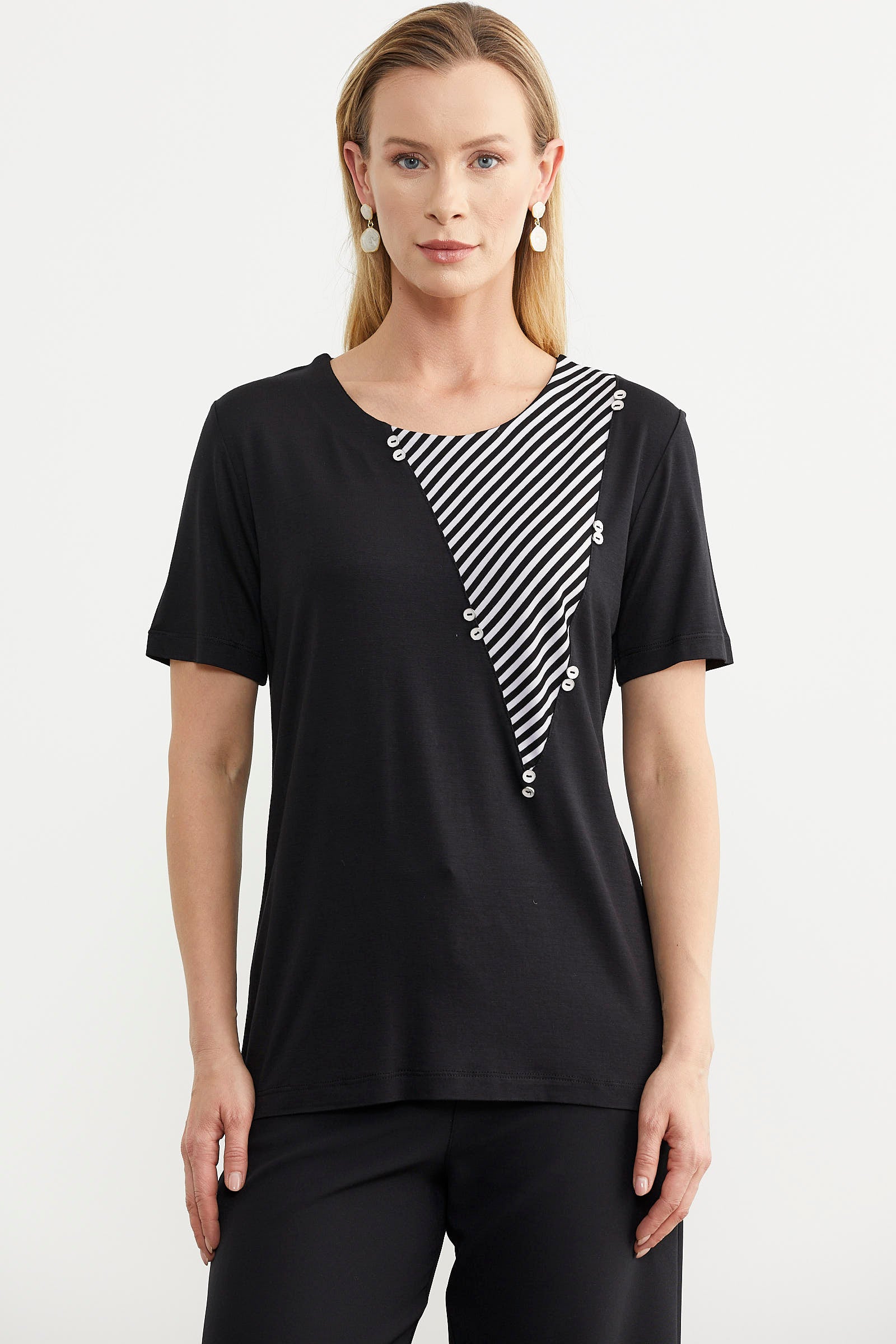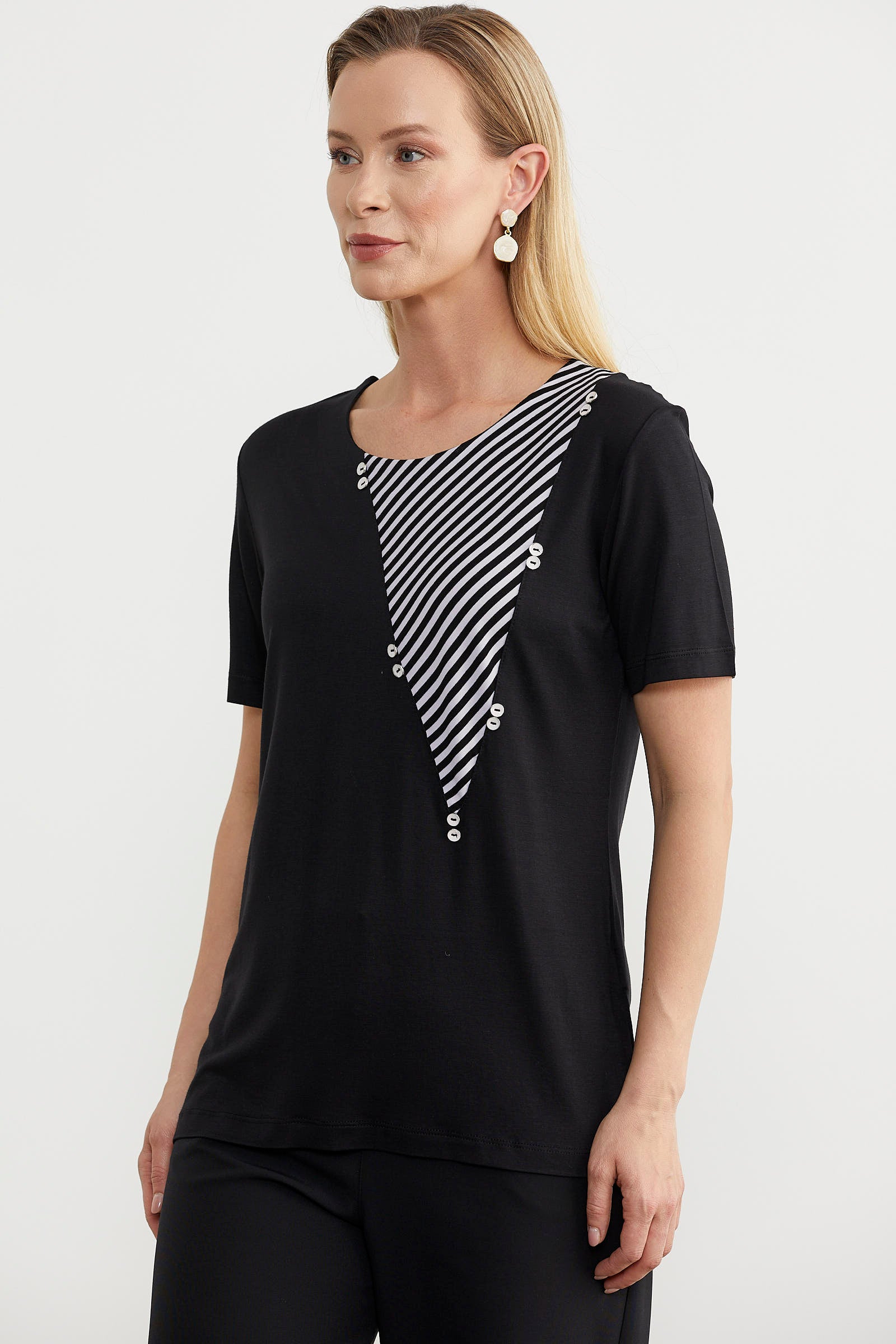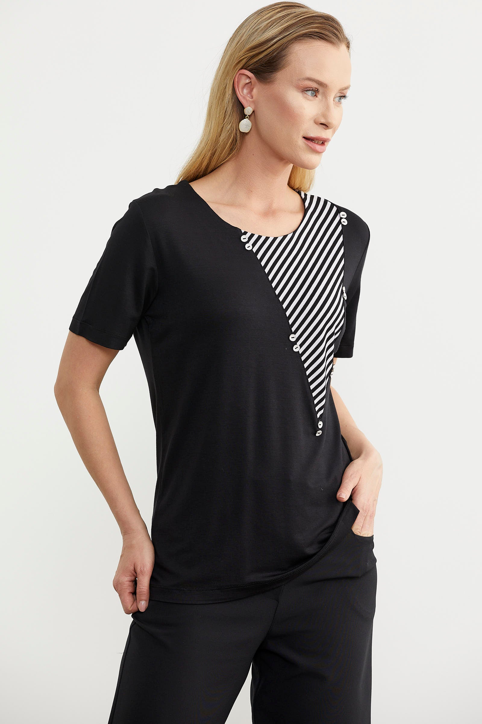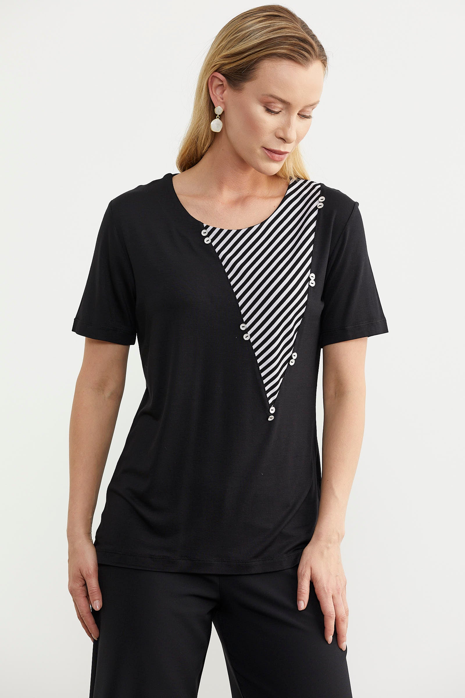 The blouse, which features a thin striped line detail that meets the collar, is designed as a comfortable fit.