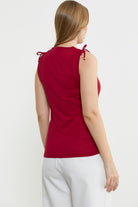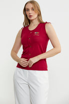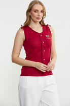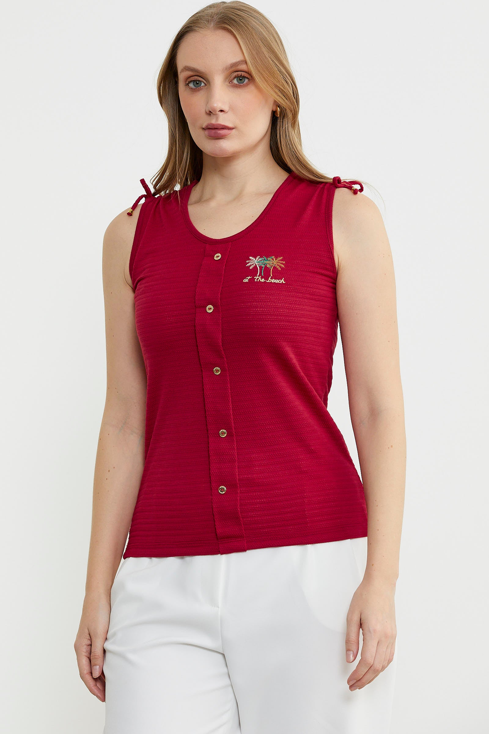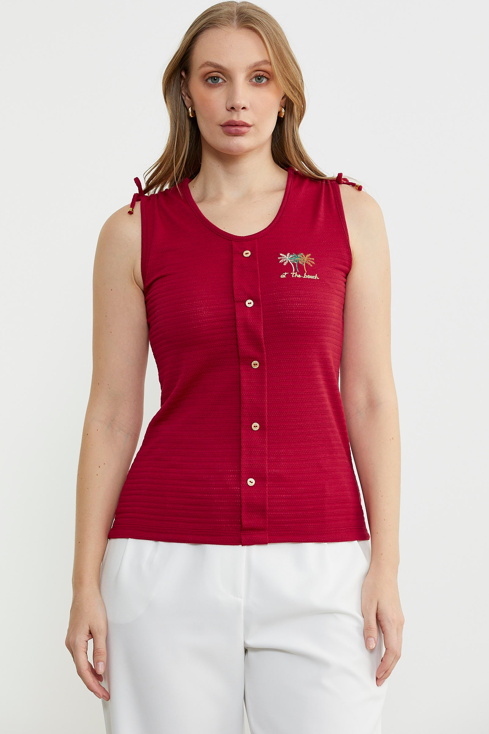 Made of textured breathable fabric. Embroidery details. Adjustable shoulder straps.