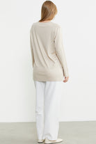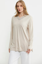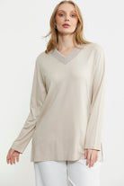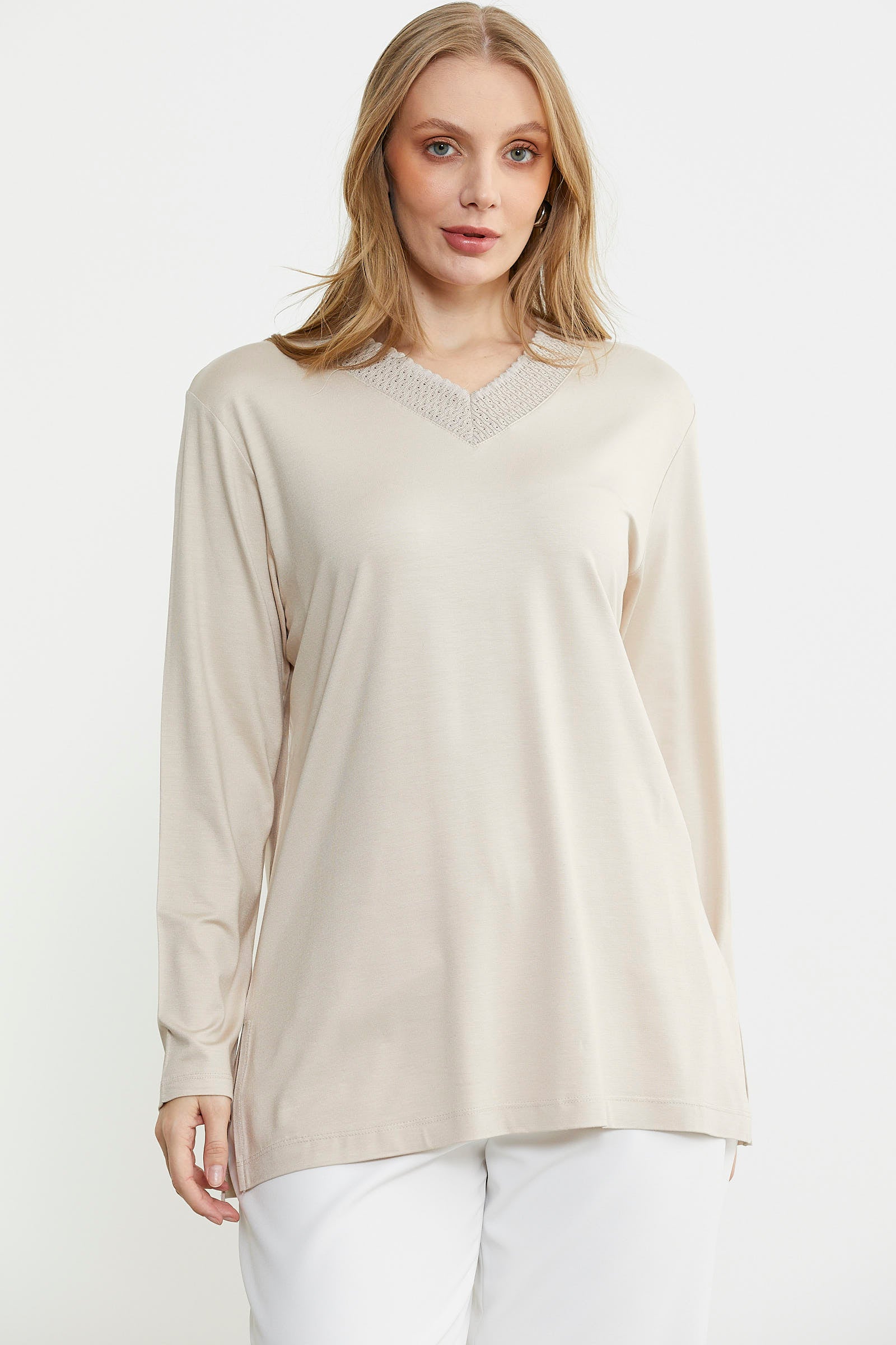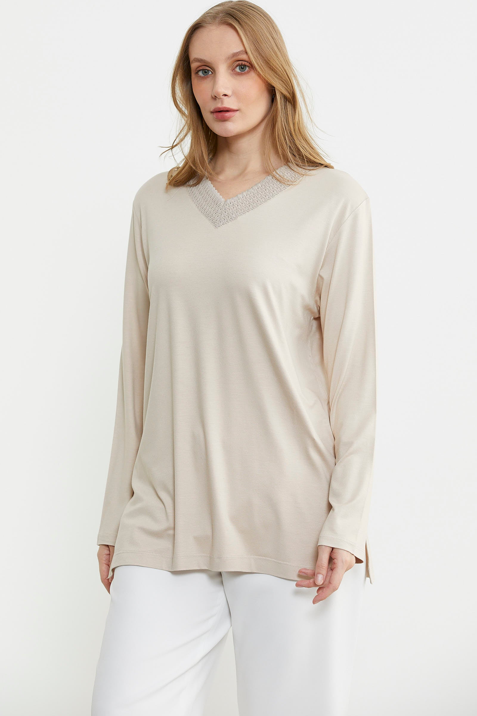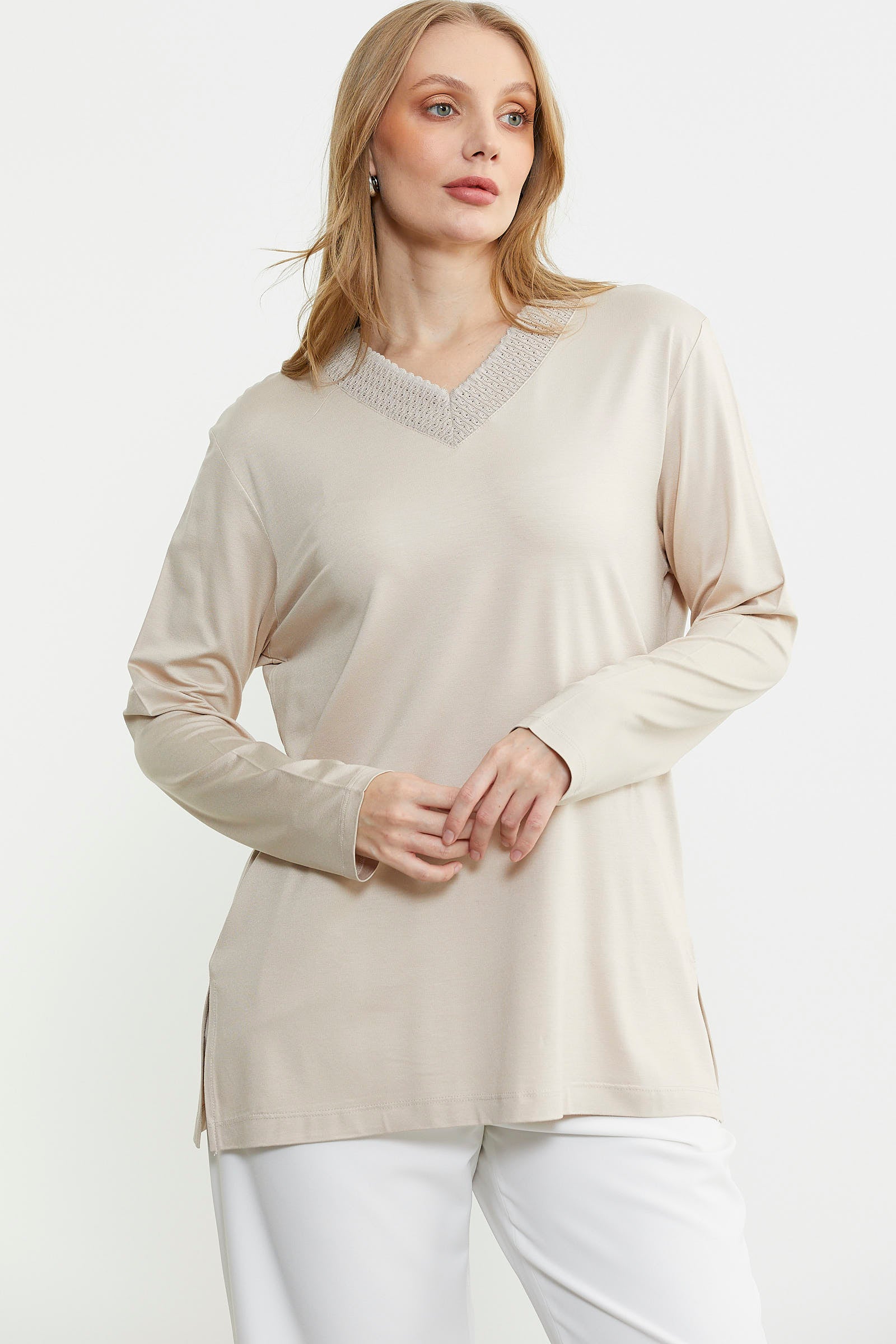 Standing out with its elegant details, the loose-fitting combed cotton blouse has a knitted collar detail in the same color. It provides a light and breathable use with its soft textured fabric. It is produced as long sleeves.