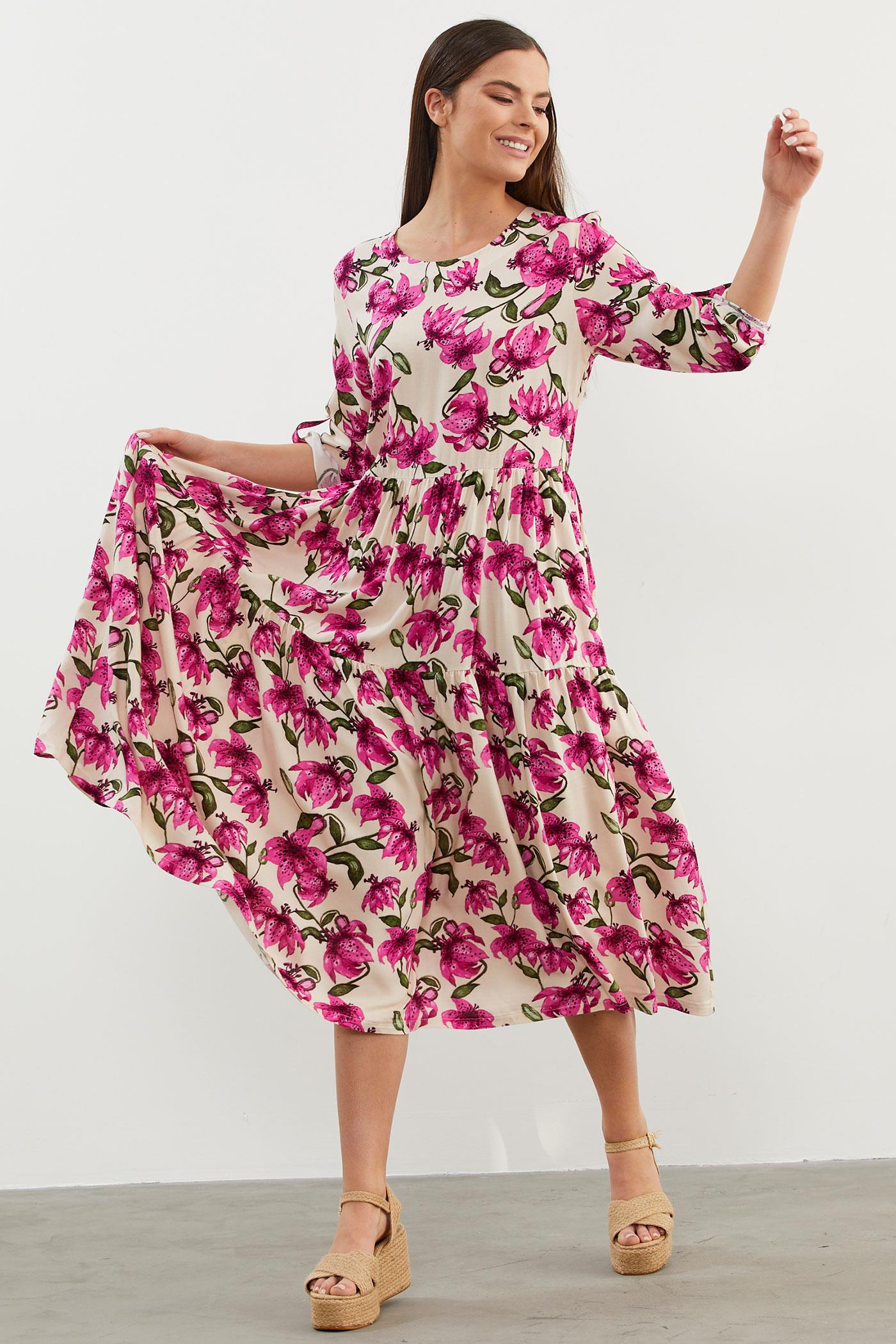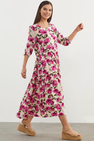 Stylish looks are always with you with the midi length, three-quarter sleeve, smocked dress that enlivens your form.