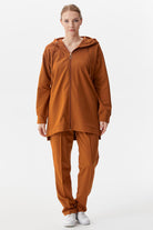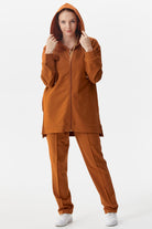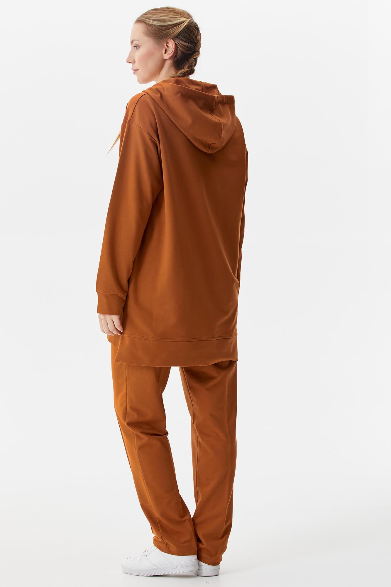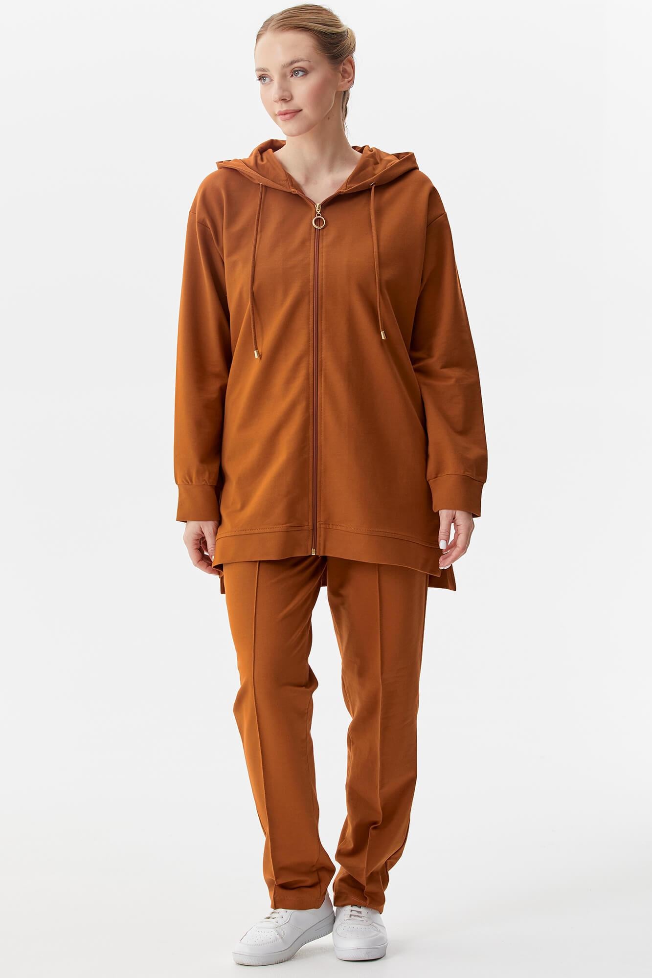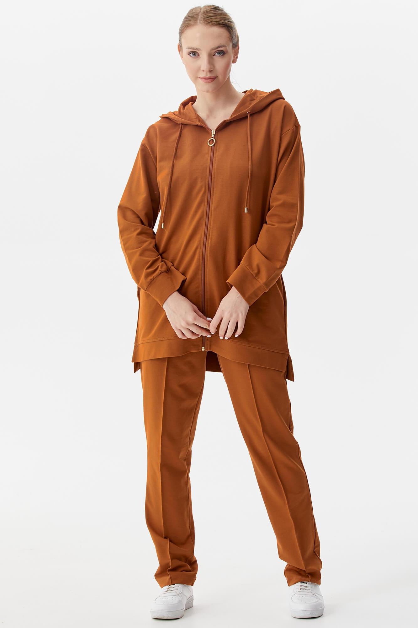Set consisting of a hooded, long-sleeved, zip-up, long sweatshirt with ribbed cuffs and a pair of ribbed, pipe-cut, waist-tie sweatpants.