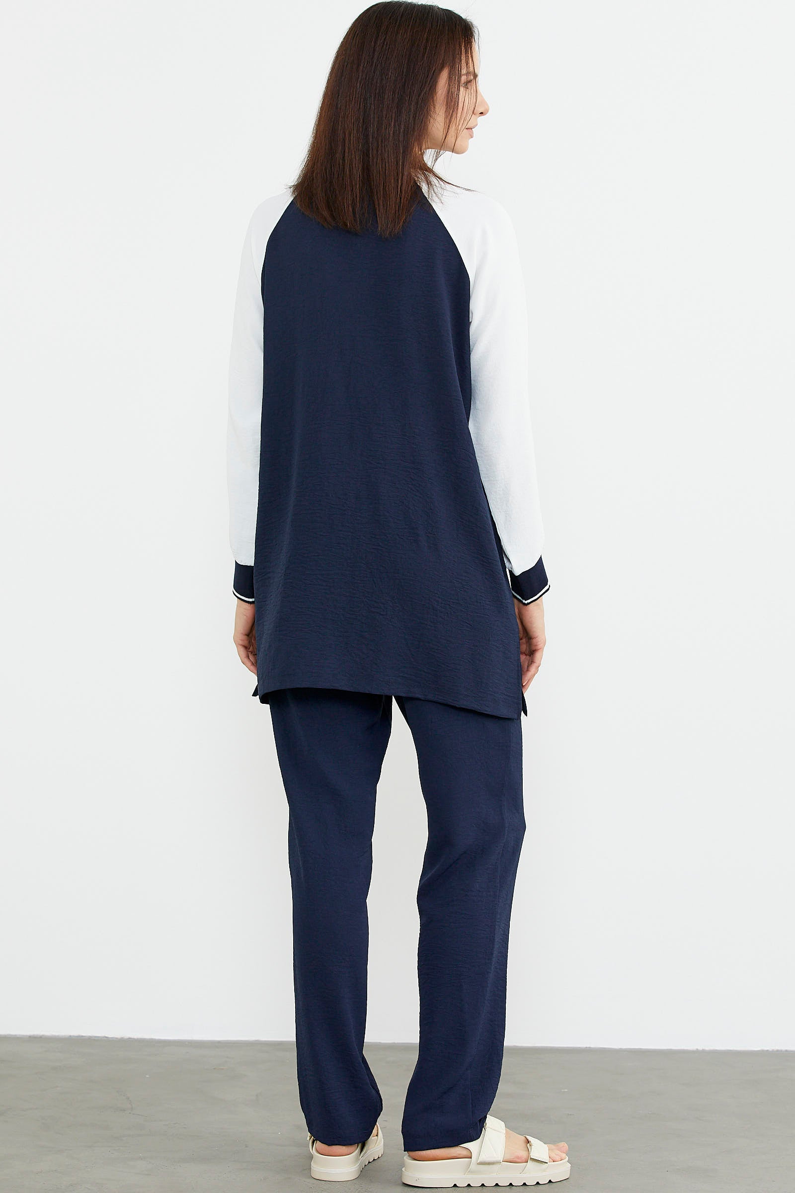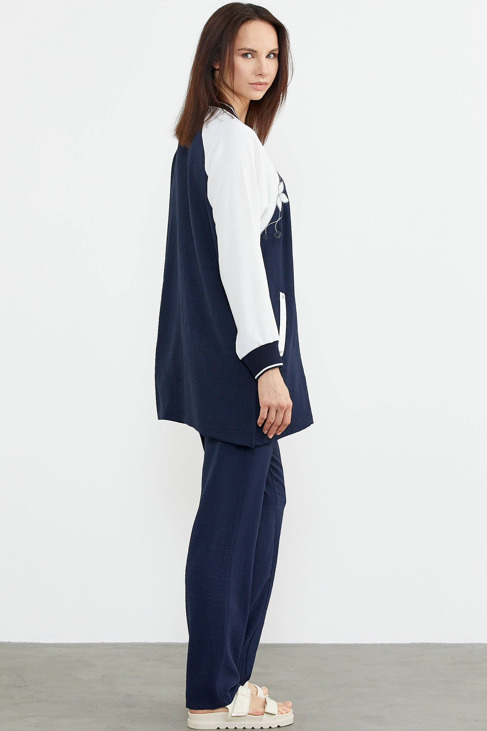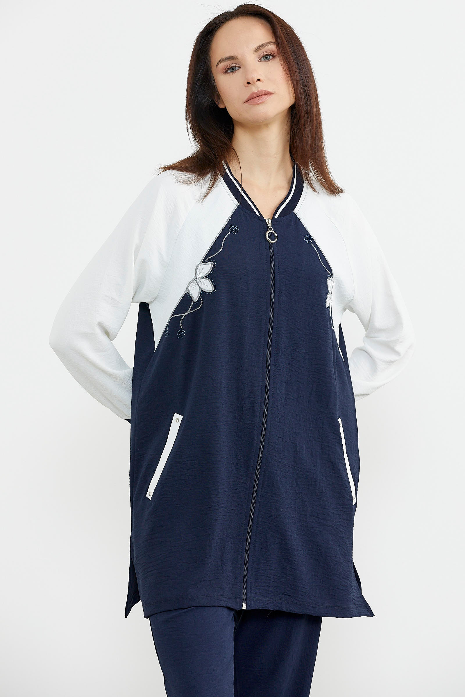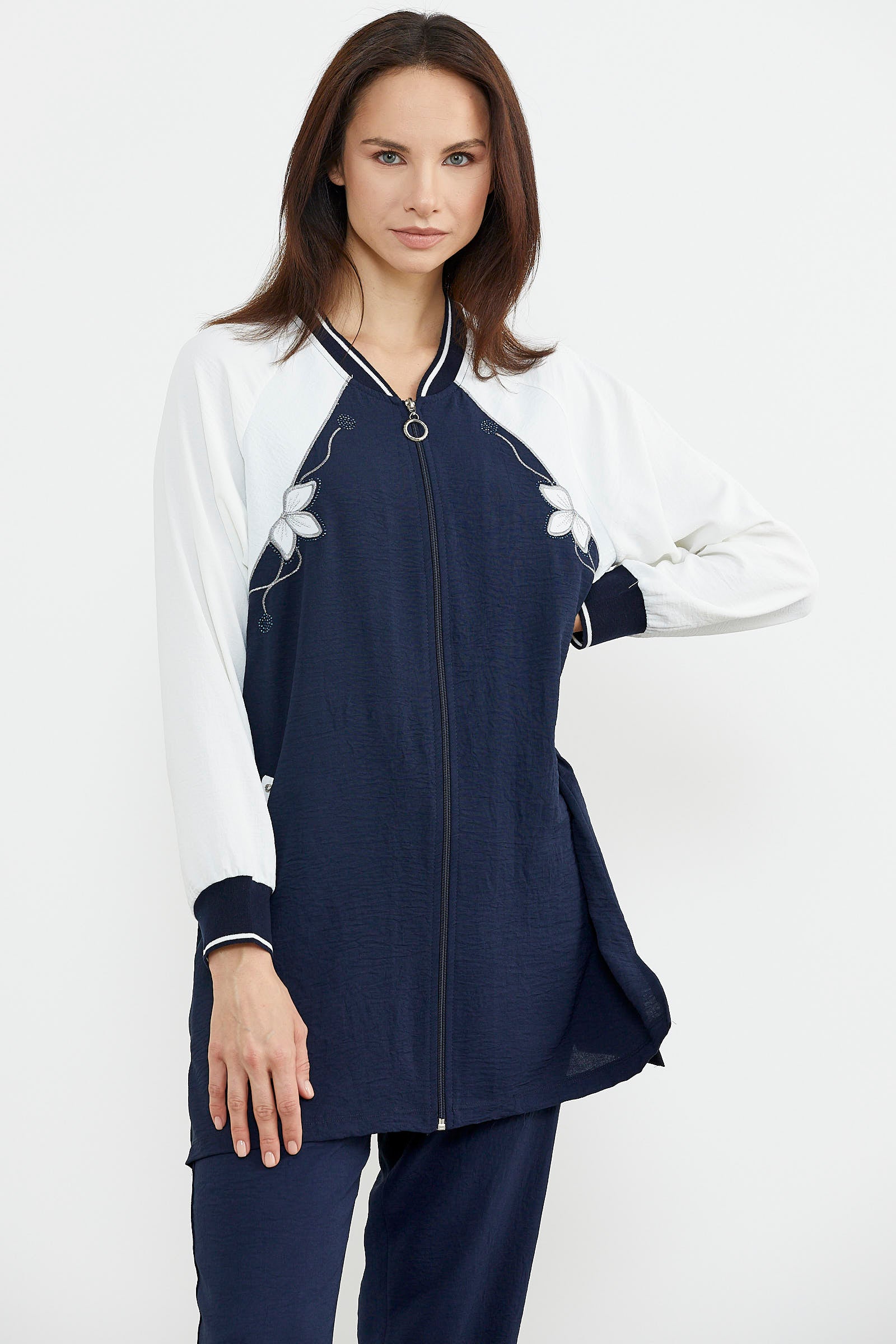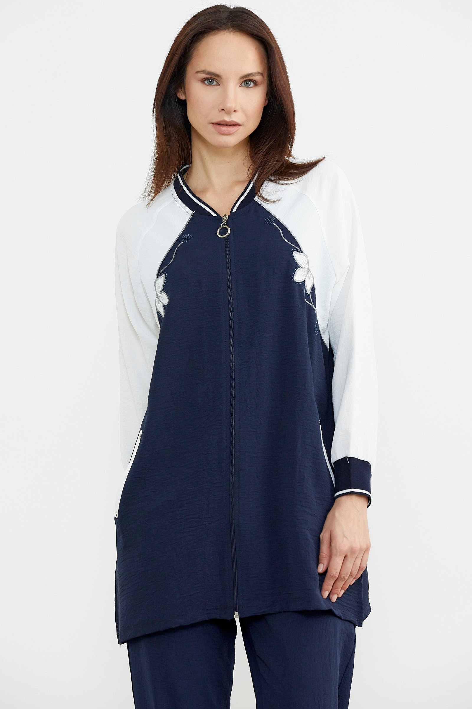 The zippered tunic crepe suit, enlivened with embroidery details, is produced as a wide-cut, comfortable fit.