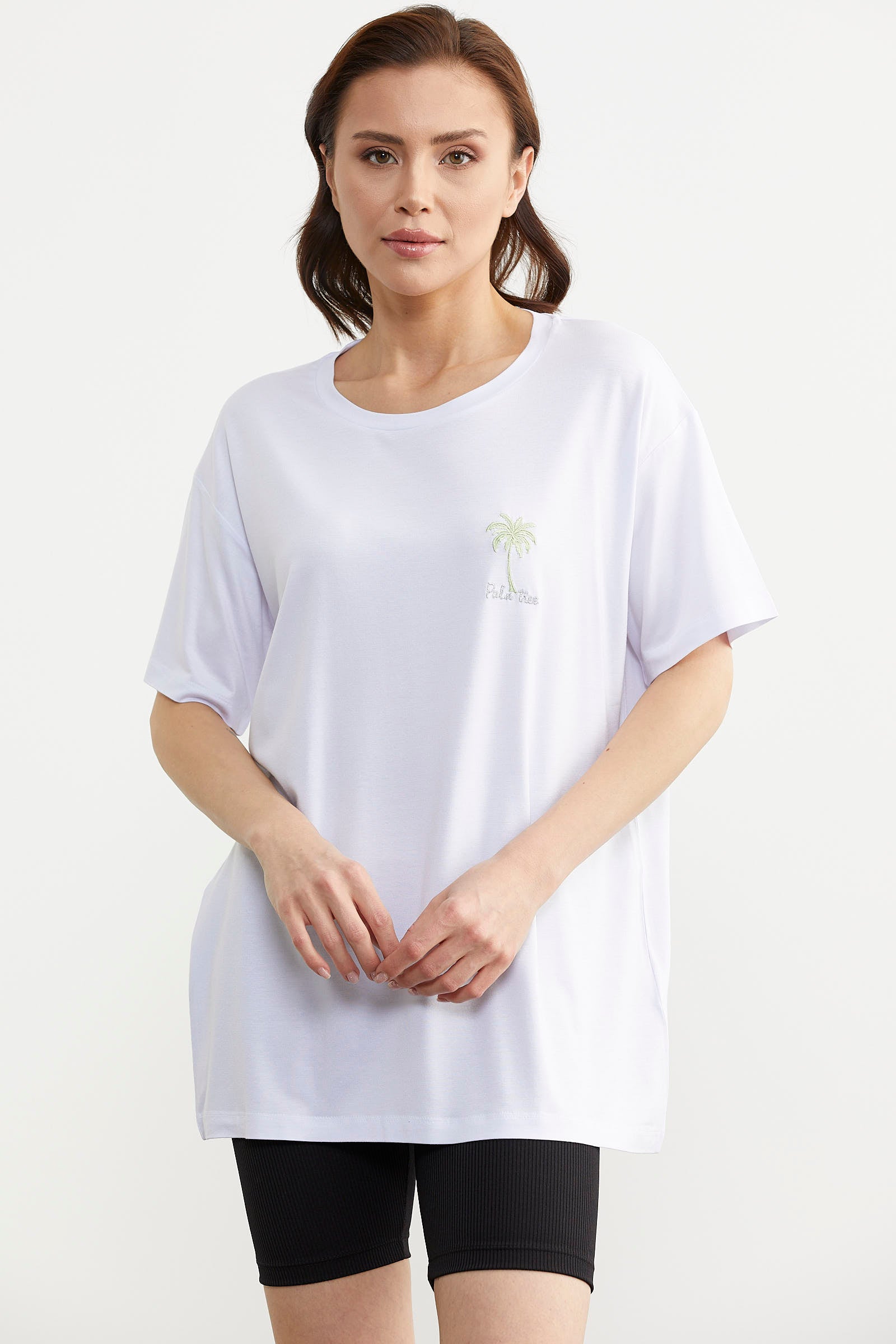 Designed as a relaxed fit, the crew neck basic t-shirt model features minimal embroidery detailing, adding movement.