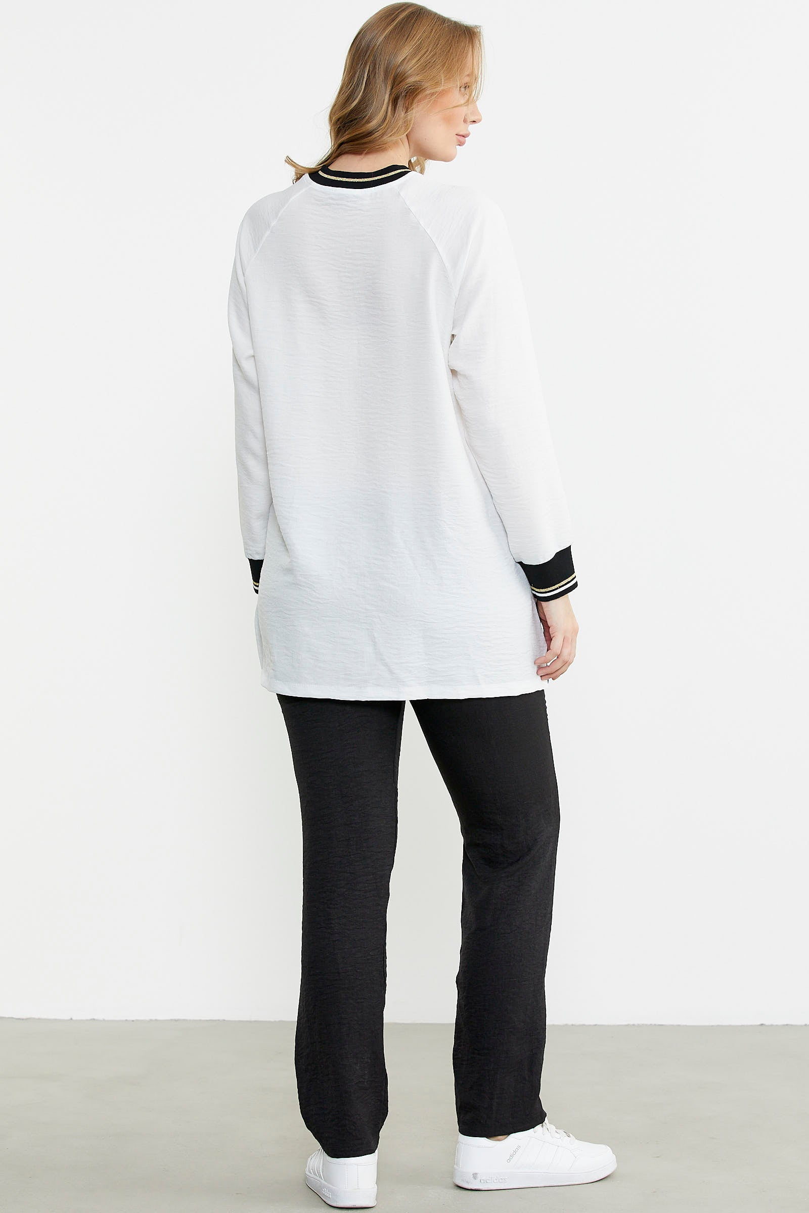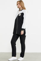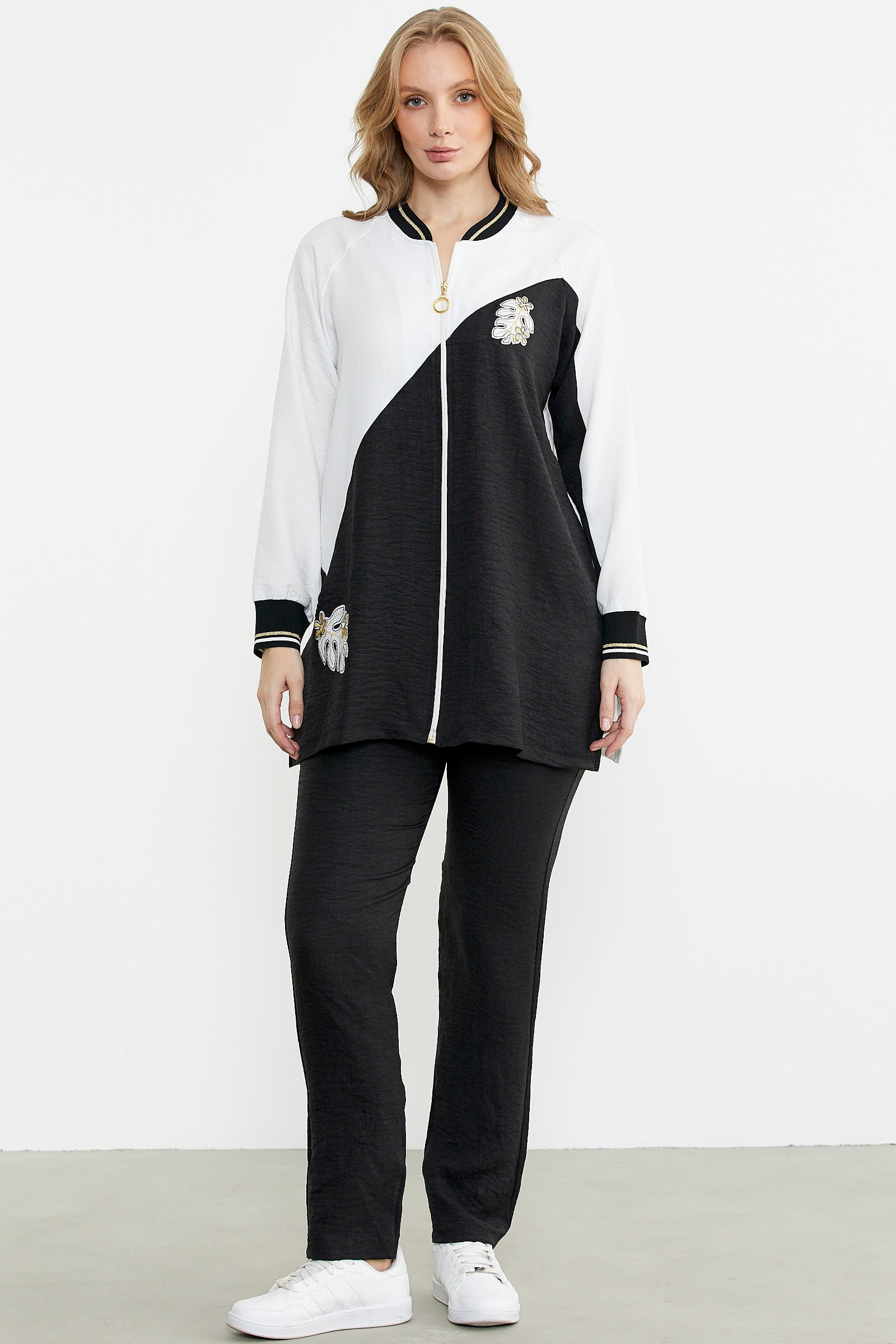 The loose linen look suit is accompanied by glitter details. It has a zipper closure and contrasting colors.