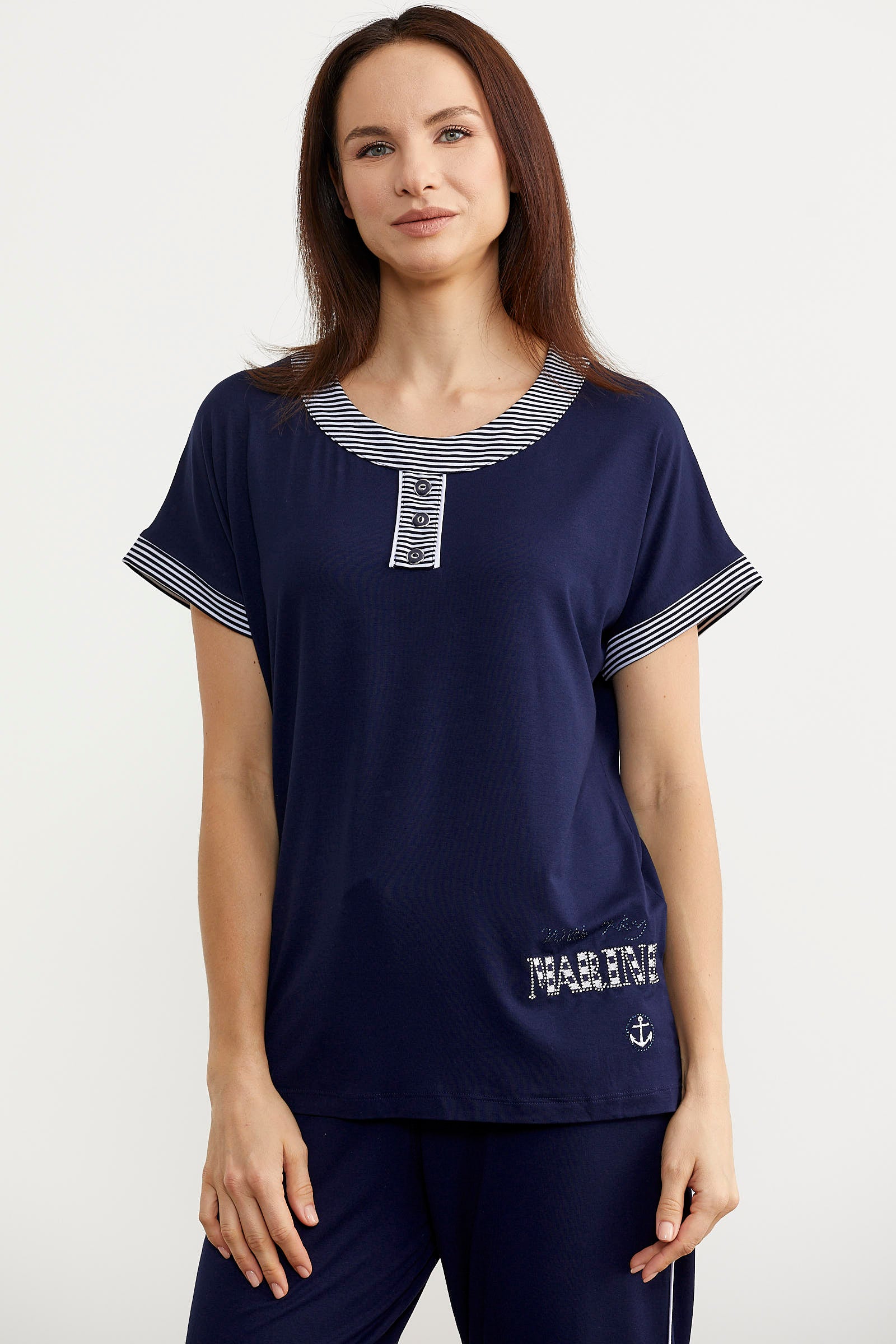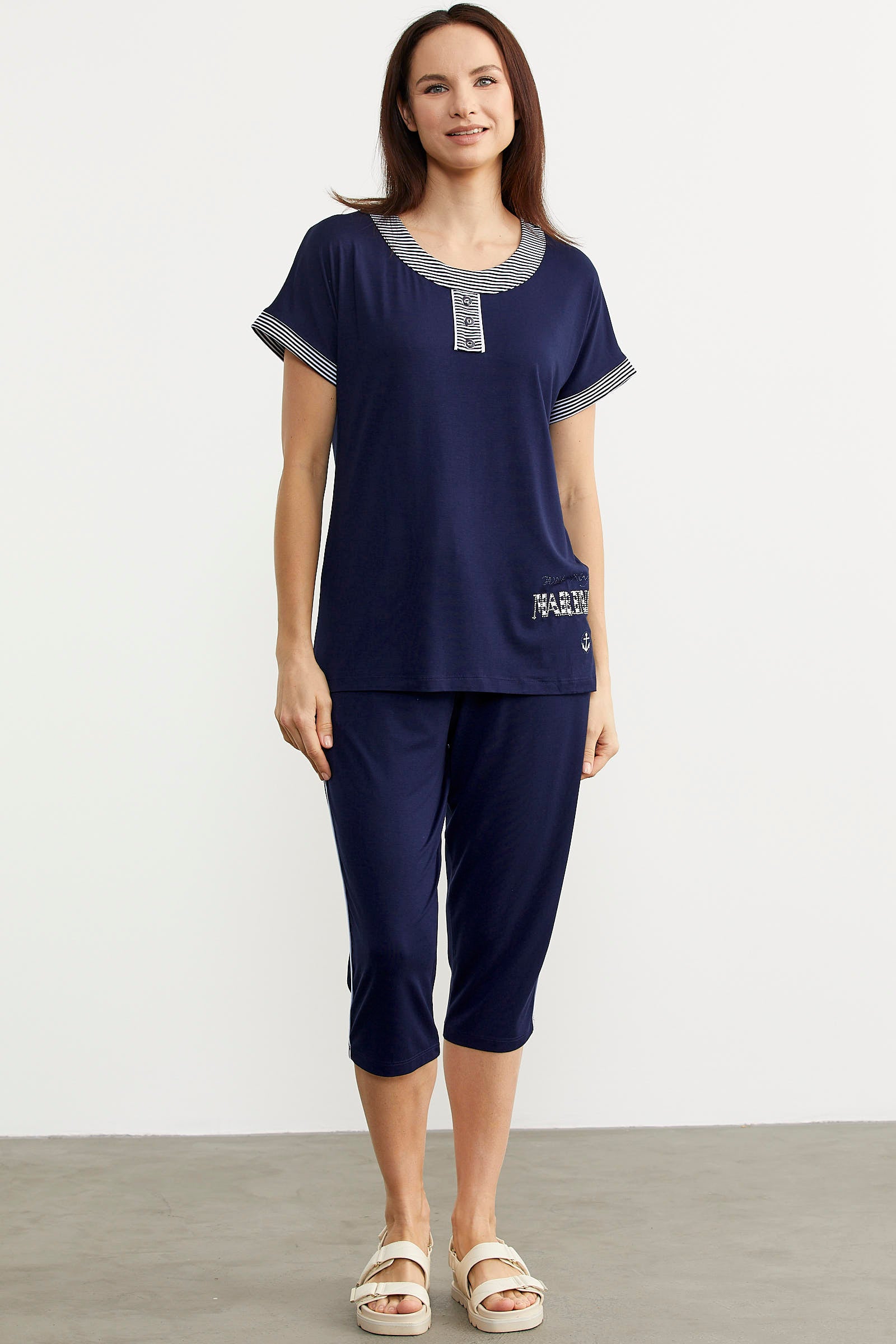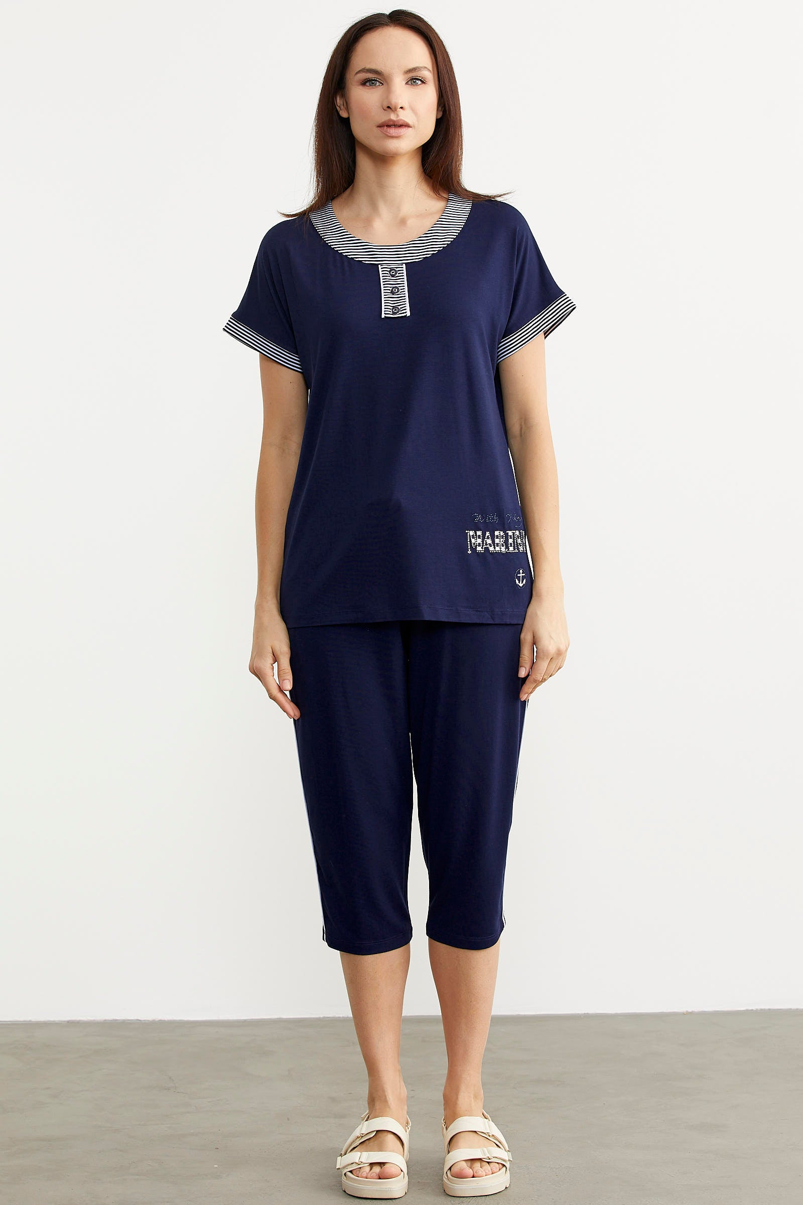 Large size marine detailed seasonal suit, zipper closure and pockets. Promising comfort all day long, the two-piece suit has a soft texture.