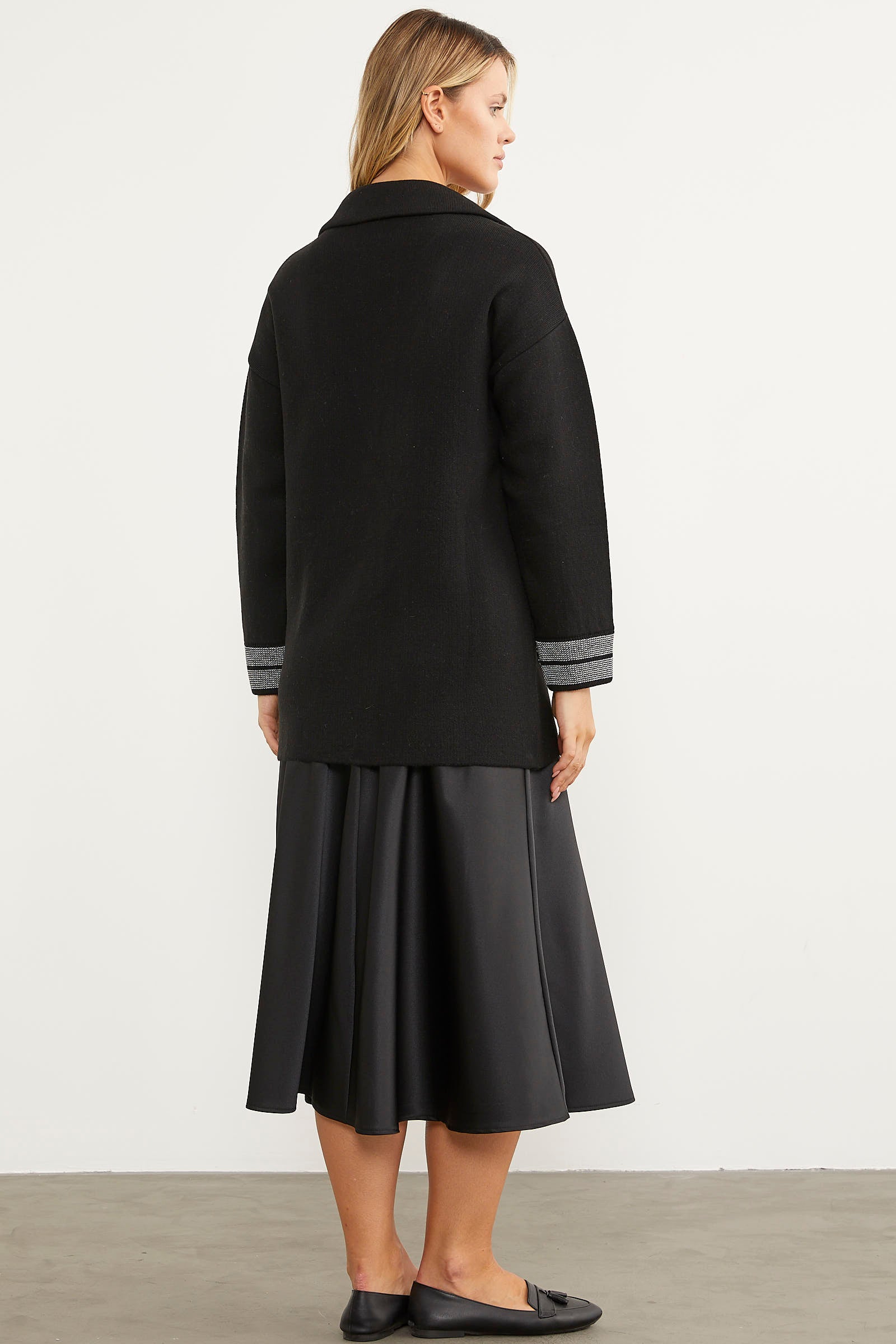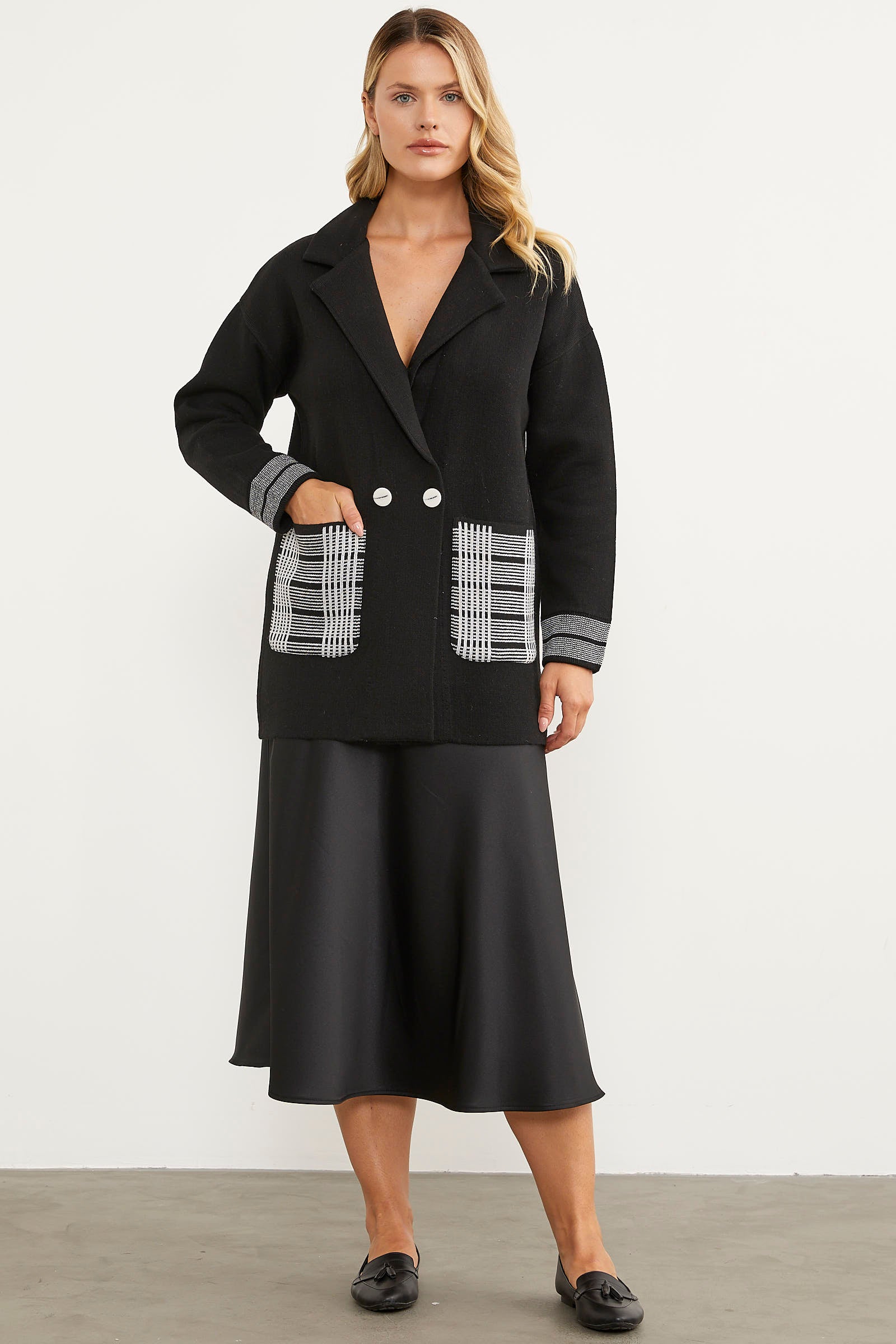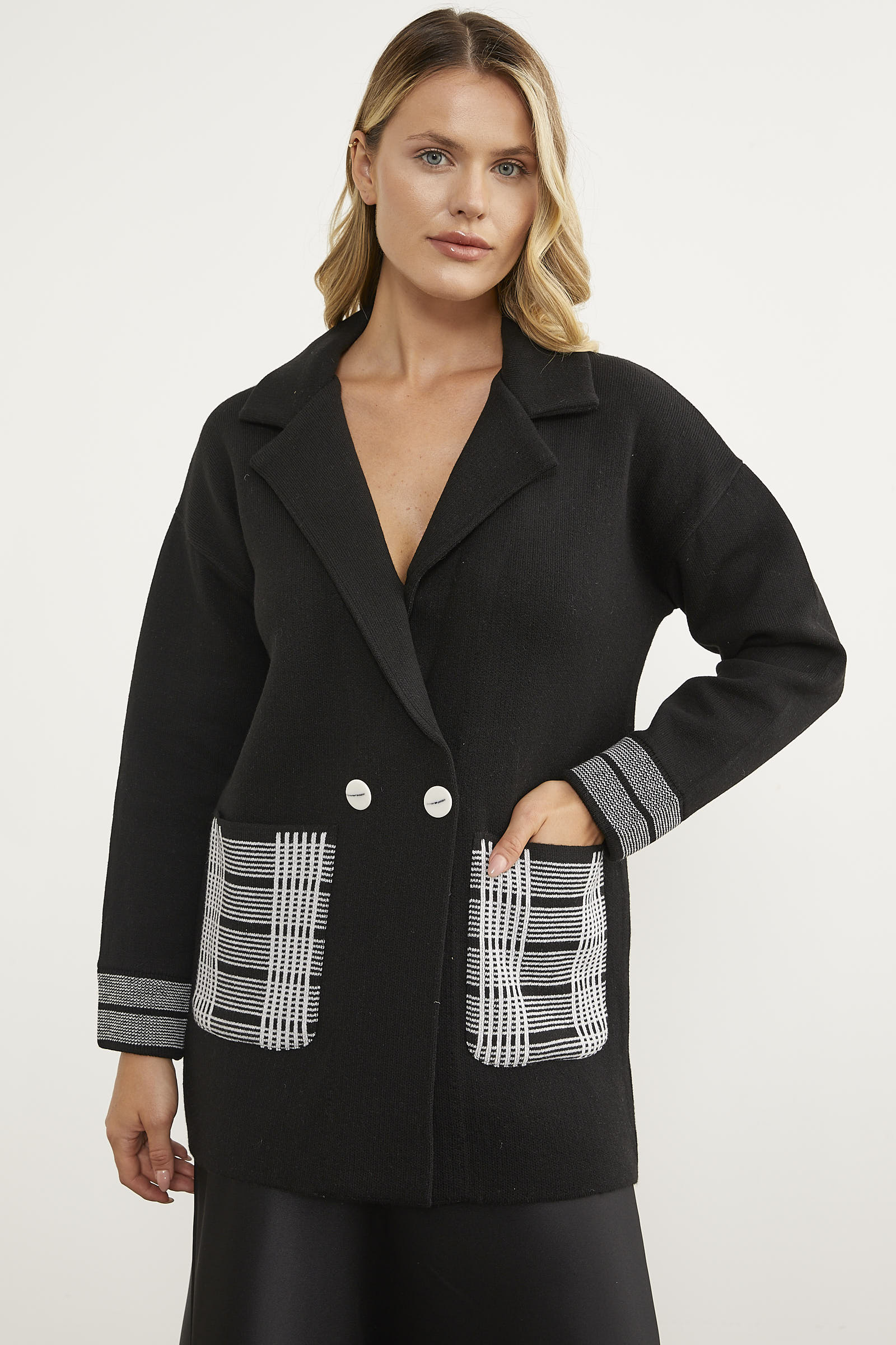 The double-breasted knit jacket with striped cuffs and large plaid pockets blends your street style with elegance. The design with dropped shoulders and buttons in the front adds comfort to your timeless style. Thanks to its flexible fabric content, you can make free combinations without restricting your movements.