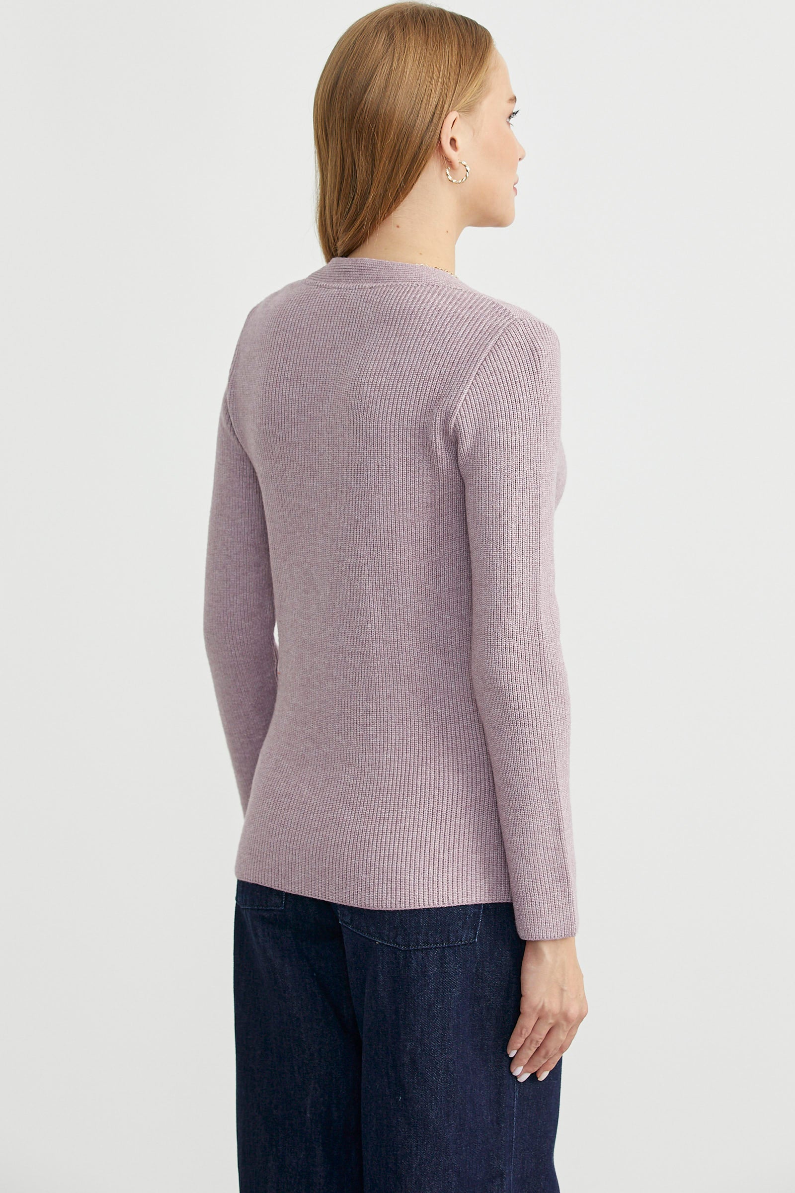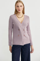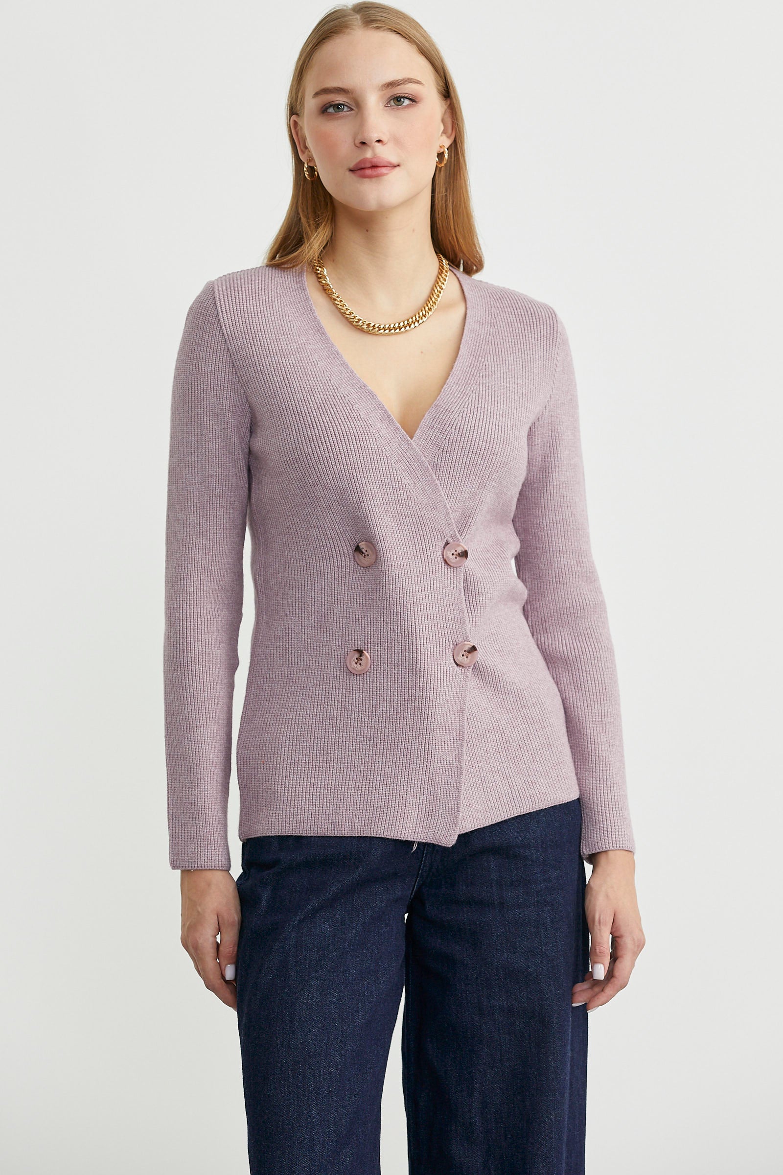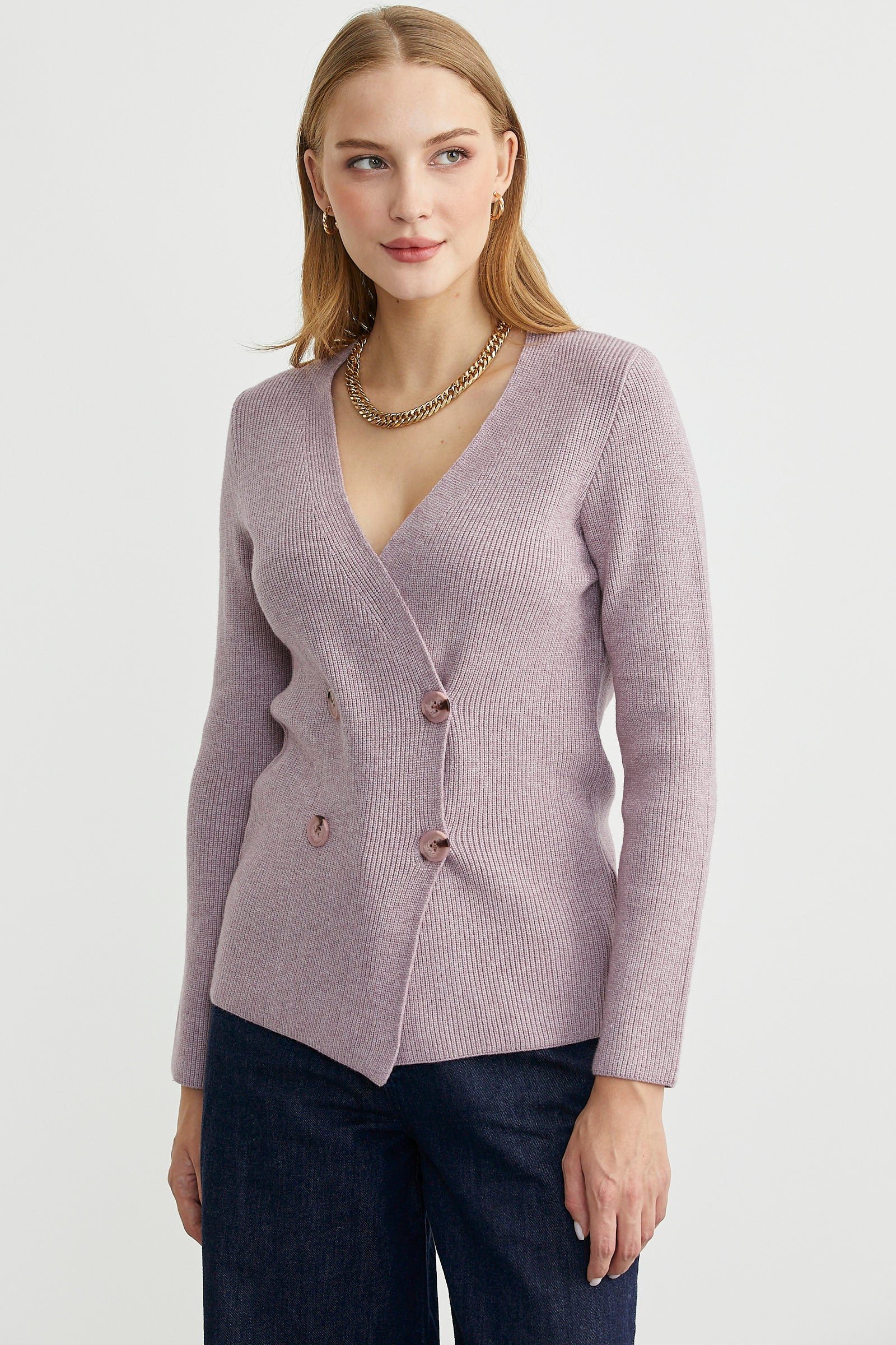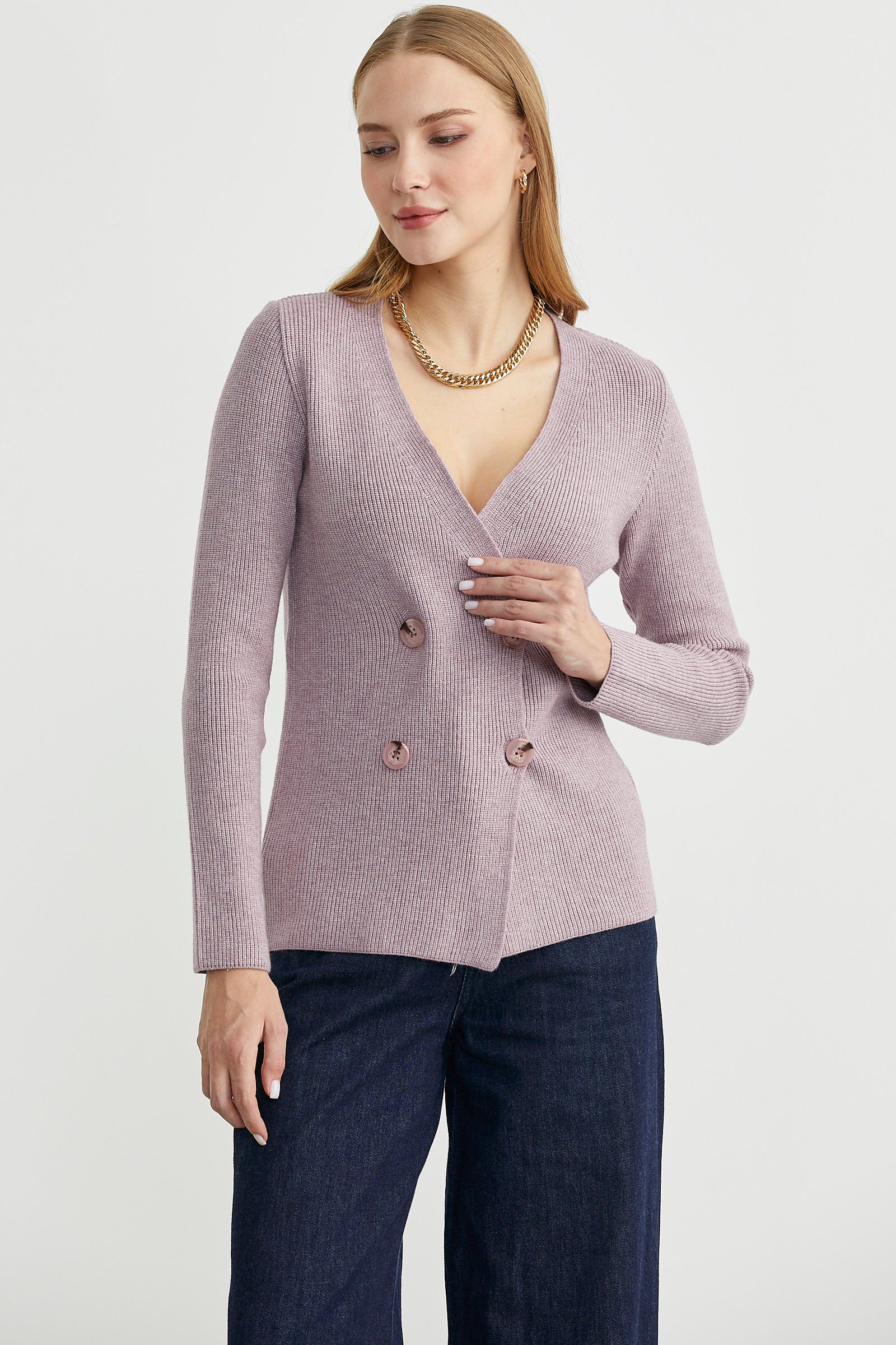 V yakalı, maskülen, kruvaze triko ceket. Vücuda oturan klasik kesim, uzun kollu yumuşak dokulu.