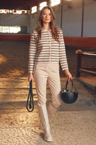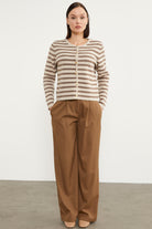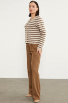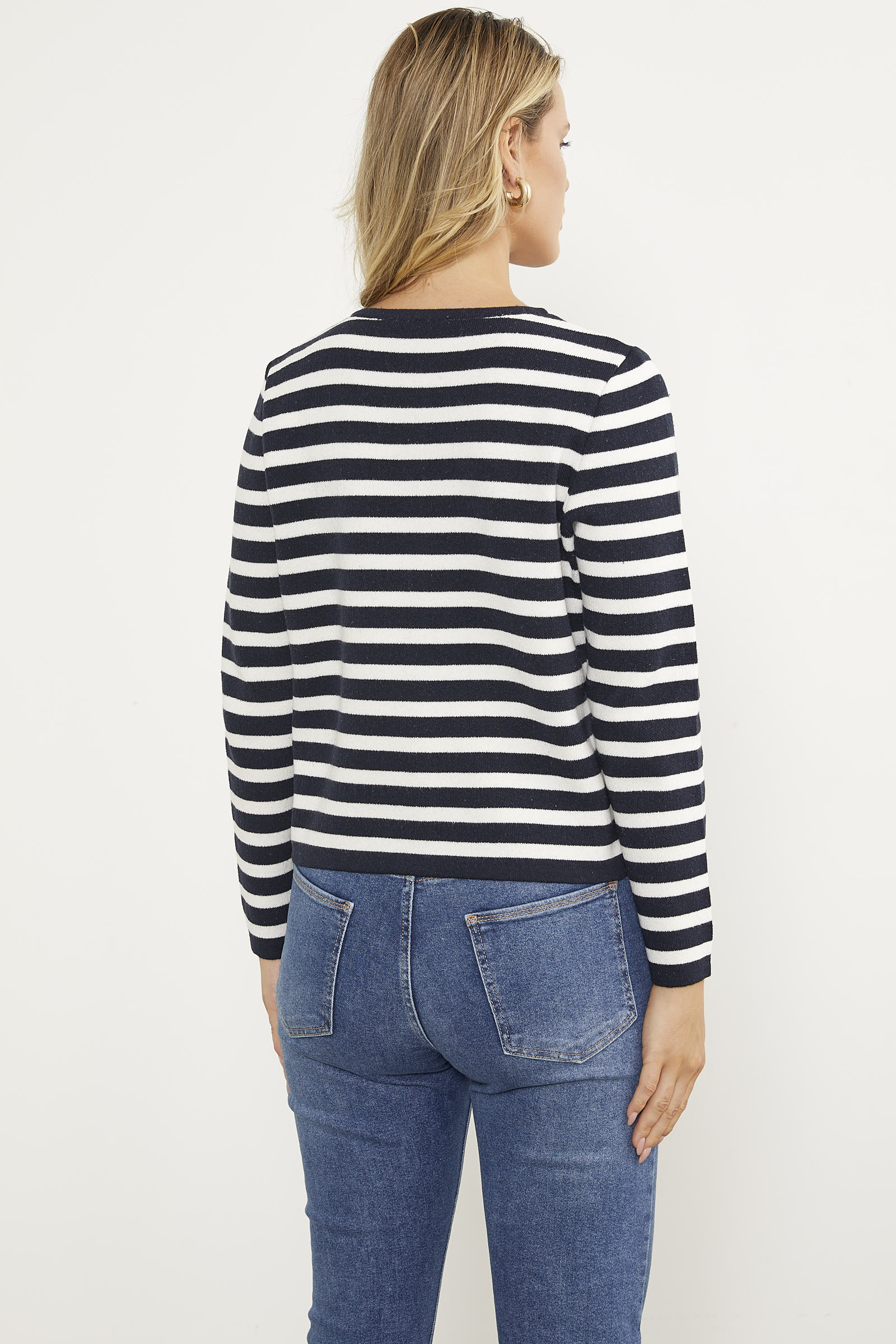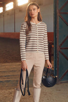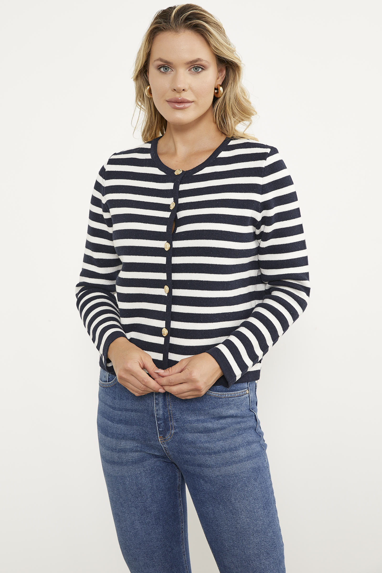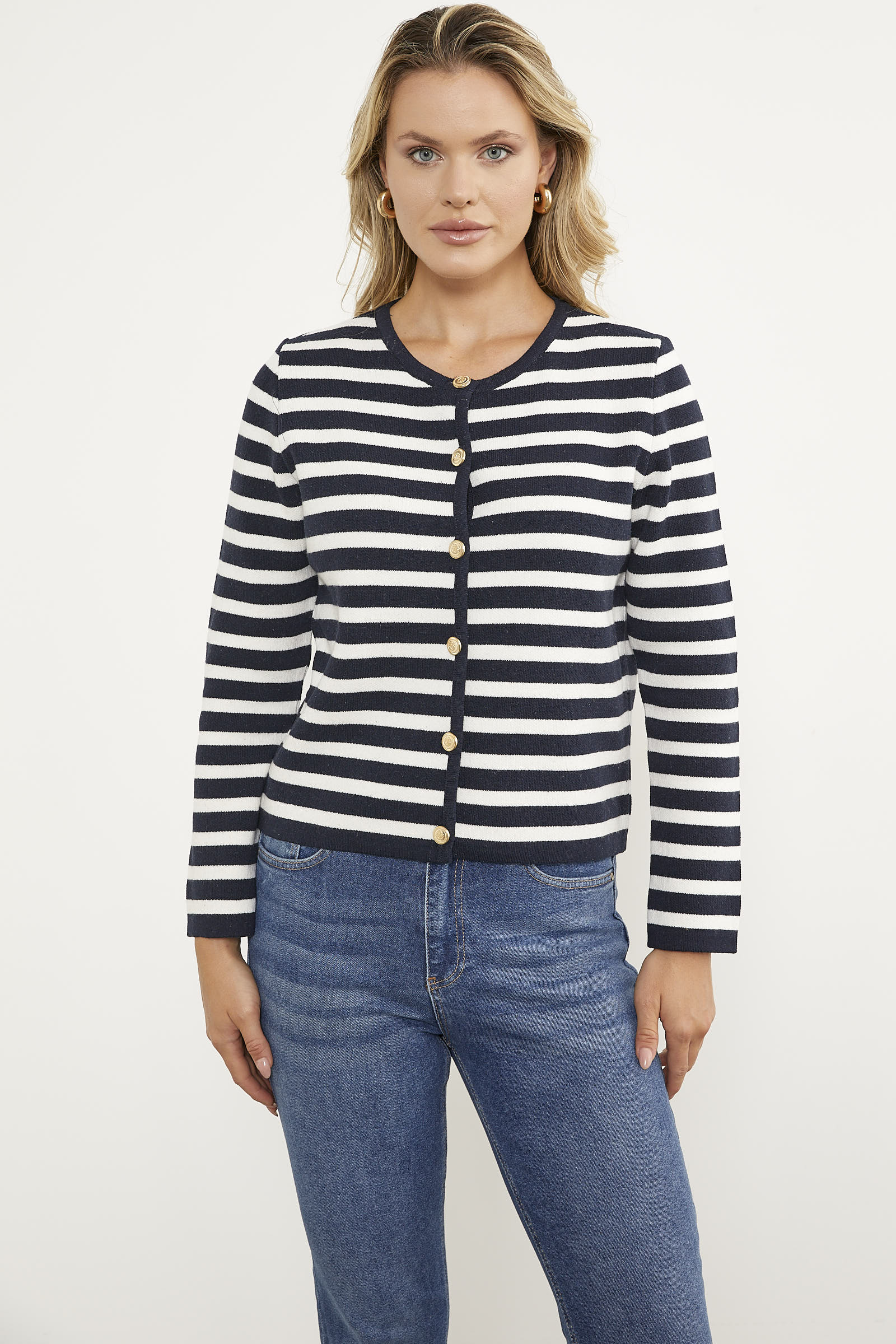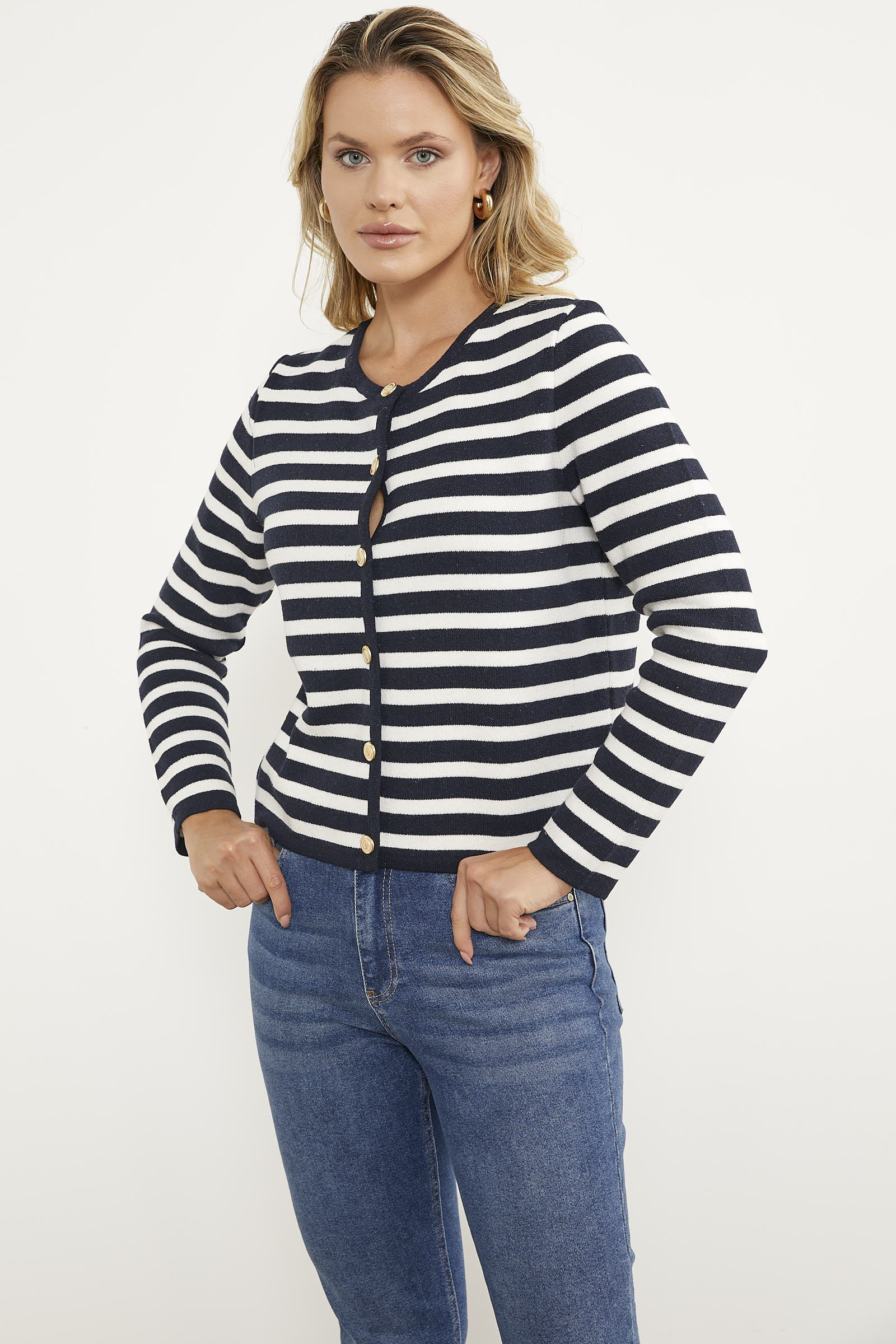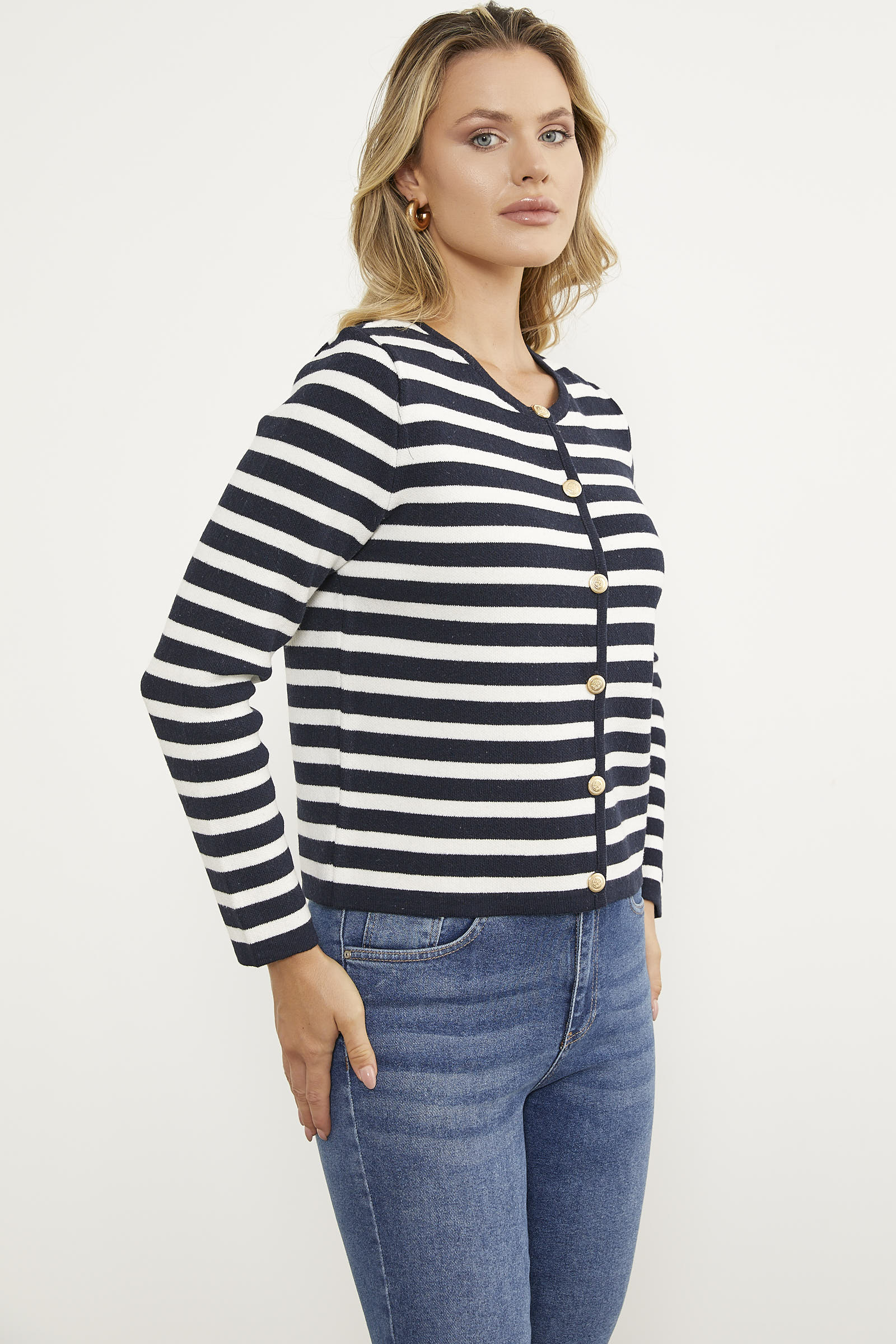 How about a piece that will fit into every combination? A two-tone, striped knit cardigan with buttons down the front will make you feel comfortable with its soft texture and add elegance to your style. It will be a complementary piece that you can combine with either your trousers or your skirts.