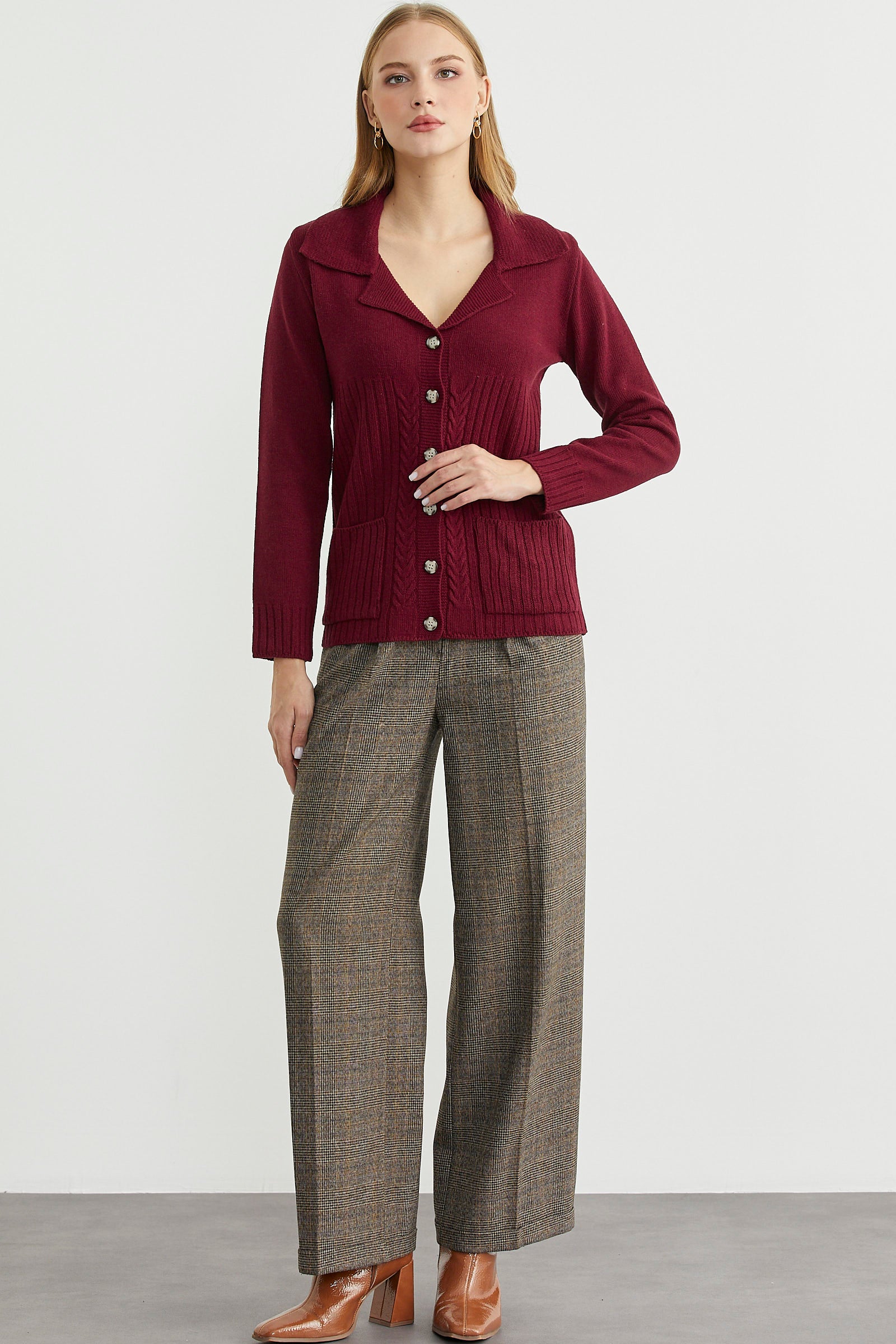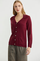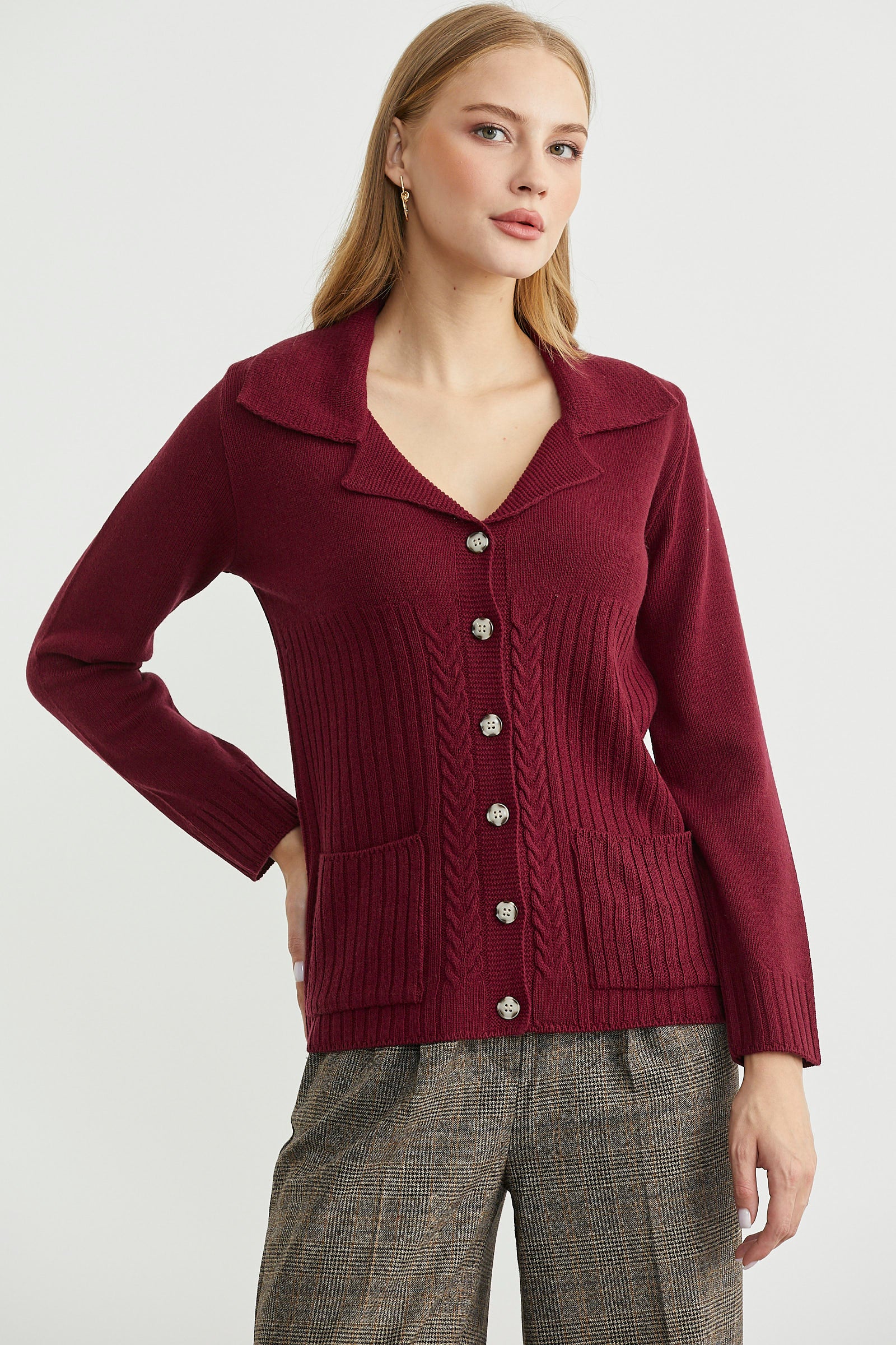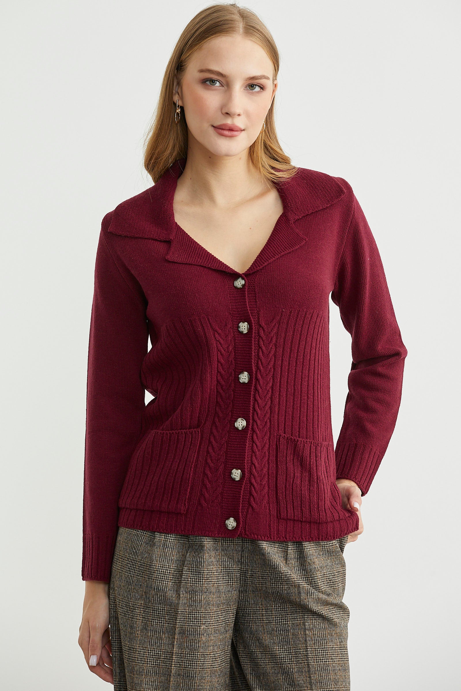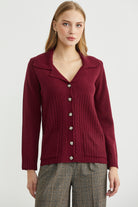 Yünlü Cepli Düğme Detaylı Triko Ceket - Bordo